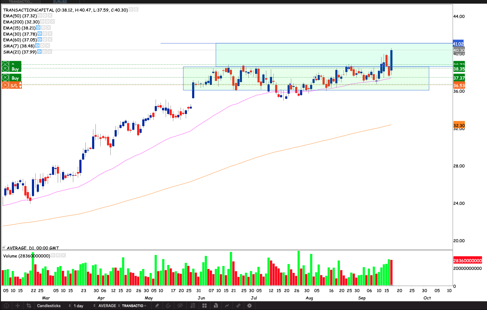 The stock got going again last week. The to entered the higher box on increased volume. Looking well poised for a short stay in the current R38 – R41 box. If the stock closes through R41 entering the higher box I will add to my position and raise my stop loss behind me