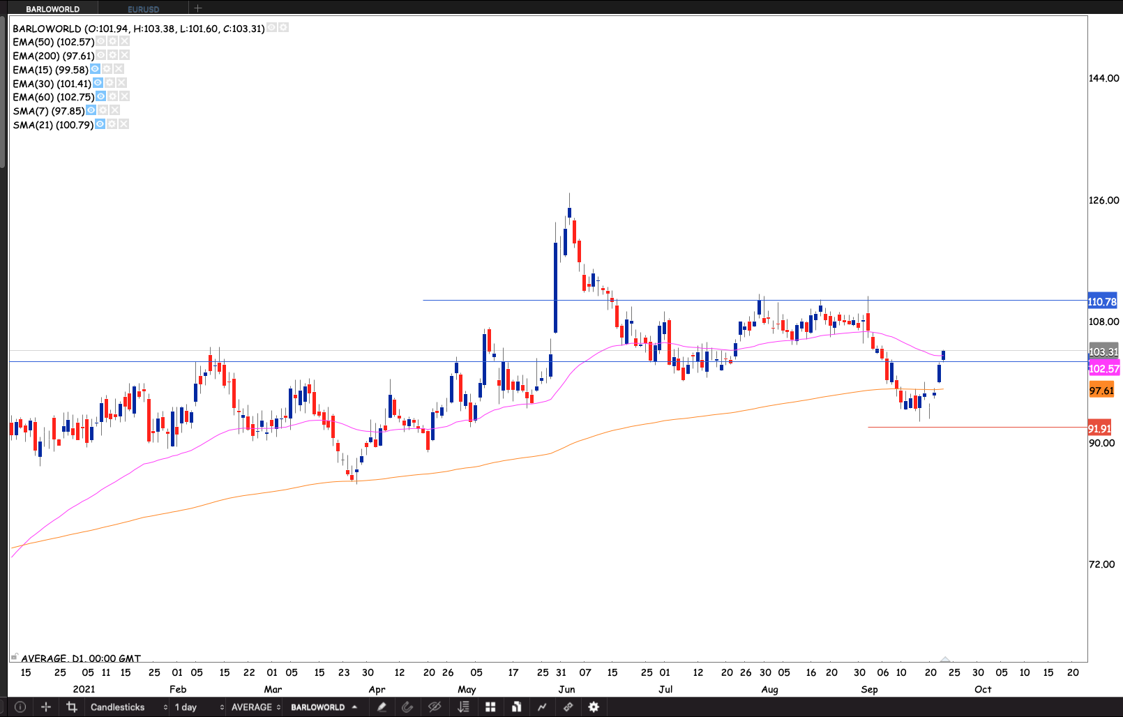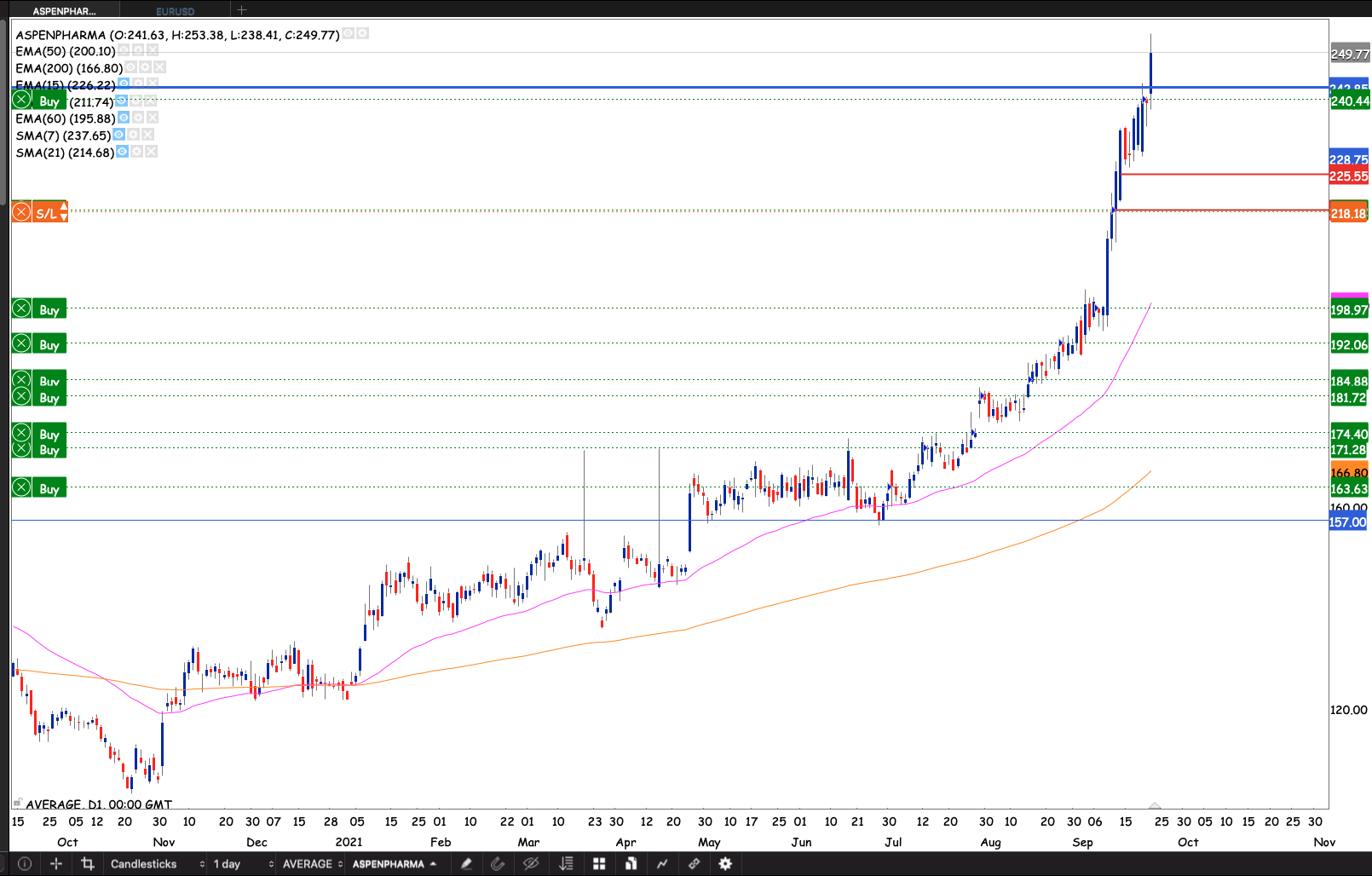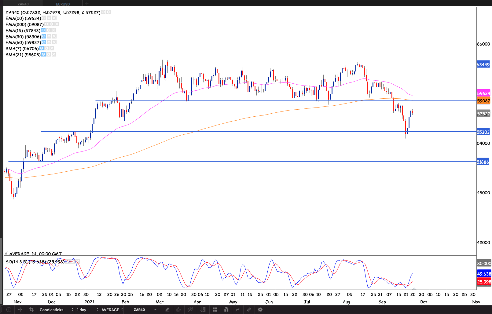 The stock broke the R240 level and ran into some selling at R250 since April 2021, but the stock held both the 50 & 200 day EMAs. The market remembered the R250 level again testing it on 16 September 2021. If we can close above the April 2019 close The doji that proved to be the undoing of the rally would then confirm the trade