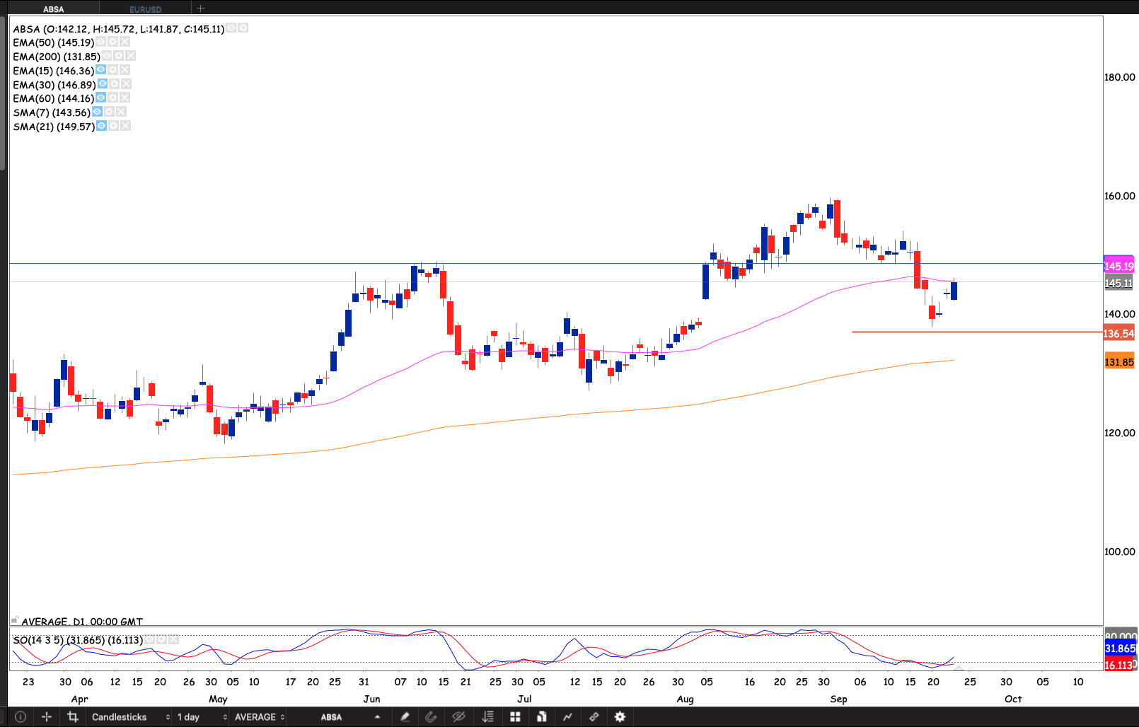 The stock sold off a bit after ex-div slipping below the 50 day EMA. Looks like the market has shaken off the ex-div price adjustments. The Thursday close was a bullish engulfing testing the 50 day EMA. There’s a resistance which used to be support at R145.20. I’m going to wait for a close through R145.20 to start rebuilding the position.