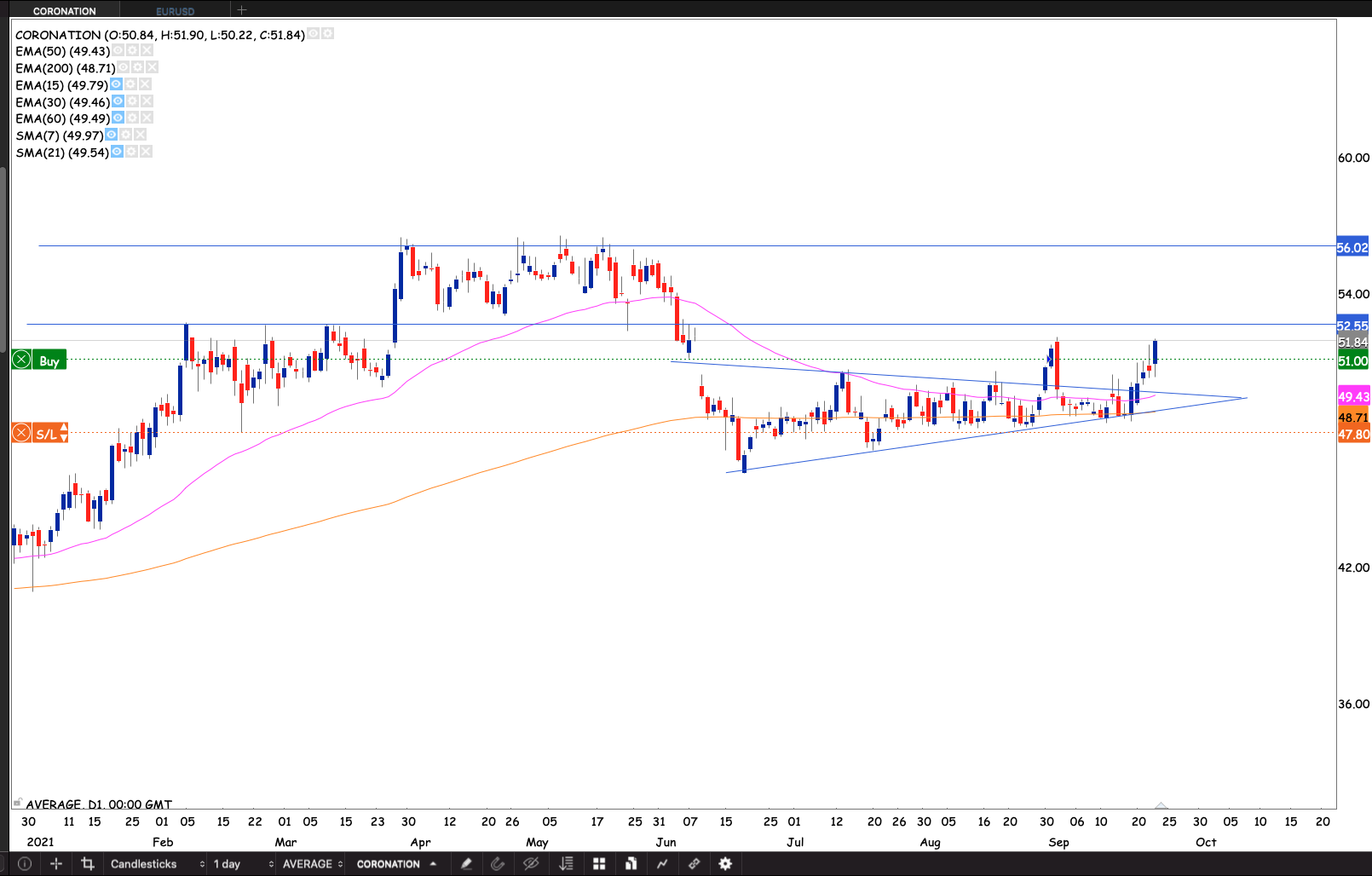The symmetrical triangle pattern that fails 2/3rds in turns to fail as a continuation breakout. It usually signals a reversal. That happens to be bullish for the Coronation as the stock holds the 200 day EMA as support. The stock did indeed break out in reverse. If the stock breaks above R52.55 I will add to my position.