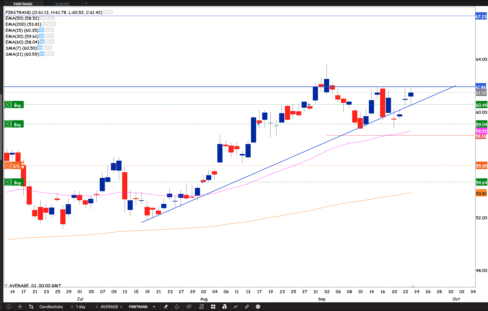 We have an ascending triangle pattern with the R62.83 being the top base. If the market closes through R61.80 I will raise my stop loss to R58.10 just below the 50 day EMA.