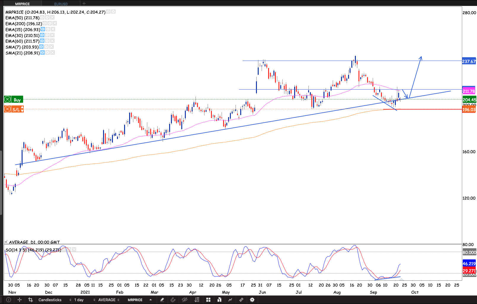 We had a bullish divergence as the stock came to test the uptrend support and holding the 200 day EMA. I started building up a position. When stock closes back through the 50 day EMA. I will add to the position. My goal is to still have my position when the stock breaks through R237.