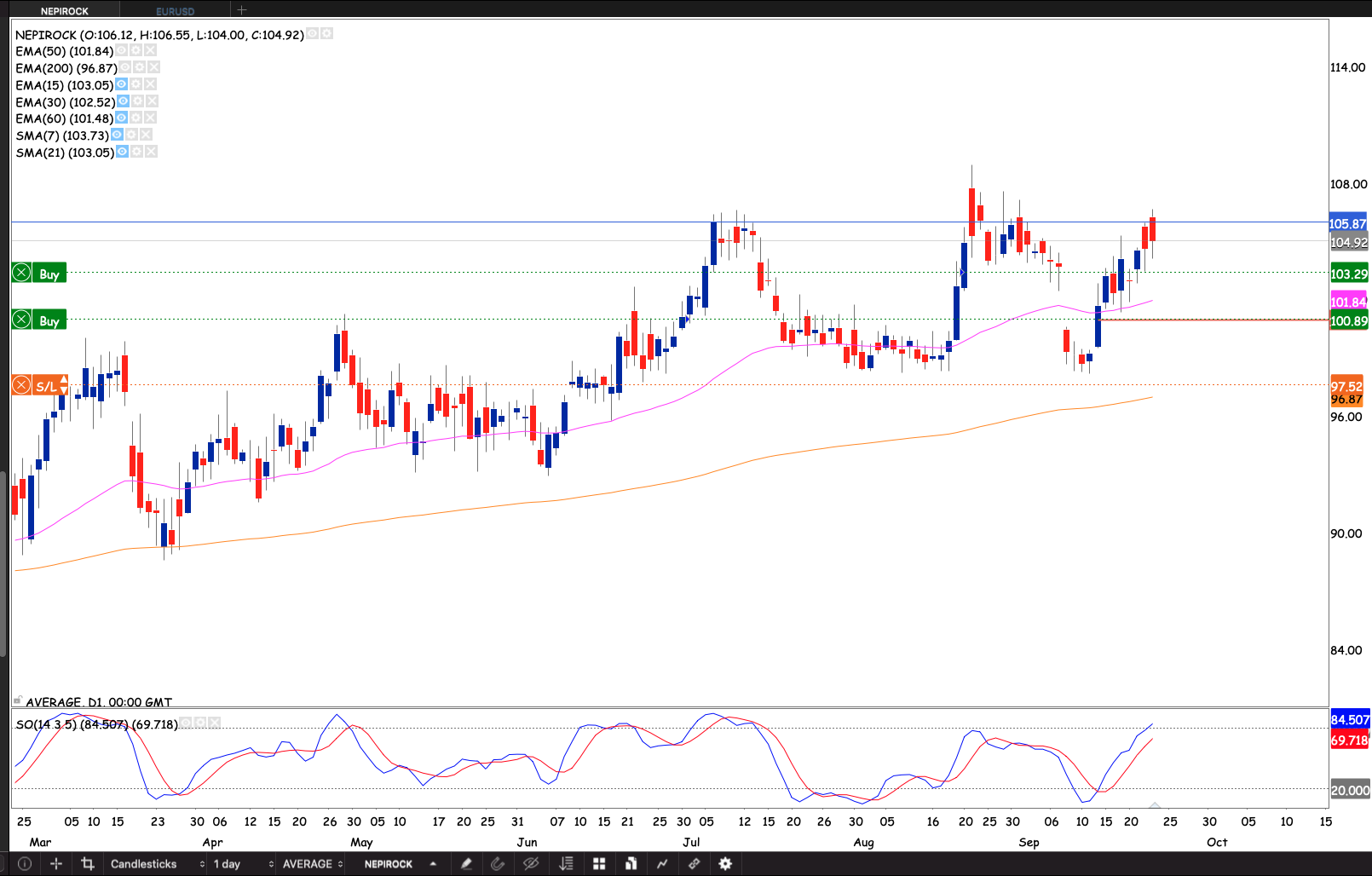 The stock keeps finding sellers at around the R105-R106 area. We a had a few intraday breakouts but closed the day back below the resistance. The last sell off was at ex-div. If the stock closes through R105.92 I will raise my stop loss to R100.80 just below the 50 day EMA.
