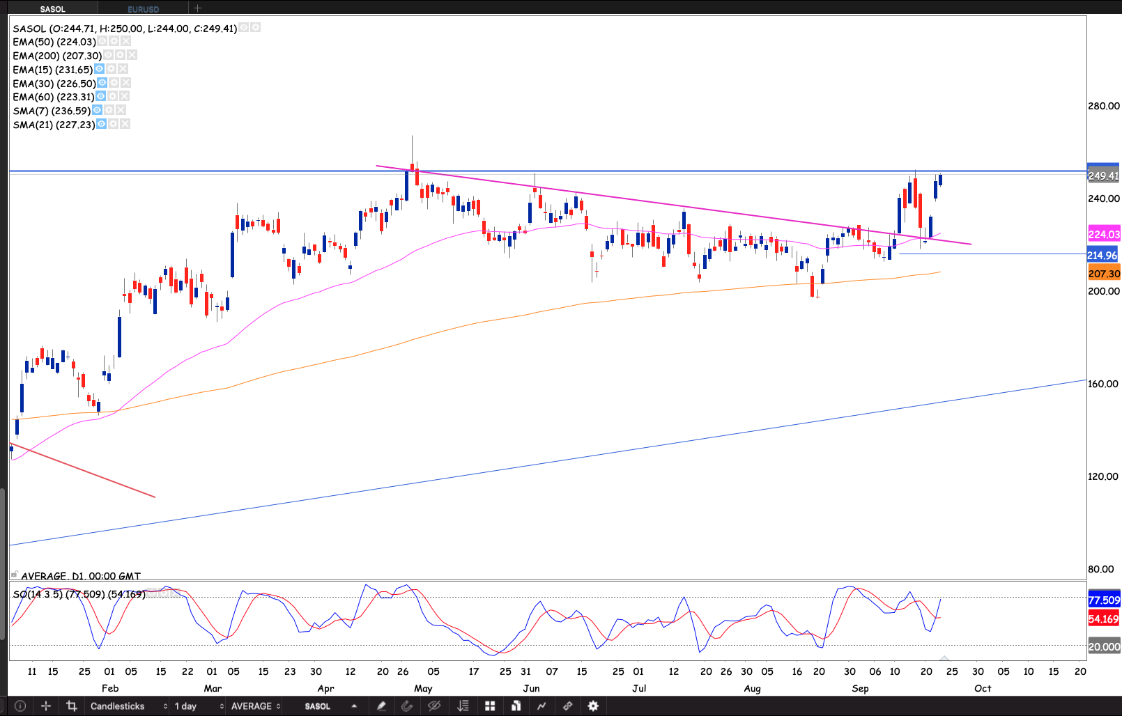 The R240 has been an area of strong support and memory in the past. The market didn’t have much respect for this level recently, only testing a few times and powering through closing on Friday at R249.77. I moved my stop loss to R218.18 raising my profit on the trade from up 15% to up 20%. I will be adding to my position. Putting on a 3% risk because the profit on this trade is now sitting at +20%