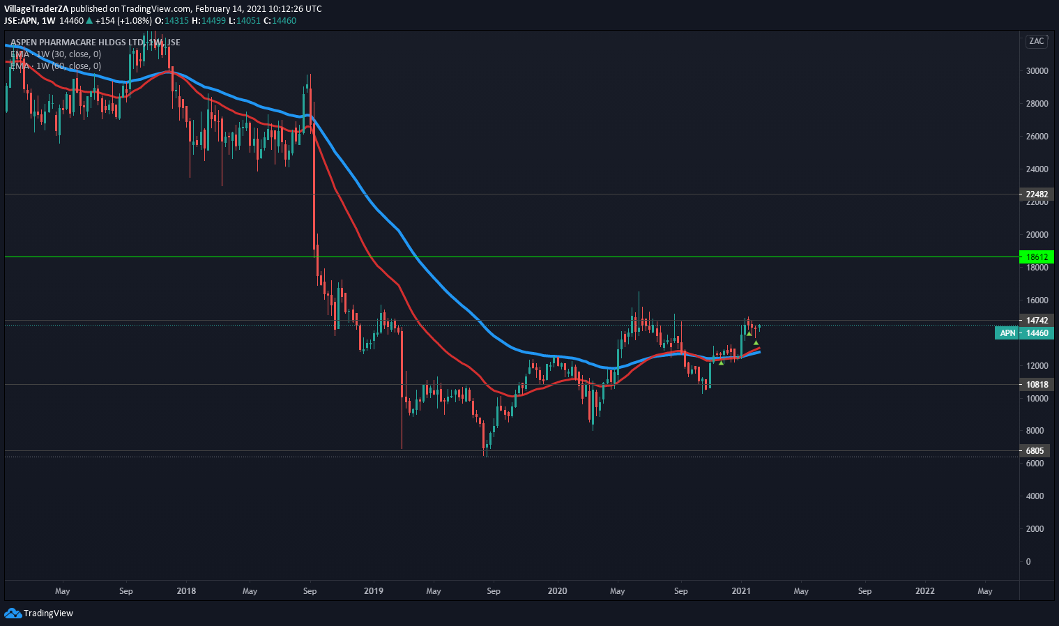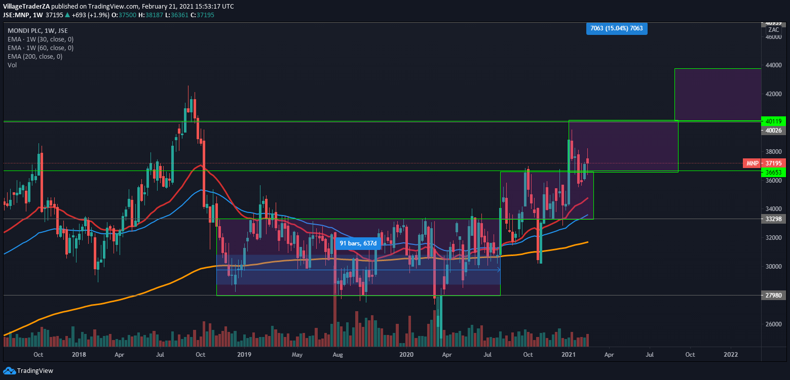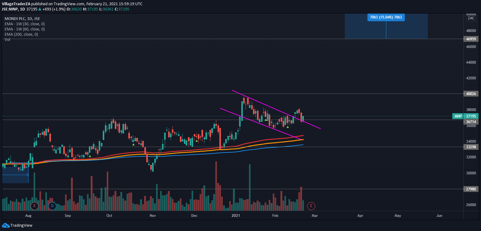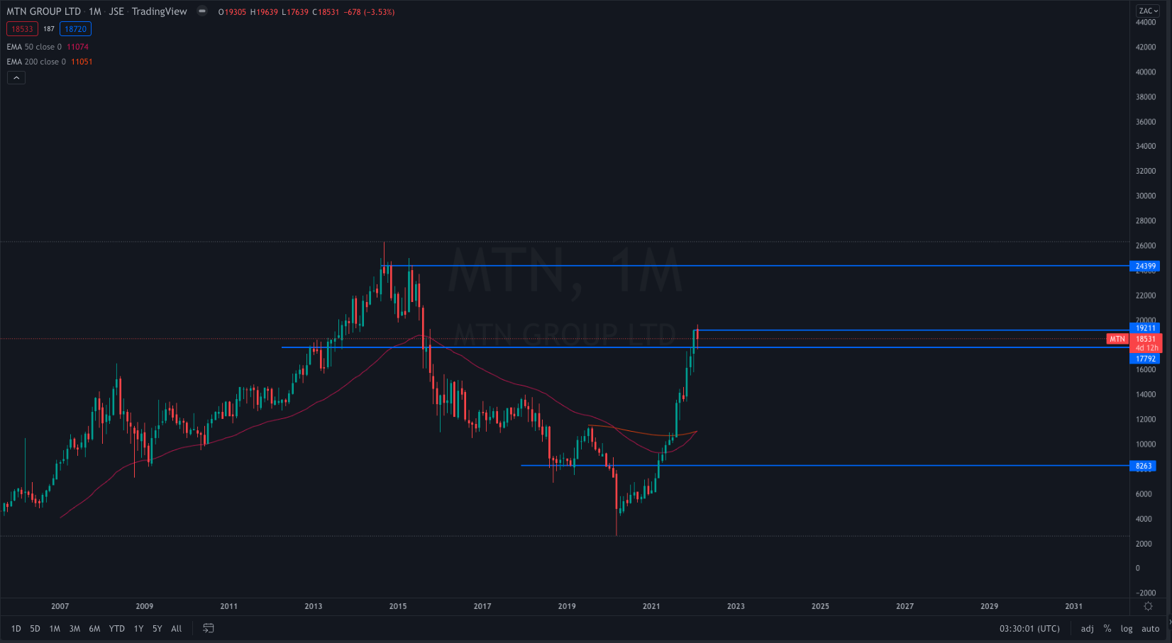 The MTN stock has had a strong run up post the COVID-19 crash in 2020. Smoothly making higher highs and higher lows. The MTN March 2020 lows can’t only be put on the heels of the COVID-19 crash. They had other issues they were battling with, particularly with the Nigerian government. That relationship seems to be behind them now, the listing of MTN nigeria seems to have certainly been helpful.