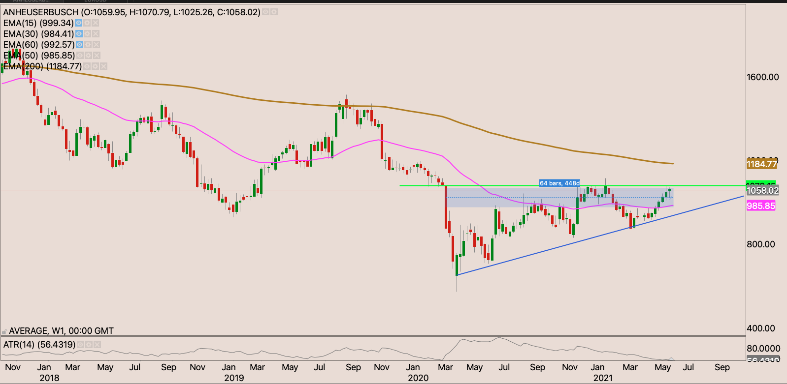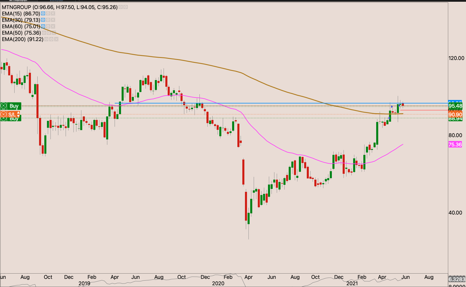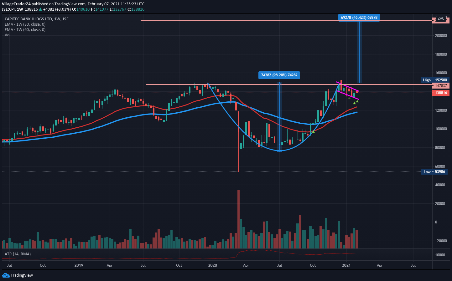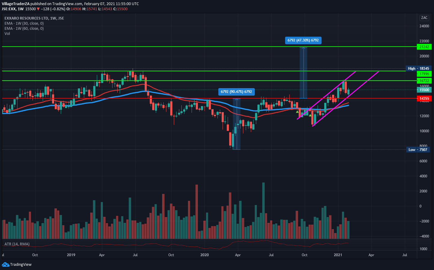 The MTN stock has had a strong run up post the COVID-19 crash in 2020. Smoothly making higher highs and higher lows. The MTN March 2020 lows can’t only be put on the heels of the COVID-19 crash. They had other issues they were battling with, particularly with the Nigerian government. That relationship seems to be behind them now, the listing of MTN nigeria seems to have certainly been helpful.