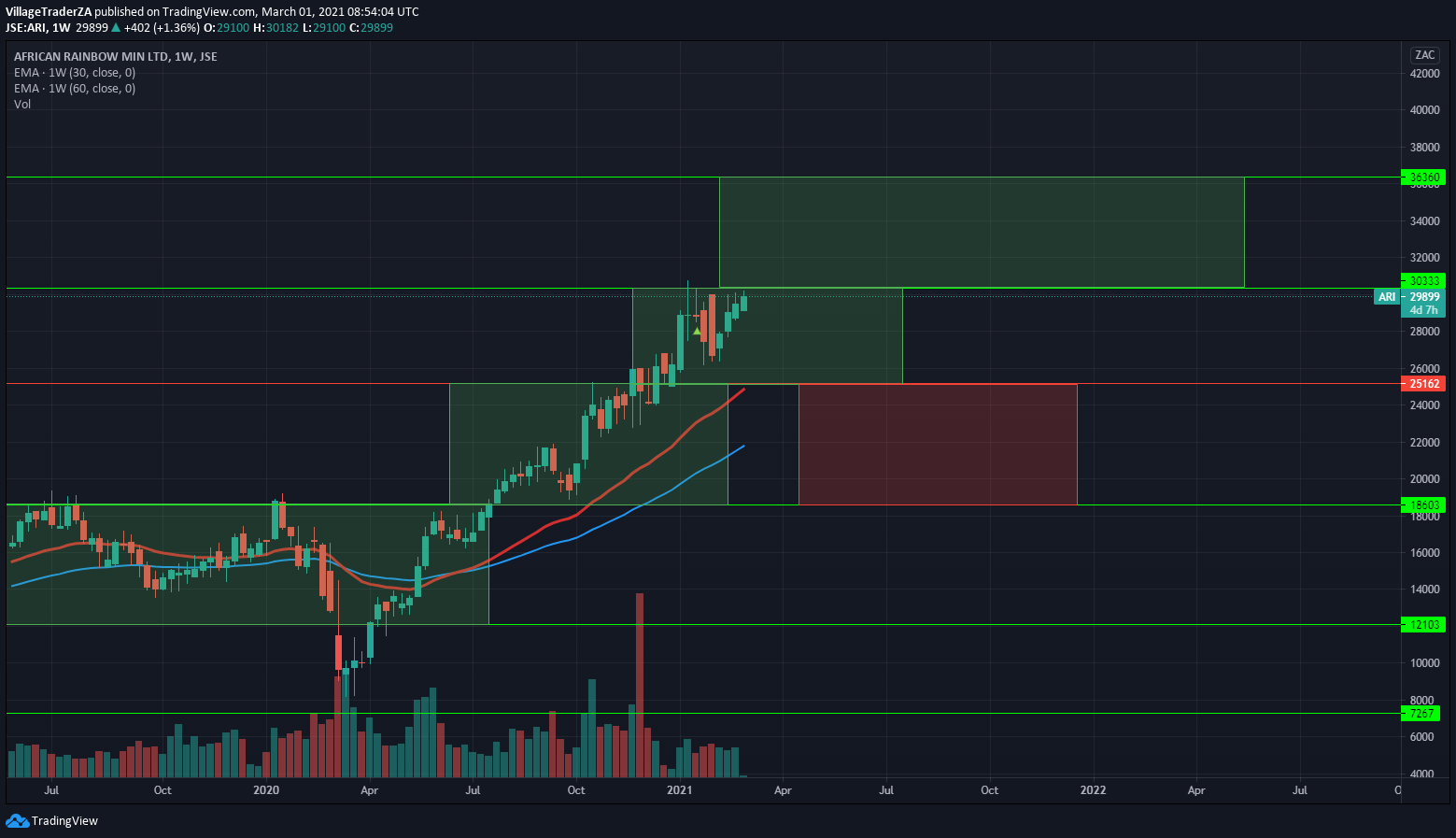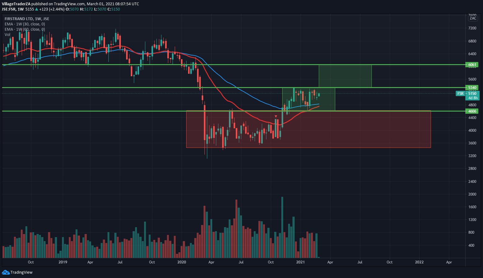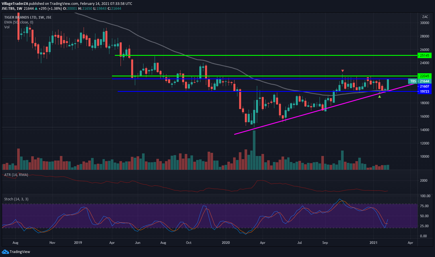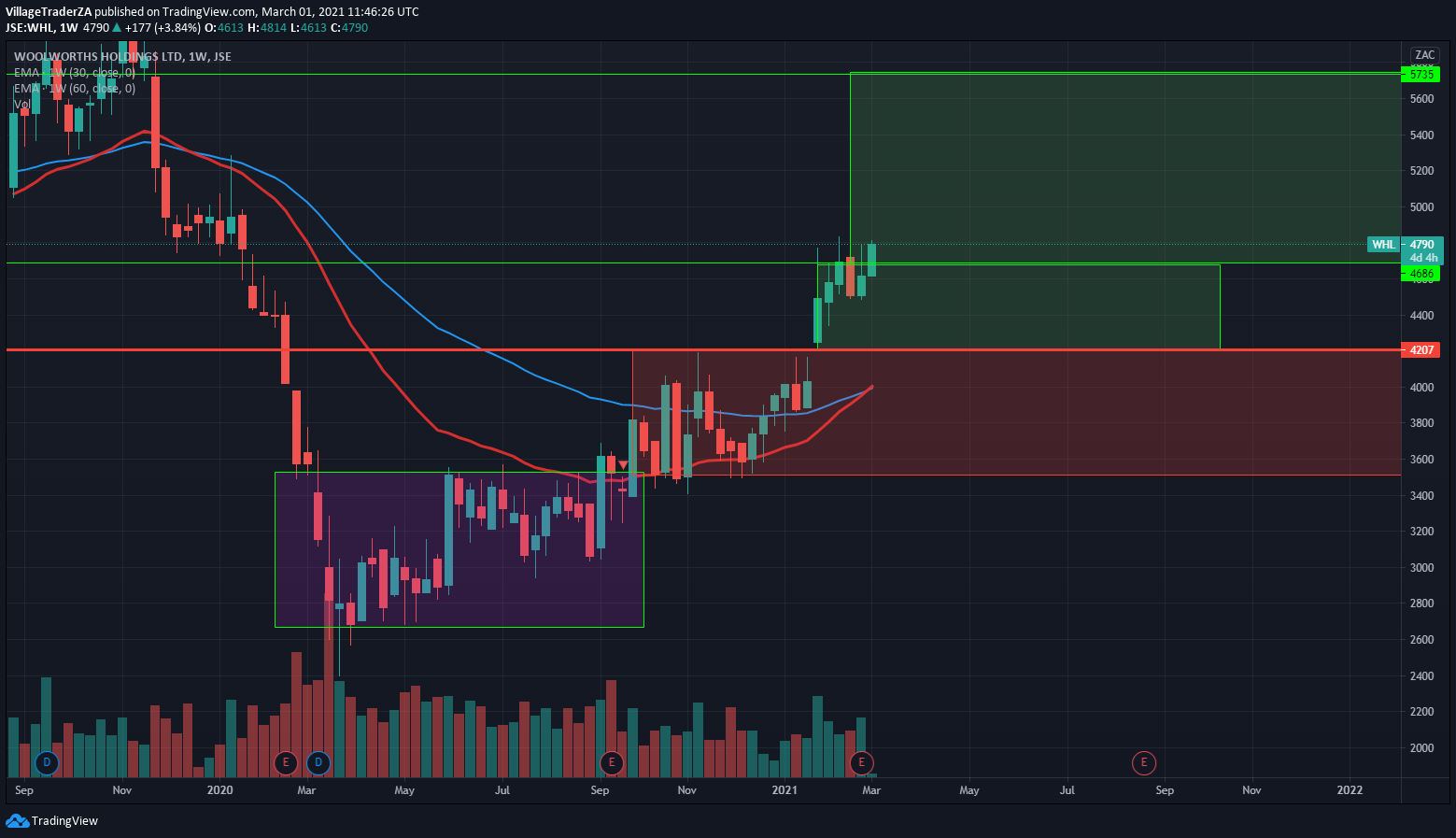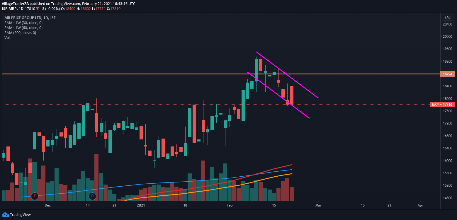 The stock got sold off quite a bit down to the 50-day EMA, and it held strongly. Now I’m waiting for a close through R668.85 to start building a position. I expect the stock to have some reaction at R730 & R790. I will be looking for places to hide my stop and perhaps add to the position, but for now I wait.
