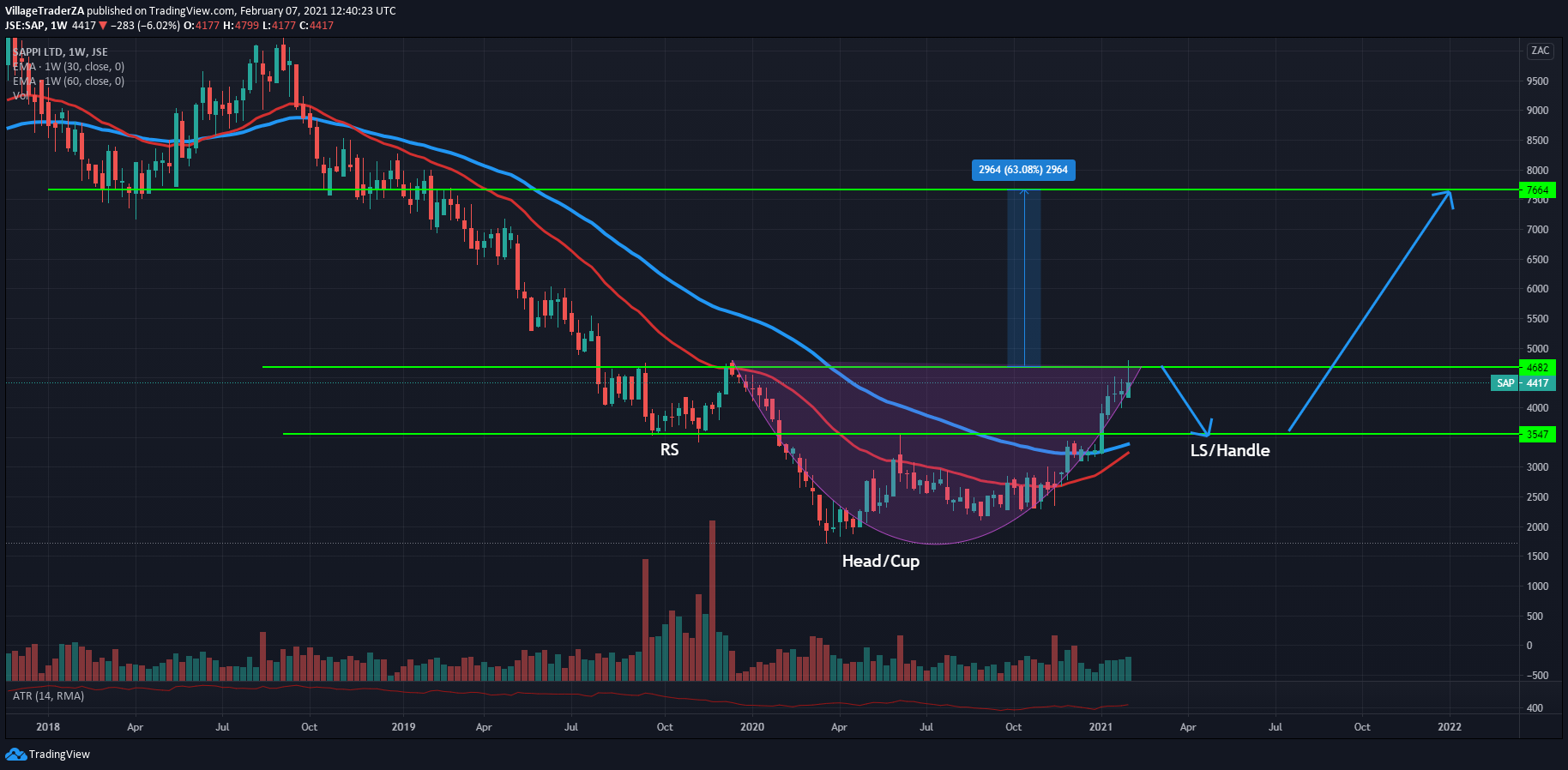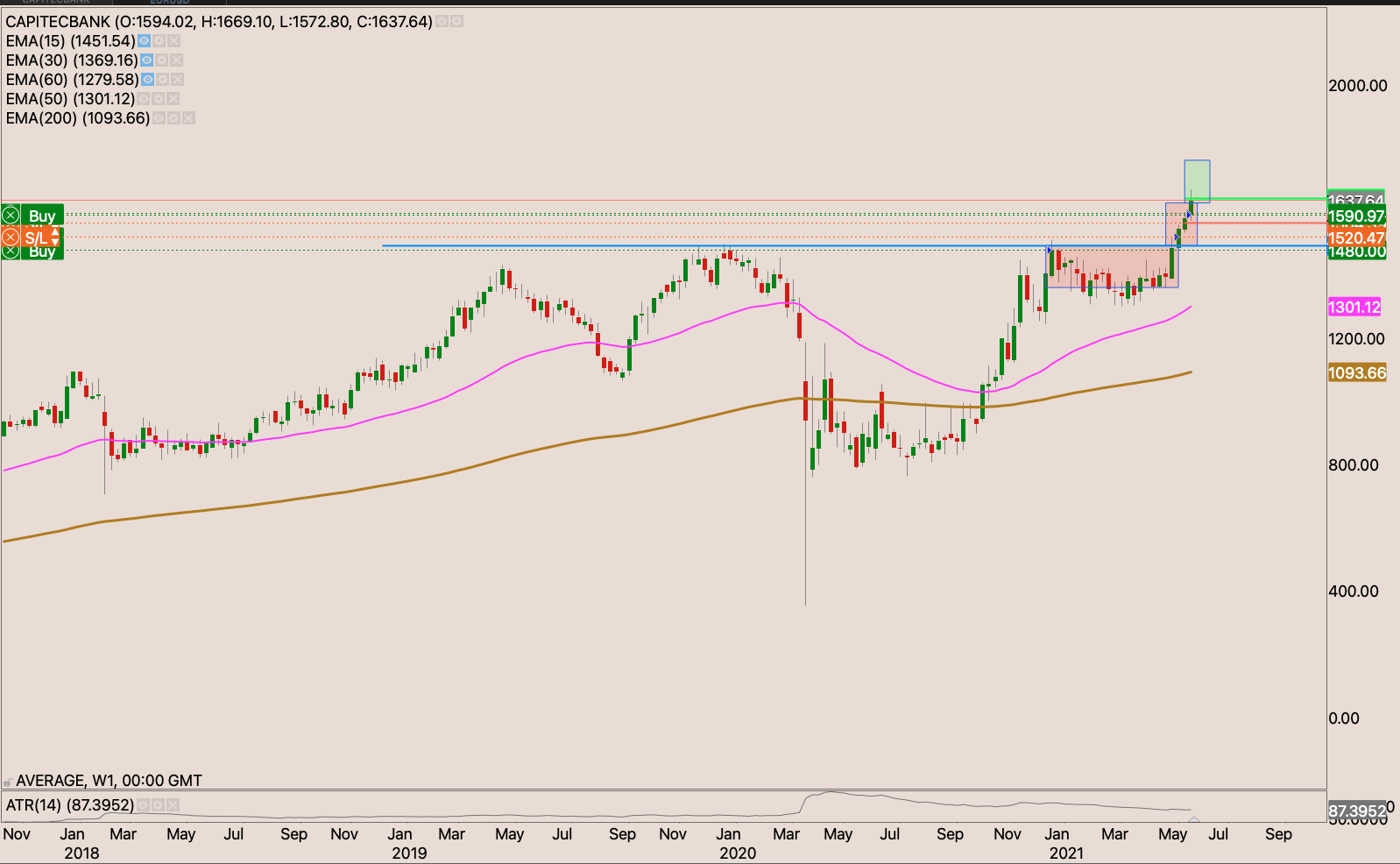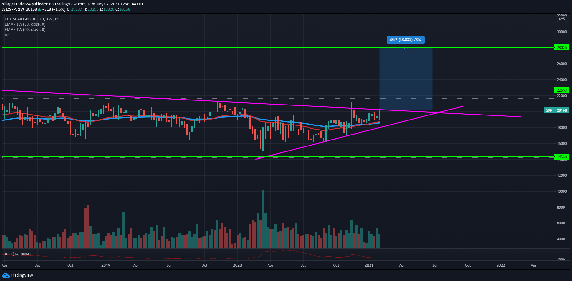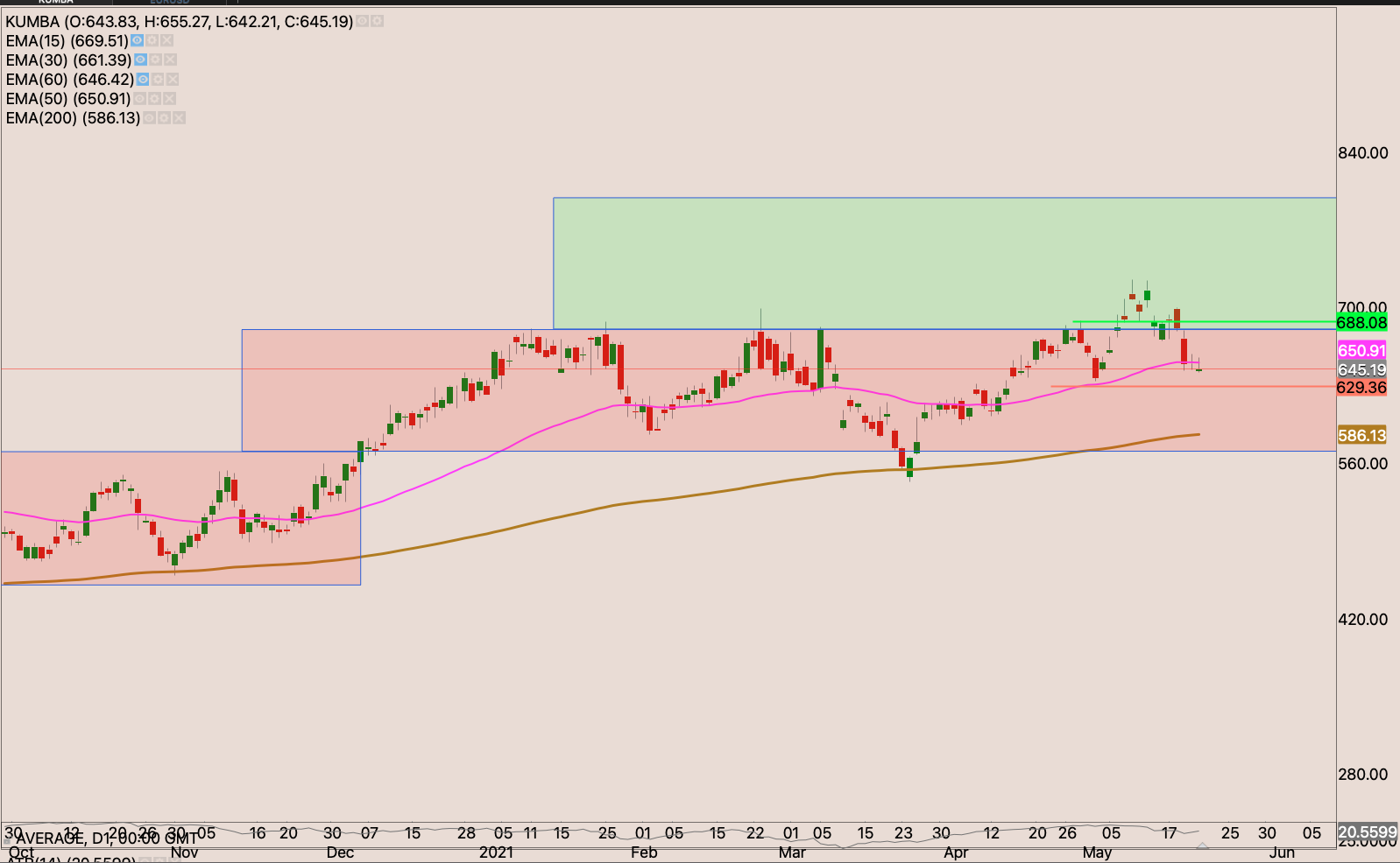 The stock got sold off quite a bit down to the 50-day EMA, and it held strongly. Now I’m waiting for a close through R668.85 to start building a position. I expect the stock to have some reaction at R730 & R790. I will be looking for places to hide my stop and perhaps add to the position, but for now I wait.