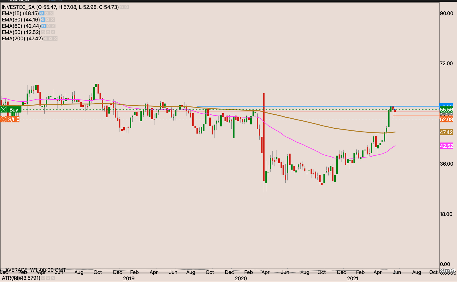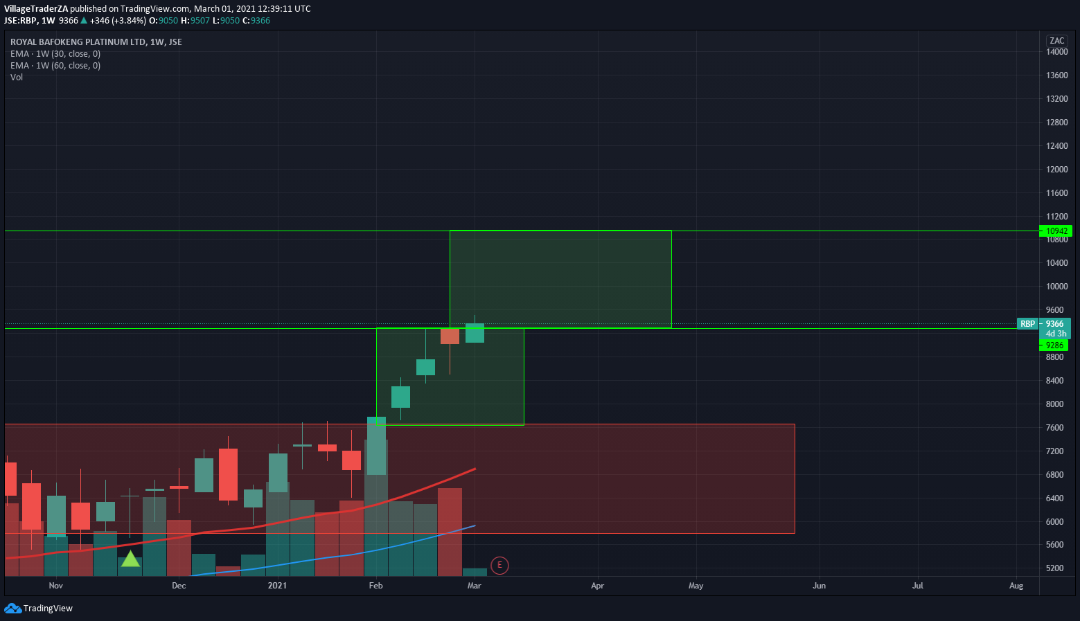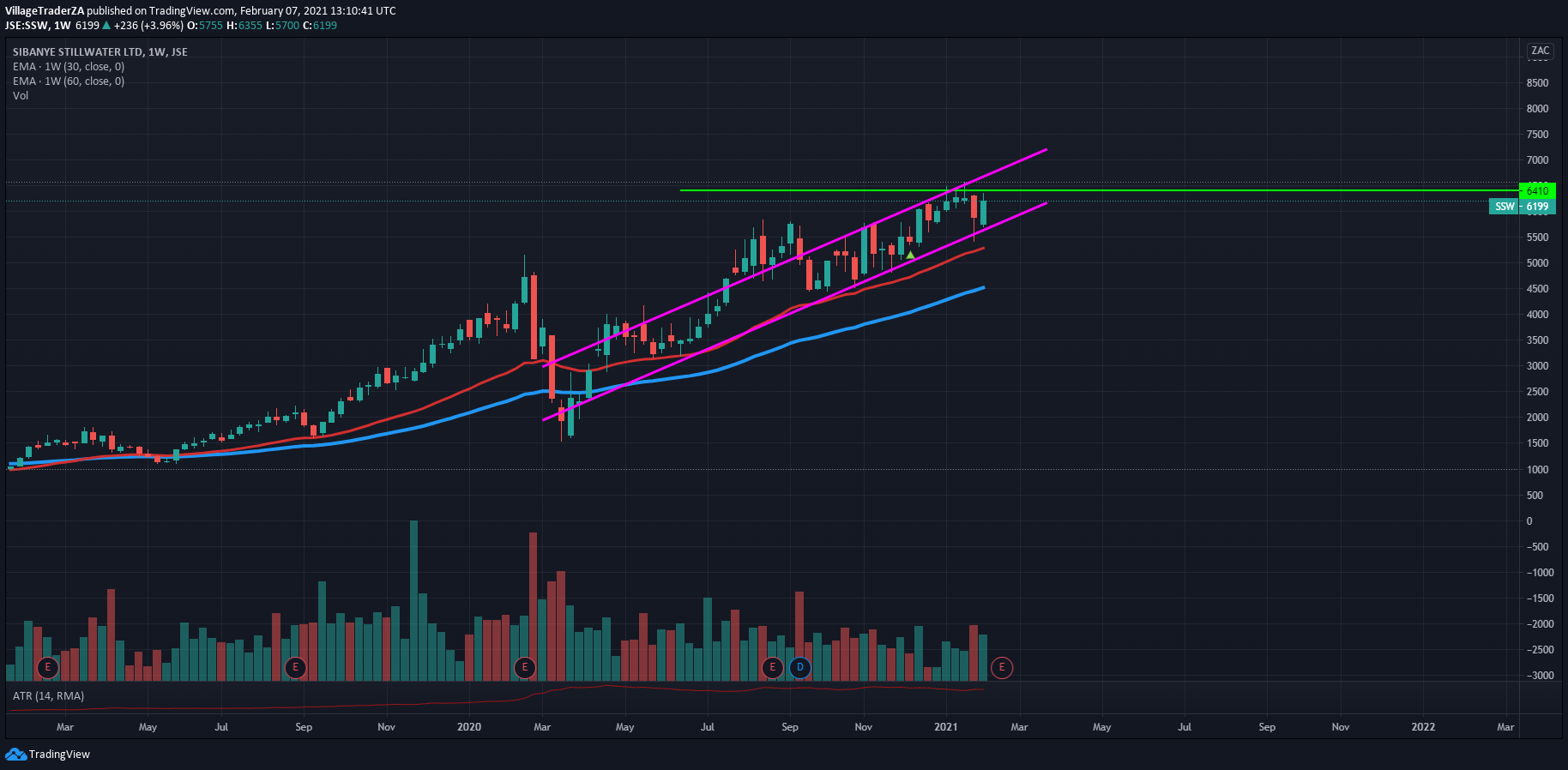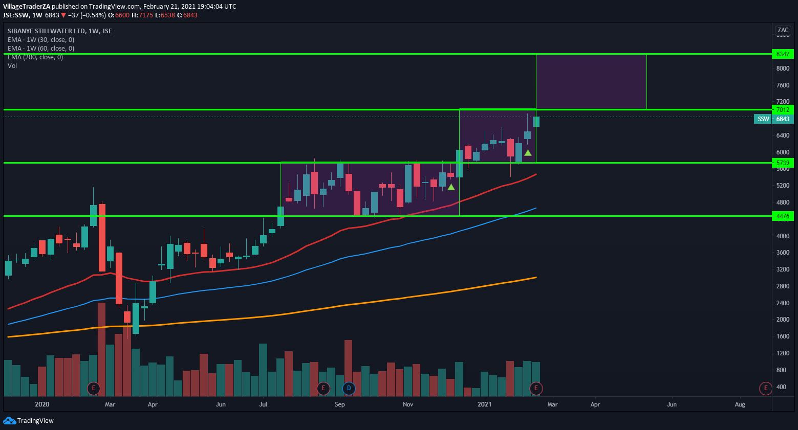 Sibanye came with strong interim results. Increased earnings and declared a dividend. Trading at 6-7x PE ratio. With rising platinum and gold price. The company will likely sell in rising price. The stock looks quite cheap indeed. I’m waiting for last Wednesday’s doji which was then engulfed on Thursday to be invalidated with a close above R76.45 to look for a higher place to hide my stop loss perhaps just below the 50-day EMA around R60.40