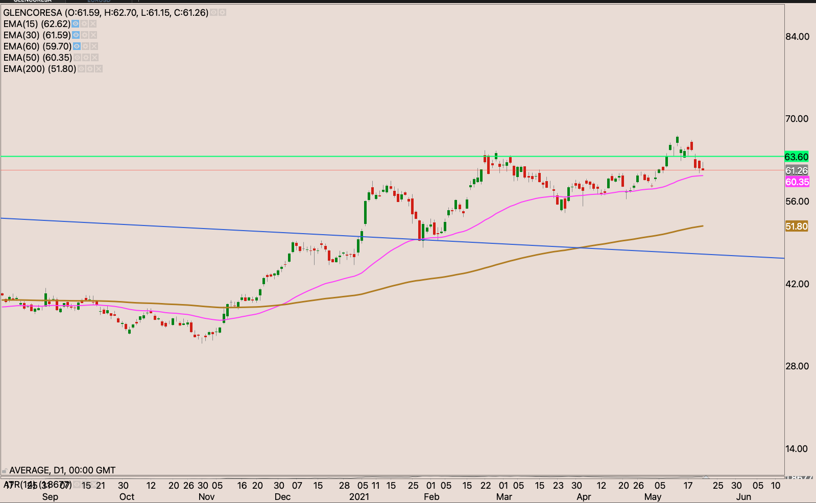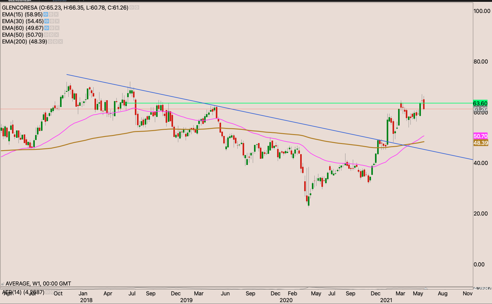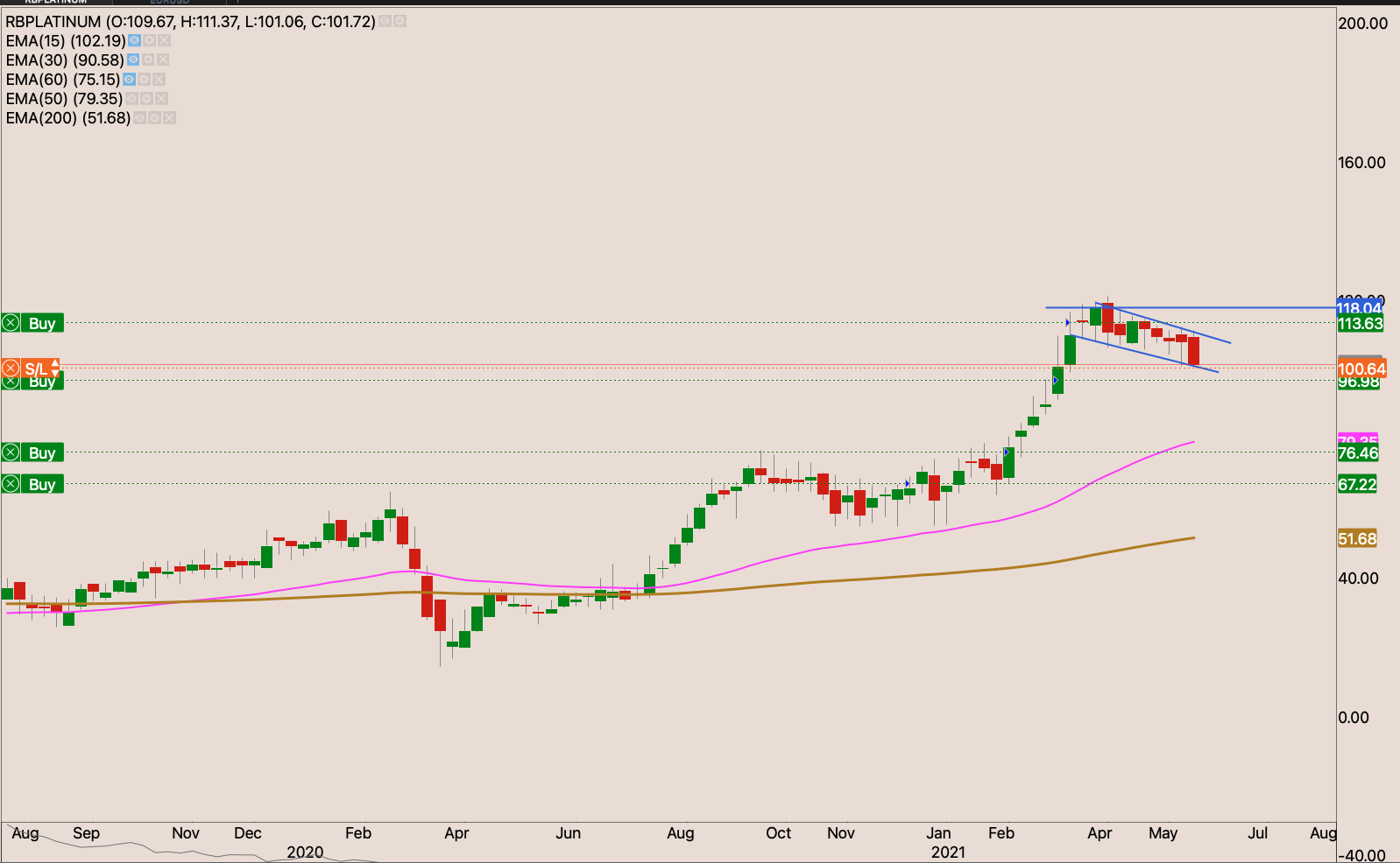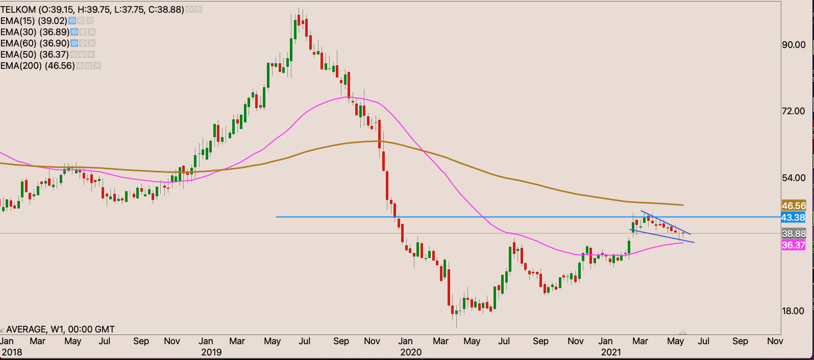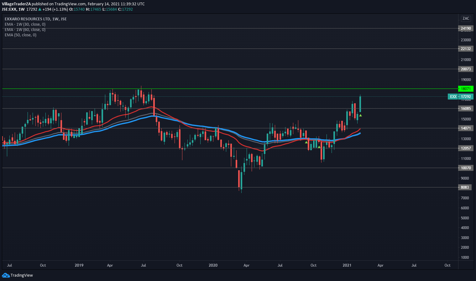 Sibanye came with strong interim results. Increased earnings and declared a dividend. Trading at 6-7x PE ratio. With rising platinum and gold price. The company will likely sell in rising price. The stock looks quite cheap indeed. I’m waiting for last Wednesday’s doji which was then engulfed on Thursday to be invalidated with a close above R76.45 to look for a higher place to hide my stop loss perhaps just below the 50-day EMA around R60.40