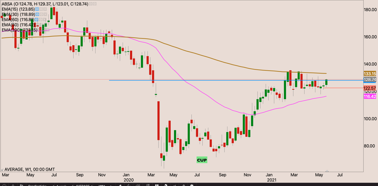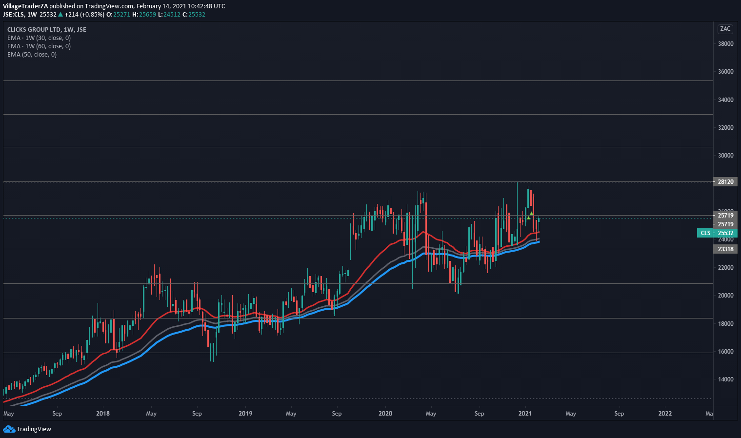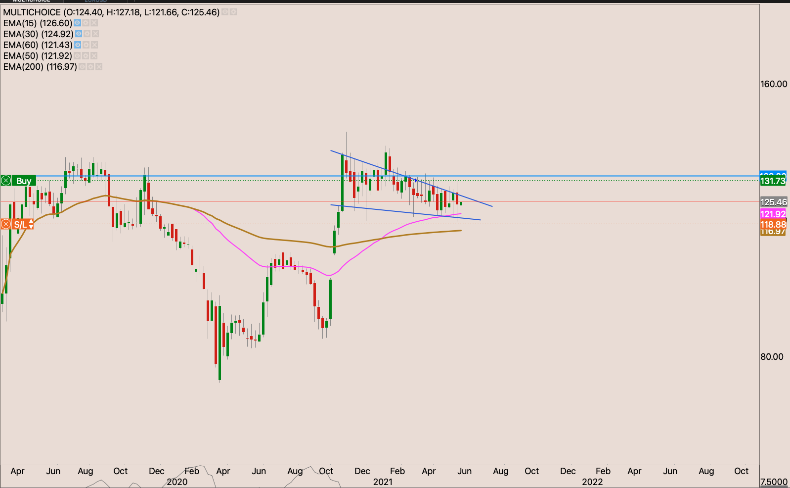 The stock had a -10% correction to the 50 day EMA repelling from it almost as if they were magnets both showing each other the same magnetic pole. If the stock breaks above R133.65 making a new 52 week high close. I will raise my stop loss to R118.20 and add to the position.