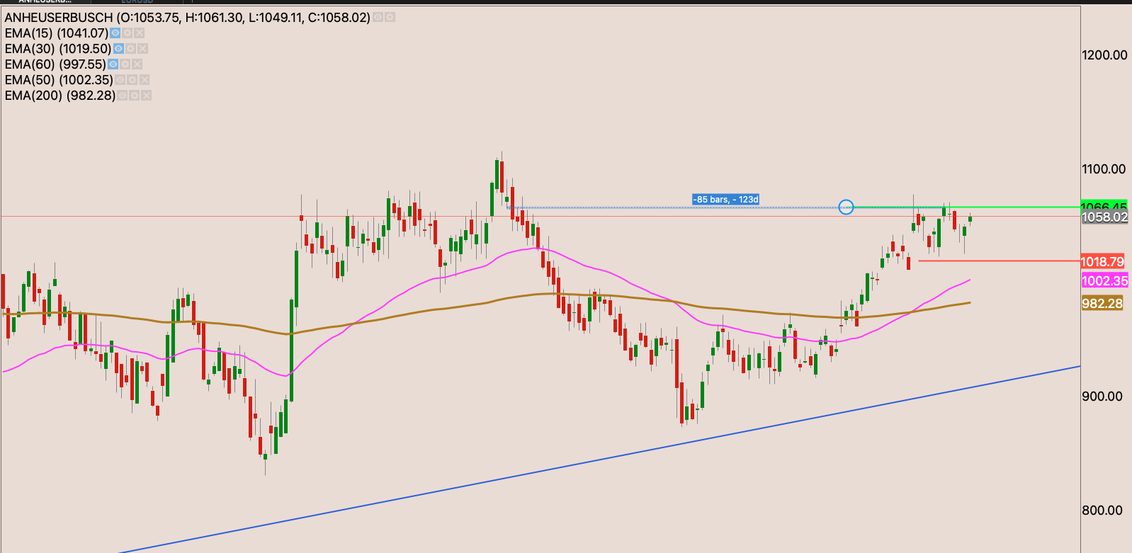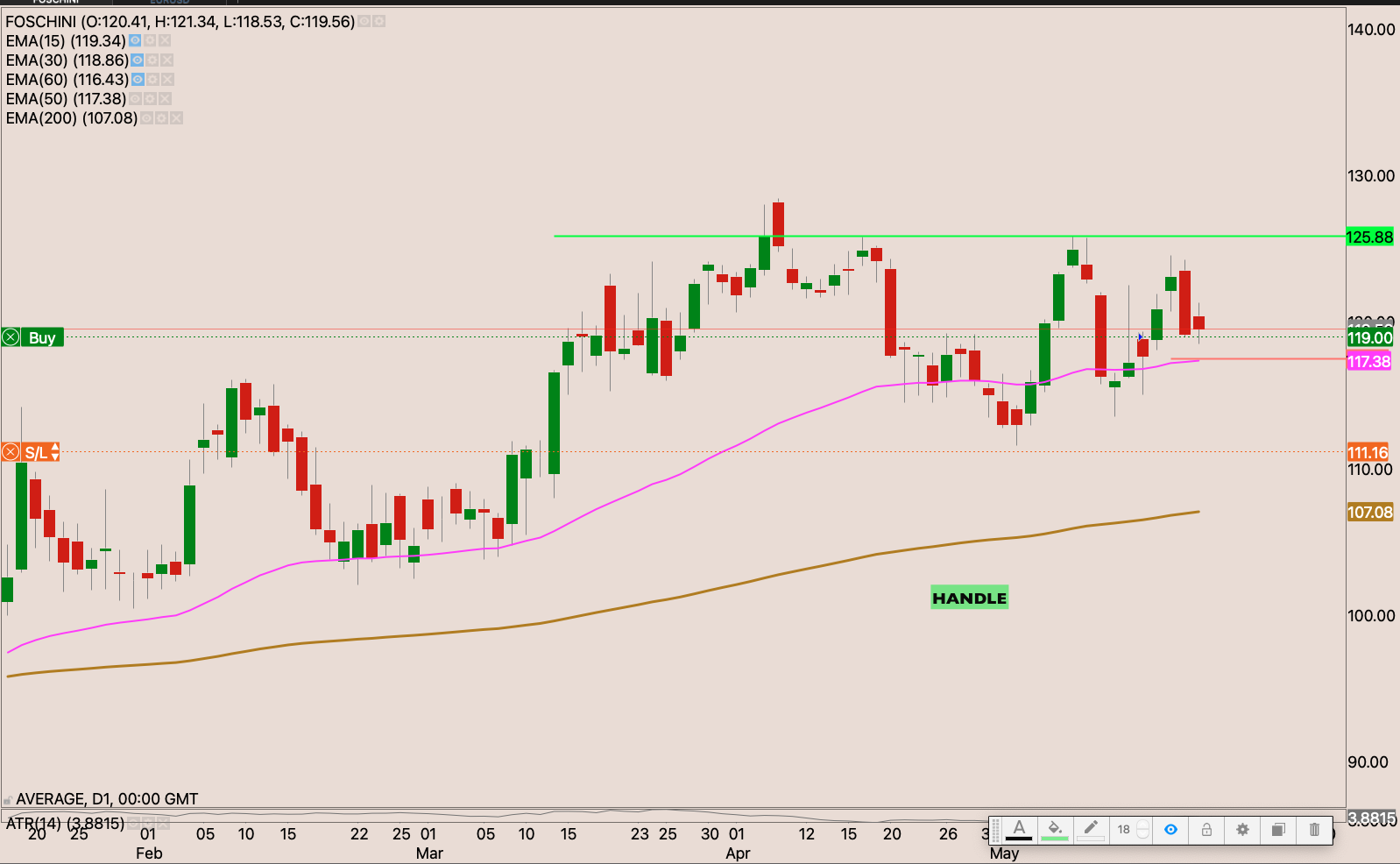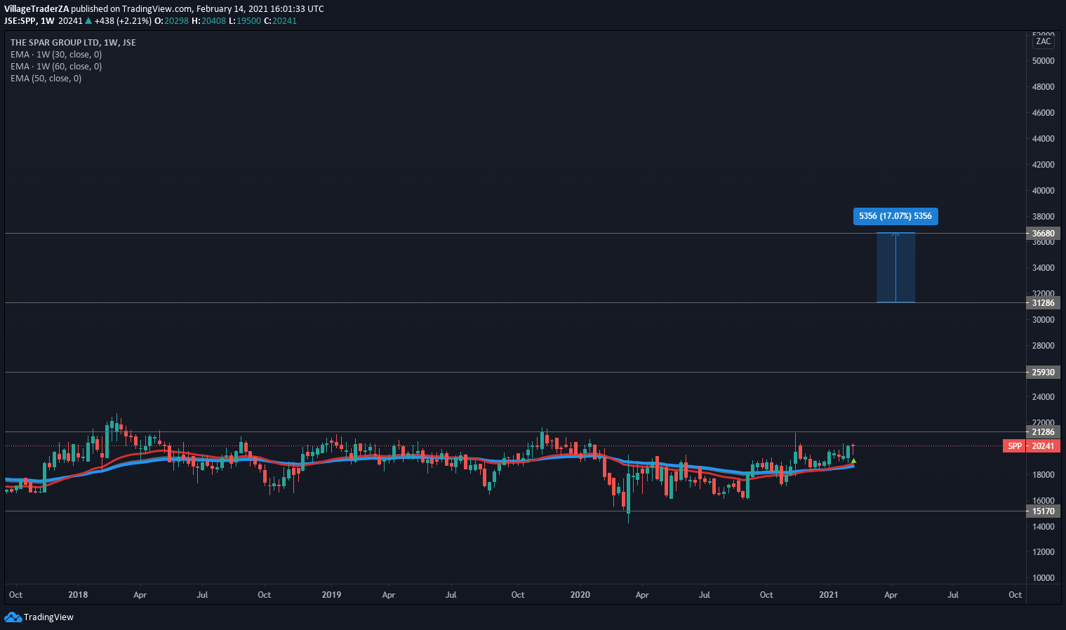 The stock had a -10% correction to the 50 day EMA repelling from it almost as if they were magnets both showing each other the same magnetic pole. If the stock breaks above R133.65 making a new 52 week high close. I will raise my stop loss to R118.20 and add to the position.