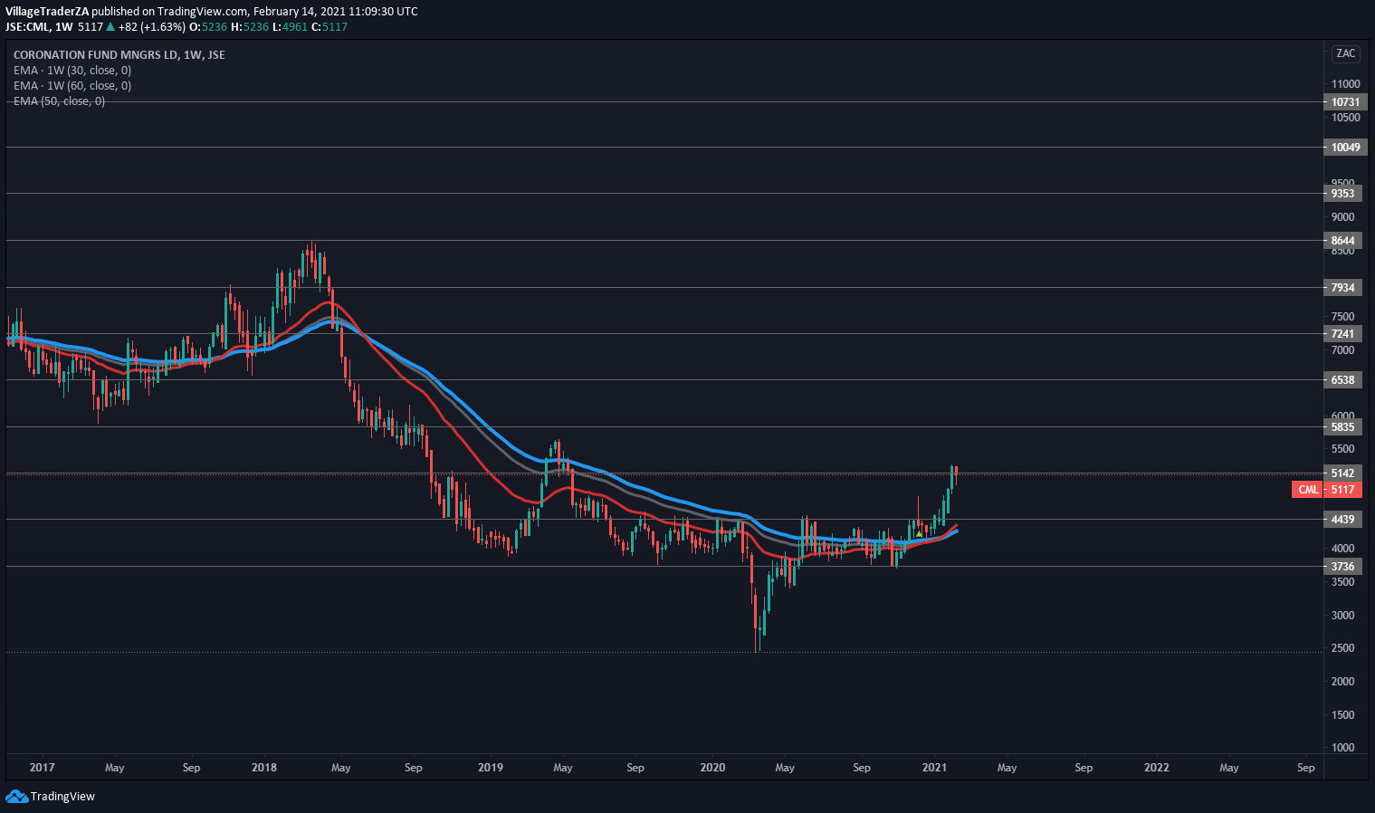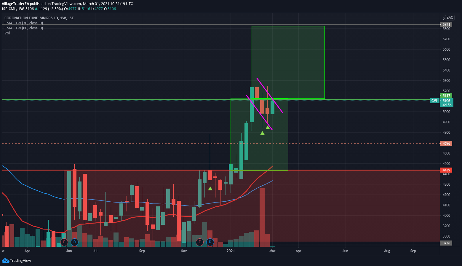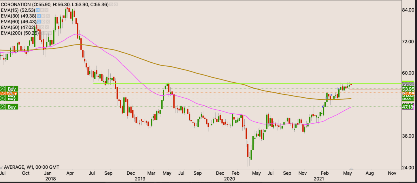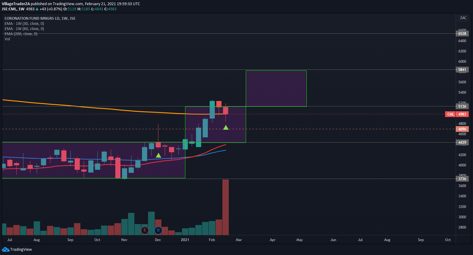 The symmetrical triangle pattern that fails 2/3rds in turns to fail as a continuation breakout. It usually signals a reversal. That happens to be bullish for the Coronation as the stock holds the 200 day EMA as support.