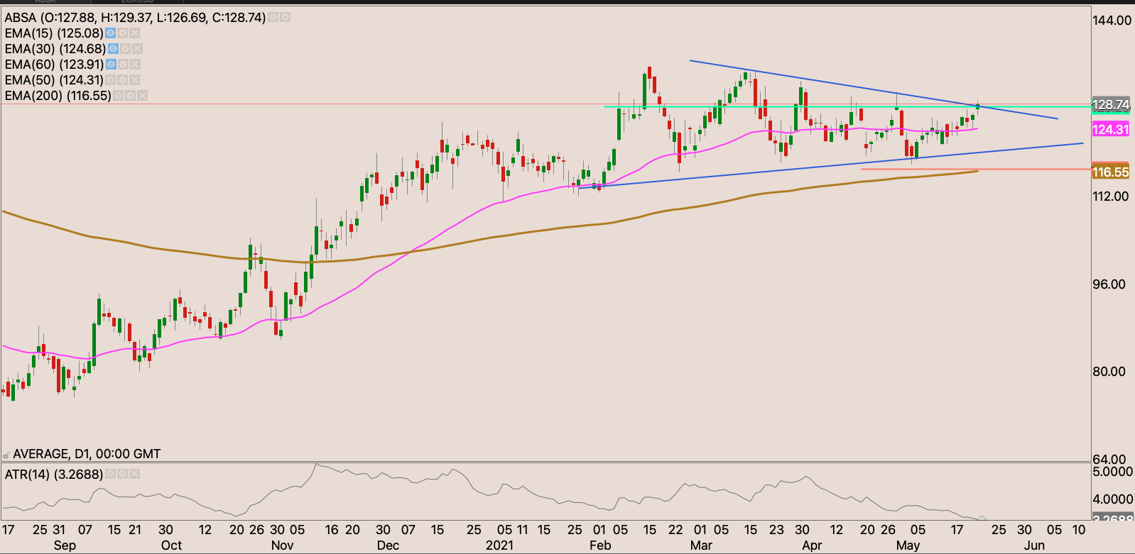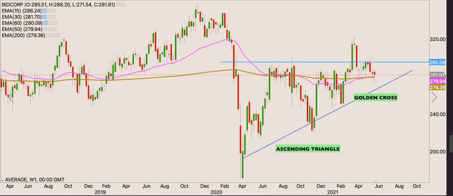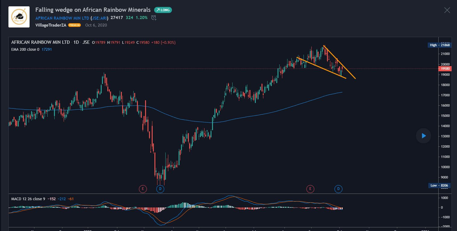 We have a nice ascending triangle pattern on the stock, the stock now back above the 50 day EMA. I will start building my position from above R20, however the level that will be of great significance will be the R208 level. We’ll see the stock really start to run if it can close through the R208 level.