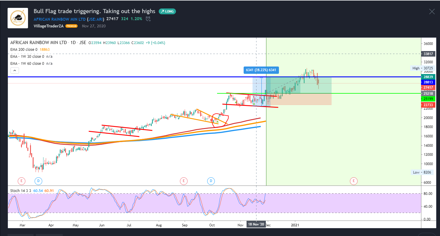 I got stopped earlier this month on this trade as the stock violated the 50 day EMA. The stock found some support at the 200 day EMA after a -10% correction. The stock is now back above the 50 day EMA. I will however wait for a close above R319.50 the high close from March this year. To rebuild my position with an initial stop loss at R298.40 just below the 200 day EMA