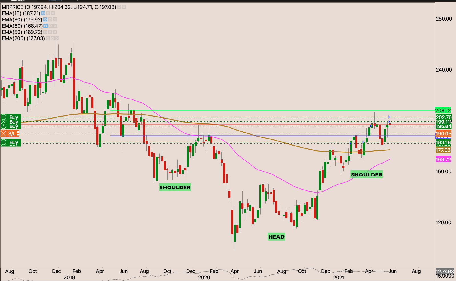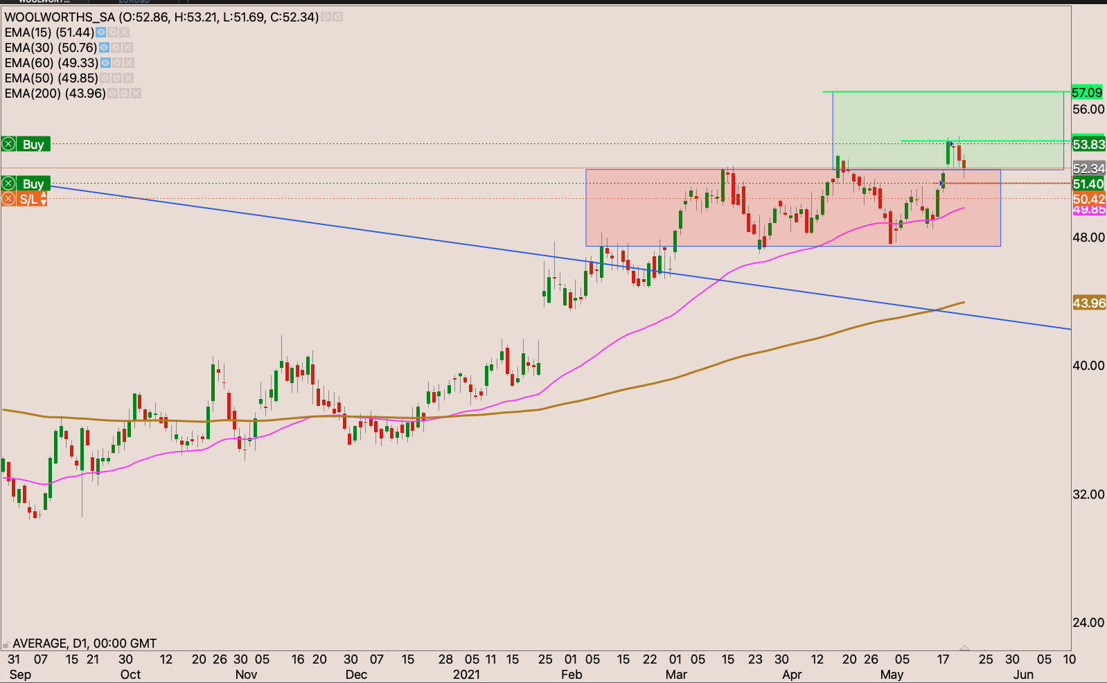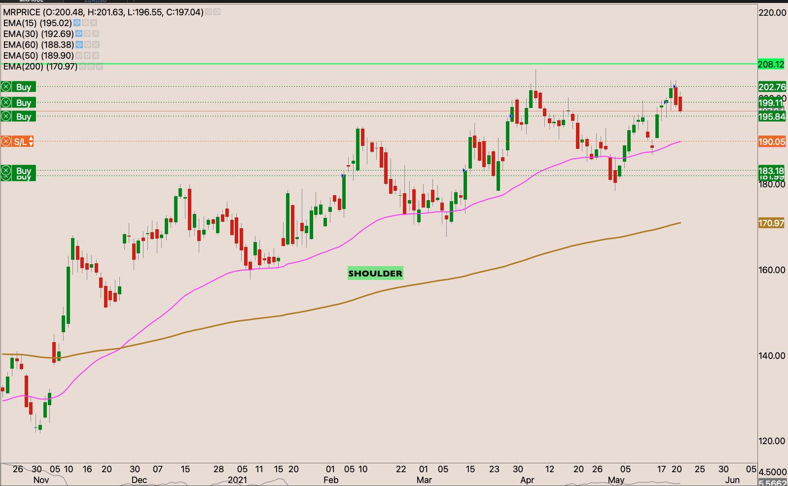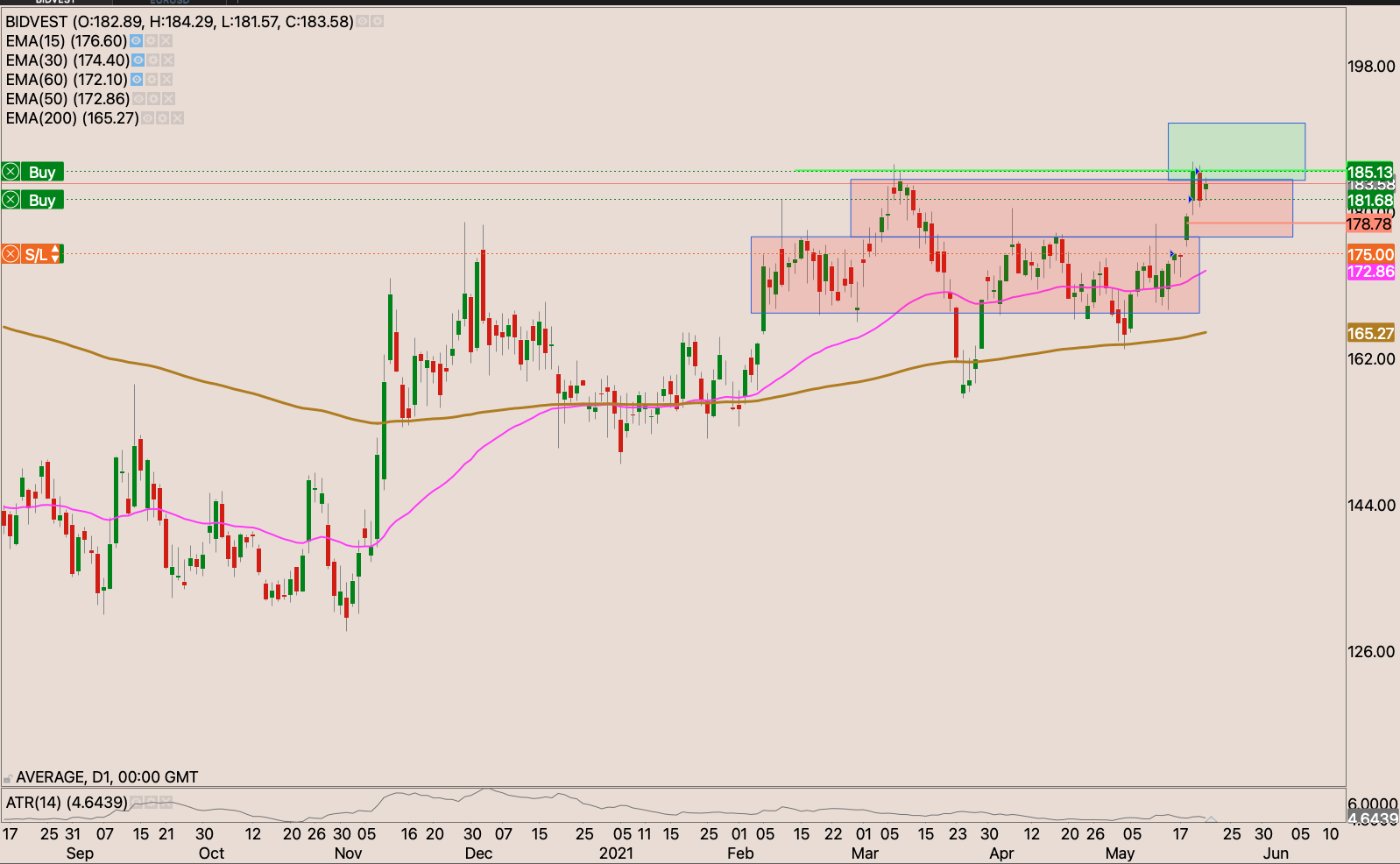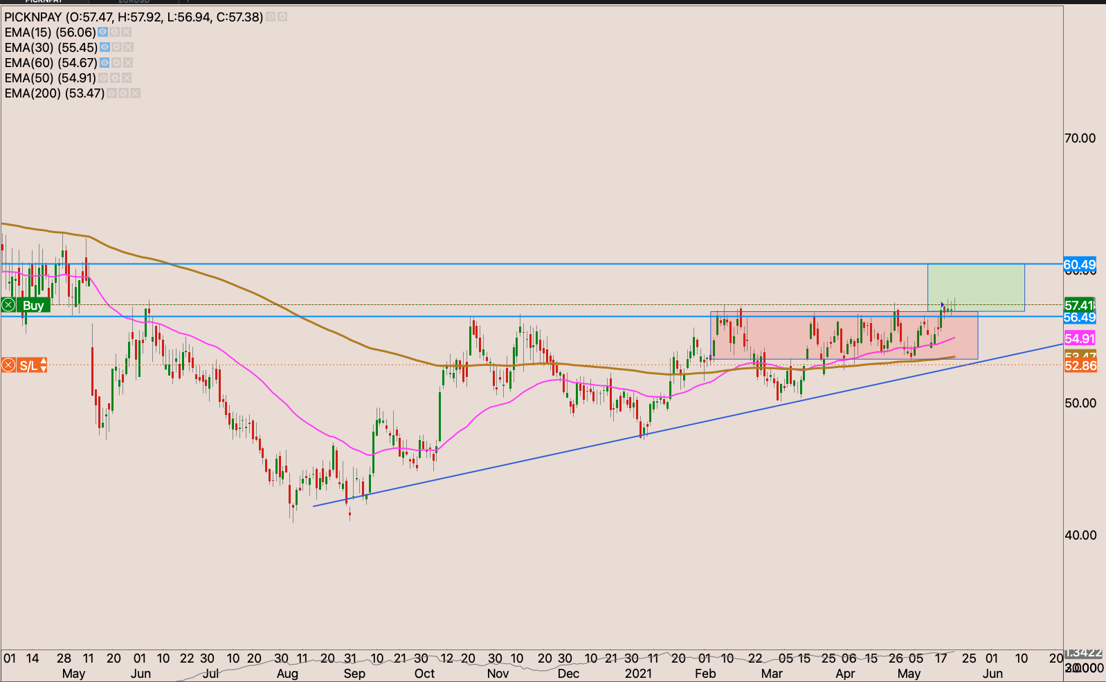 The stock has been moving to higher boxes I held off in adding to my position when I raised my stop loss to R183.32 though my stop loss is a break even. I eexpect the market to rested the R197 resistance. But if the current base holds up. I will raise my stop loss to just below the gap and drive candle to R200, and add to the position
