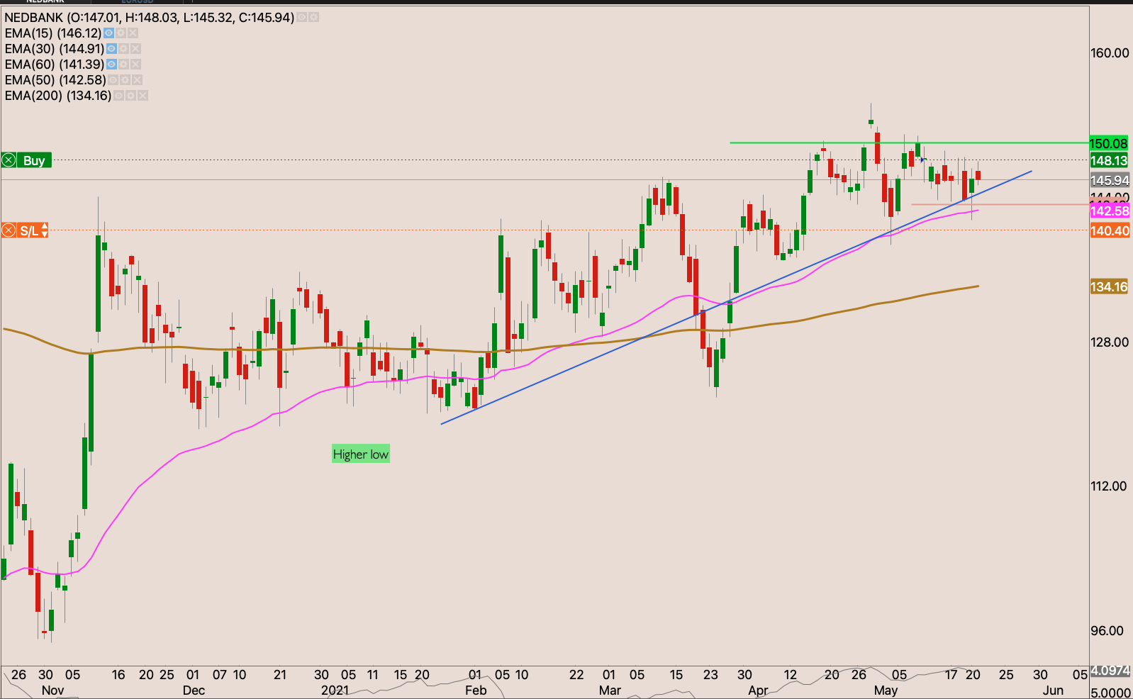 I got stopped last week on this trade as the stock violates the 50 day EMA. It did remember the R141 old support and it was a touching burning stove on Friday and that proved to be the low of the day. If the Friday low isn’t taken out with a new low this week, and the stock breaks back above the 50 day EMA. Signals the end of the -10% correction. I will however wait for a close above R148.10 to rebuild my position.