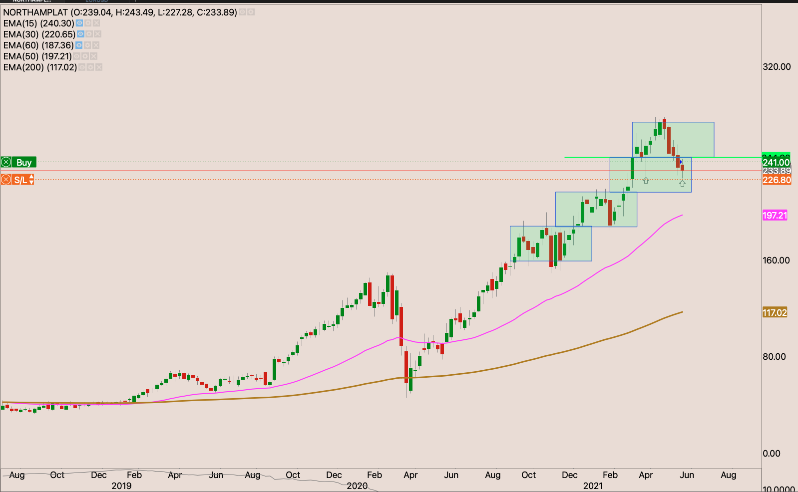 The stock moved to a higher box, not without dunking to the lower box. I raised my stop loss to R194.36 raising my position to just above breaking even at +0.28%. I will add another 1% risk to the position with 2.6 shares