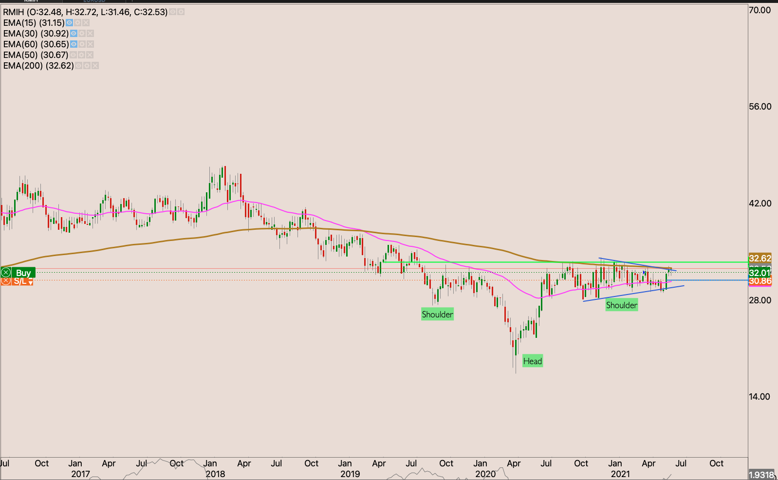 The stock got going again last week. The to entered the higher box on increased volume. Looking well poised for a short stay in the current R38 – R41 box. If the stock closes through R41 entering the higher box I will add to my position and raise my stop loss behind me