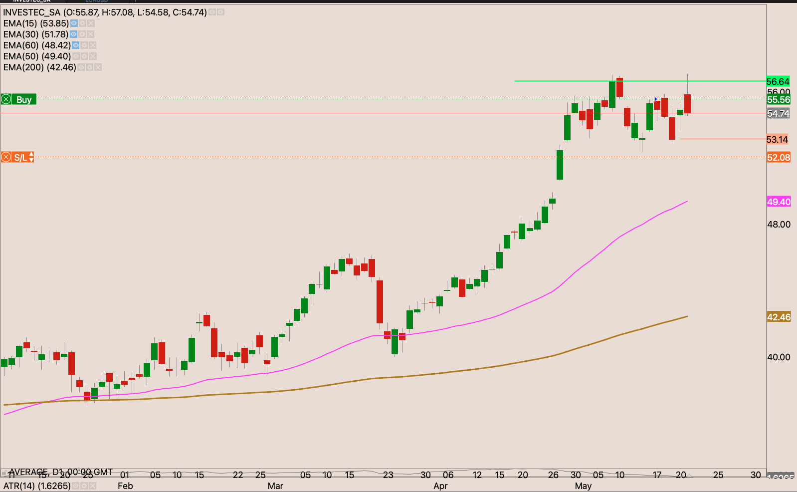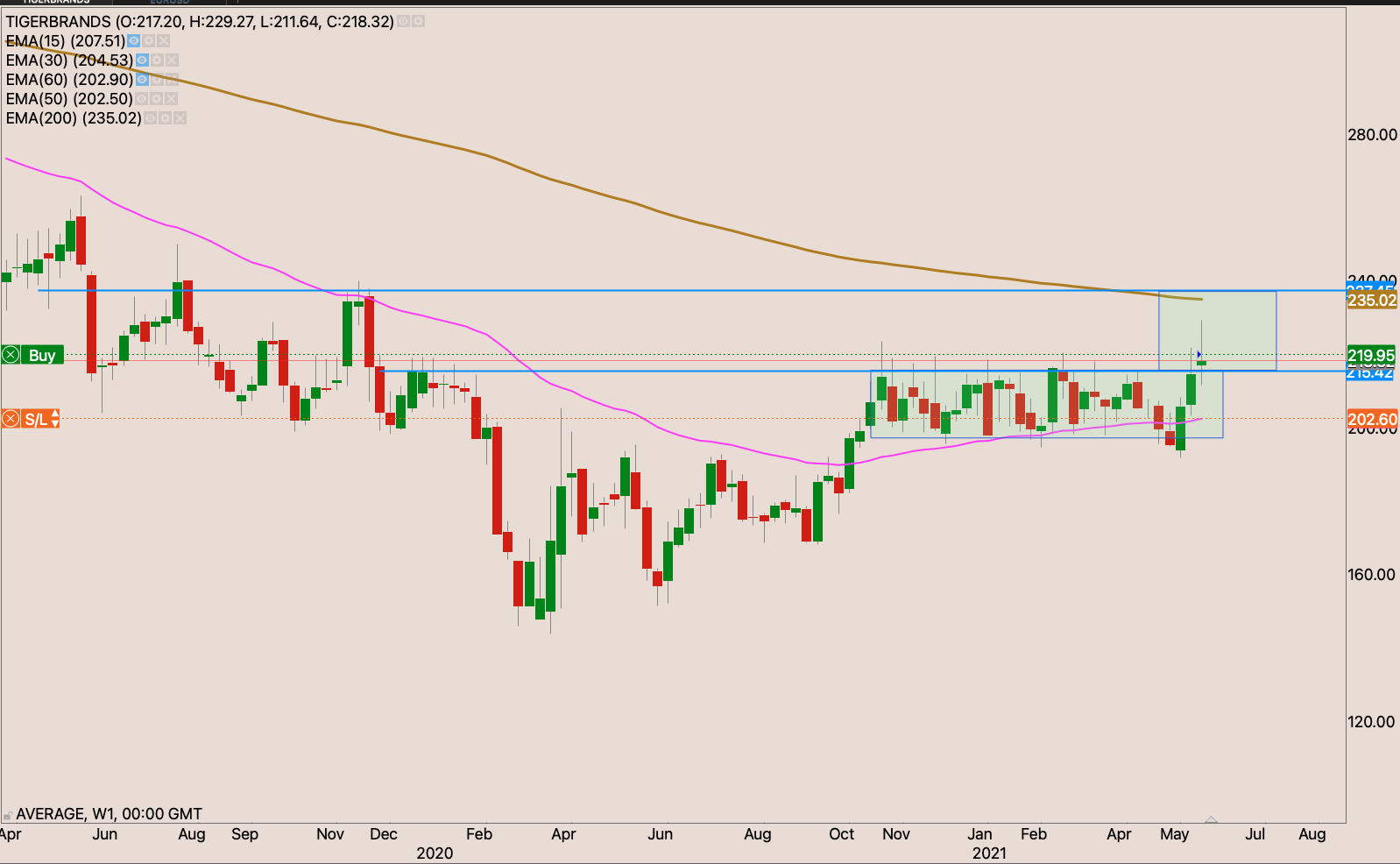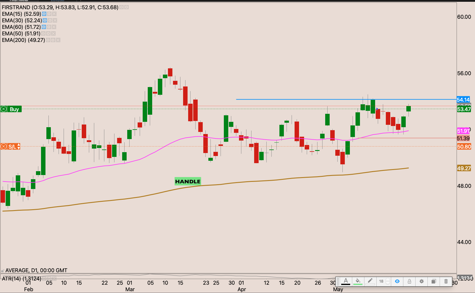 The broke out and retested the resistance and held it well as support from the other side. I raised my stop loss slightly to just under the 50-day EMA to R321.05 reducing my risk to -0.22%. I will be watching the price actions for an opportunity to raise my stop and add to the position.