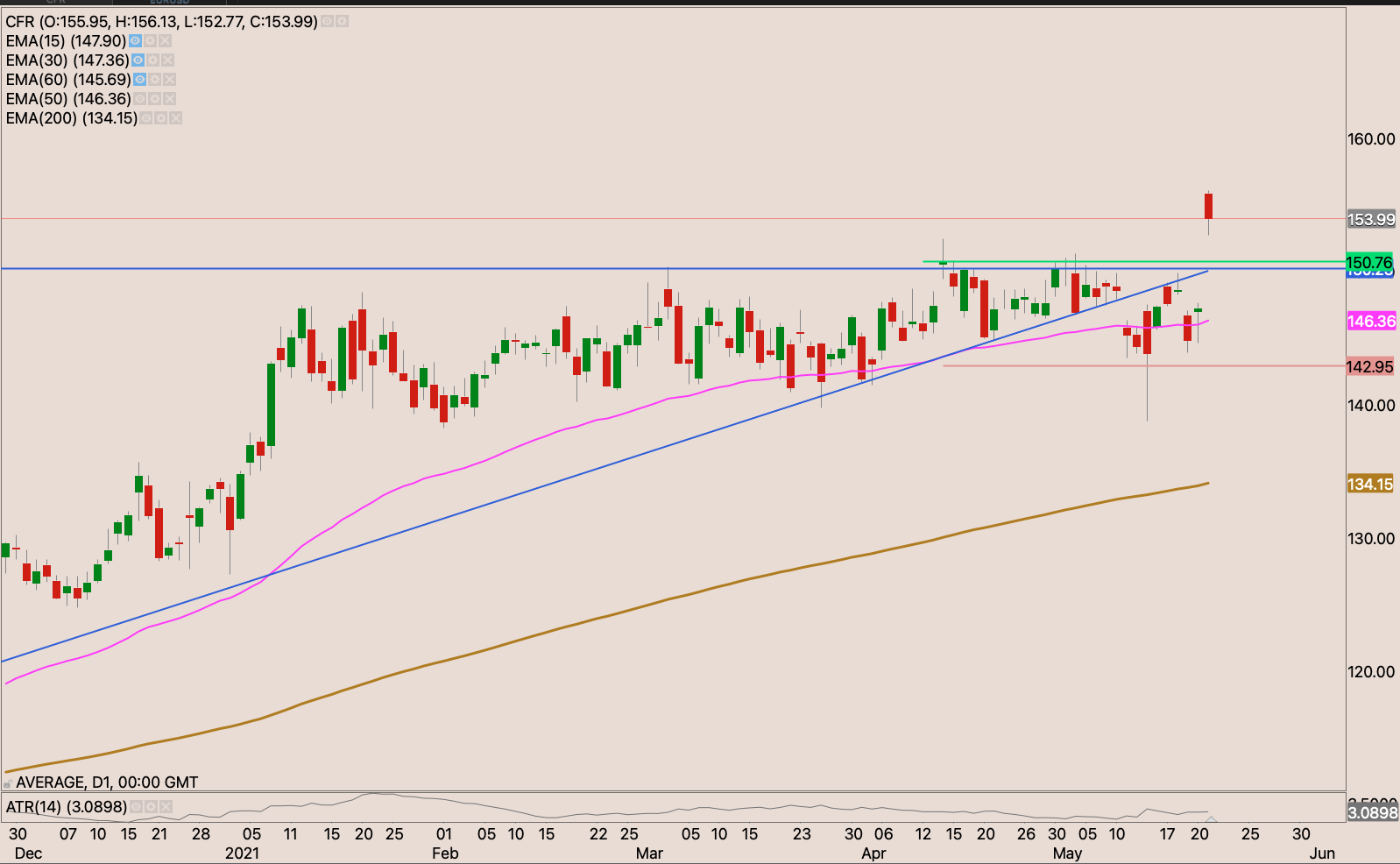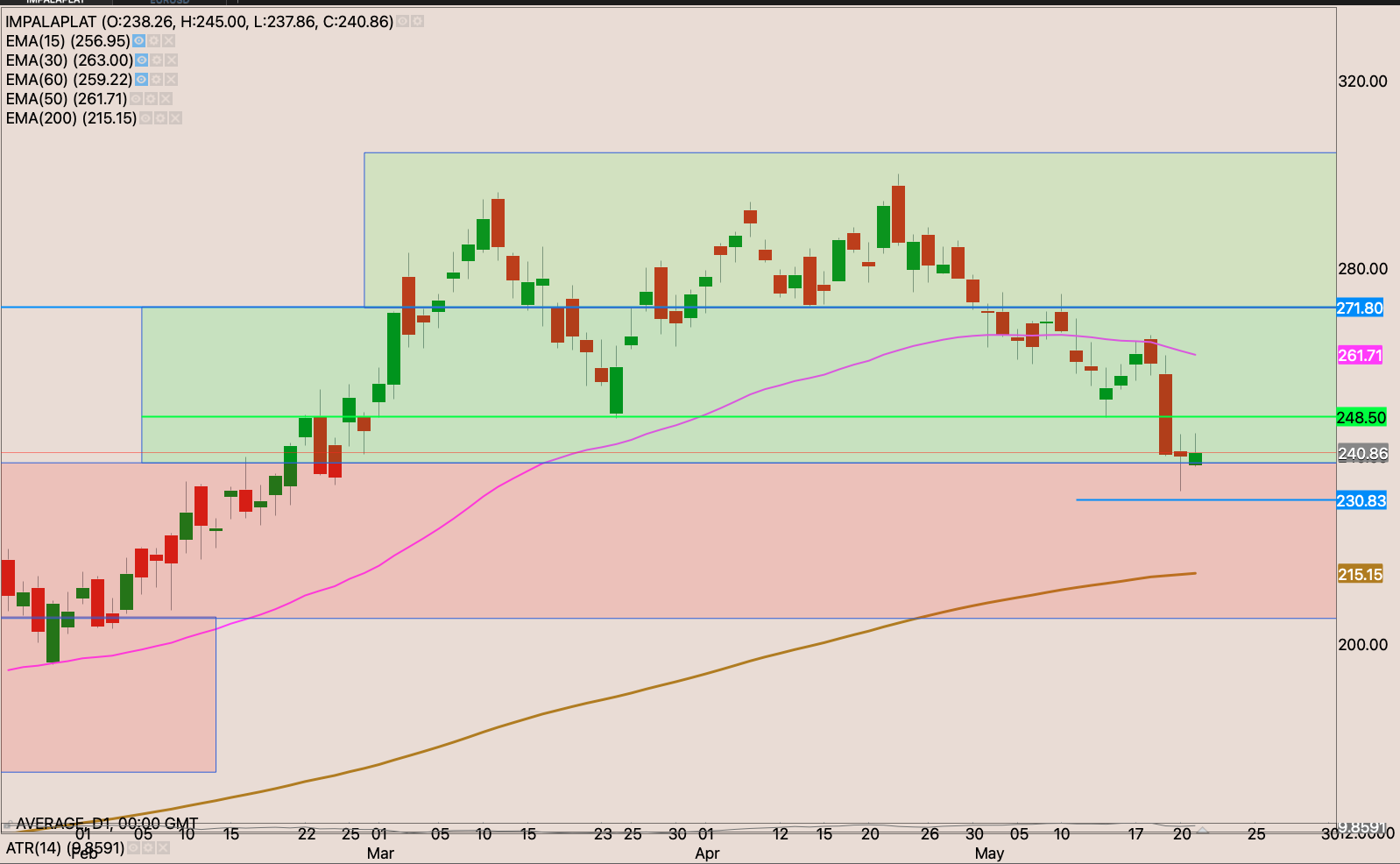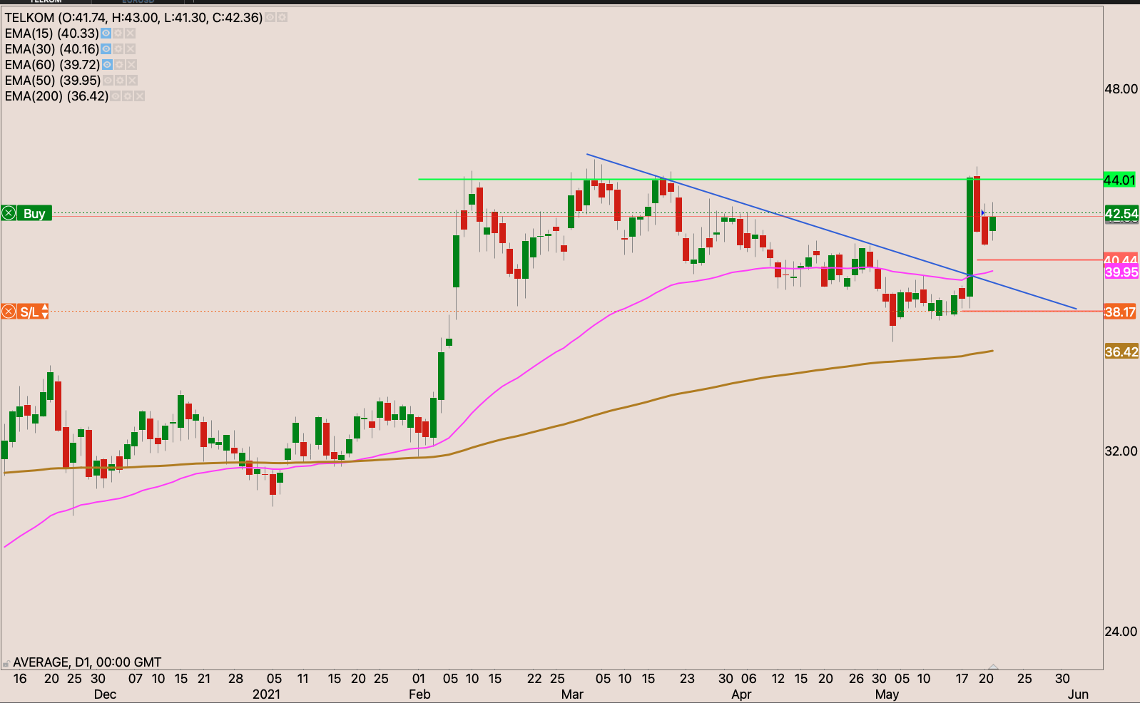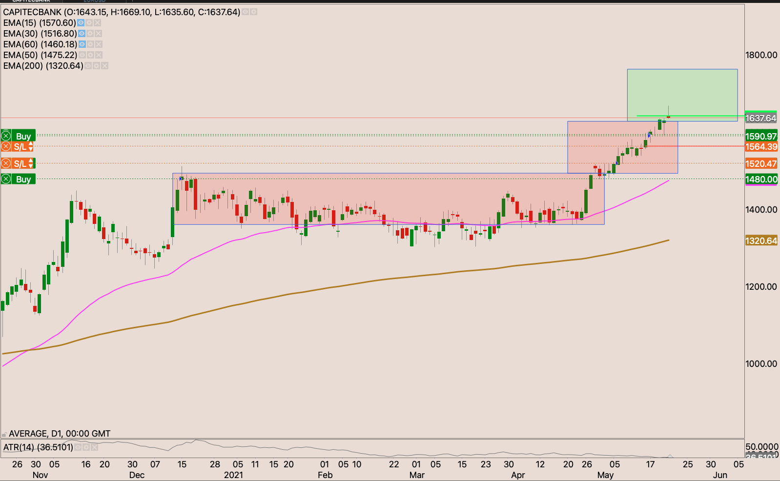 The broke out and retested the resistance and held it well as support from the other side. I raised my stop loss slightly to just under the 50-day EMA to R321.05 reducing my risk to -0.22%. I will be watching the price actions for an opportunity to raise my stop and add to the position.