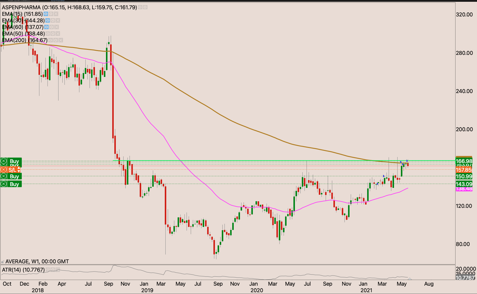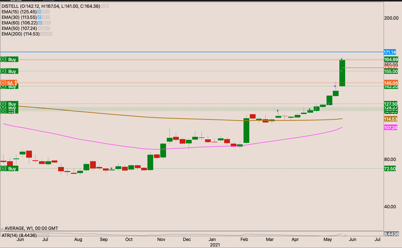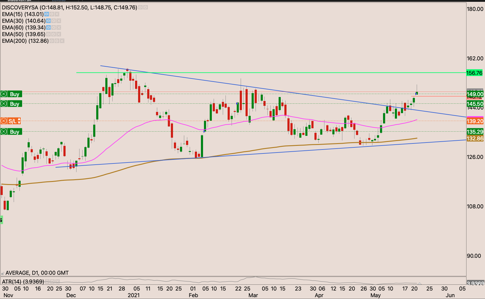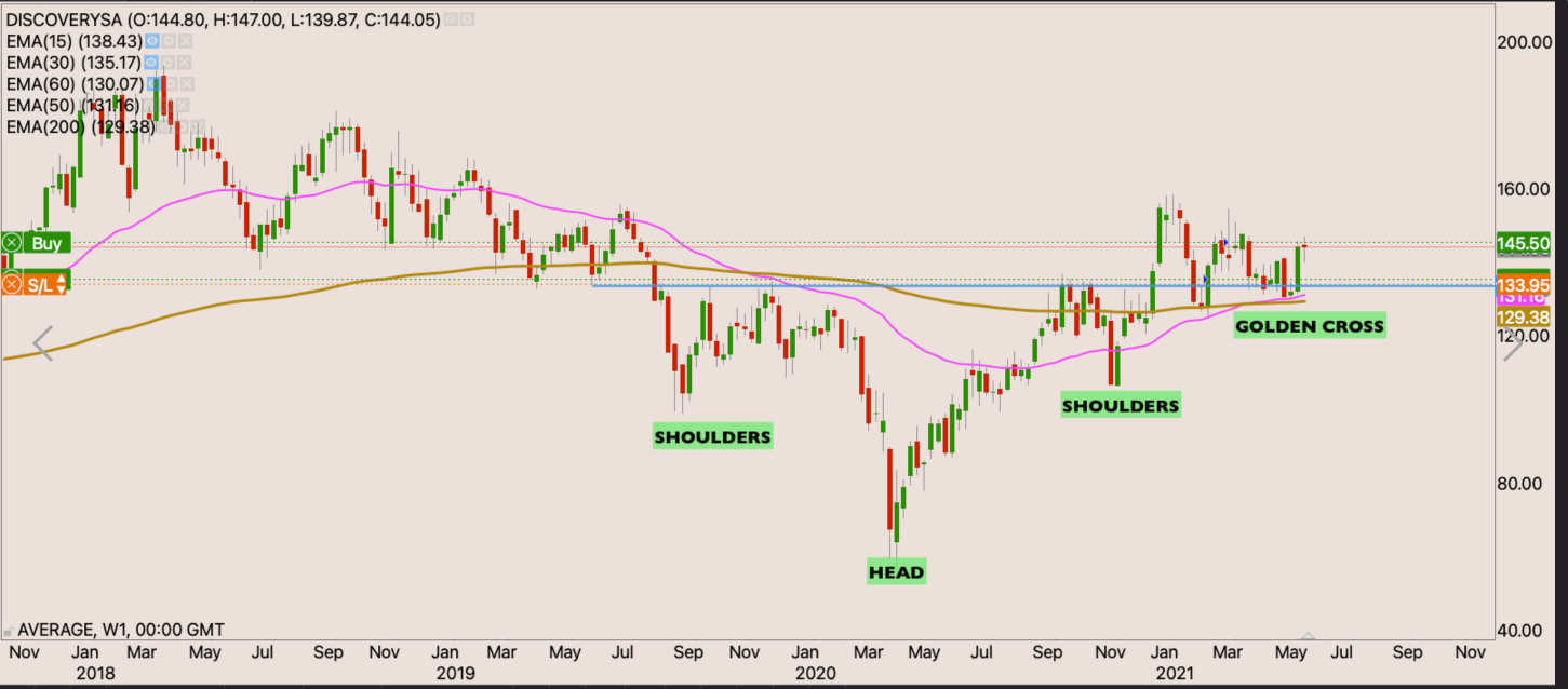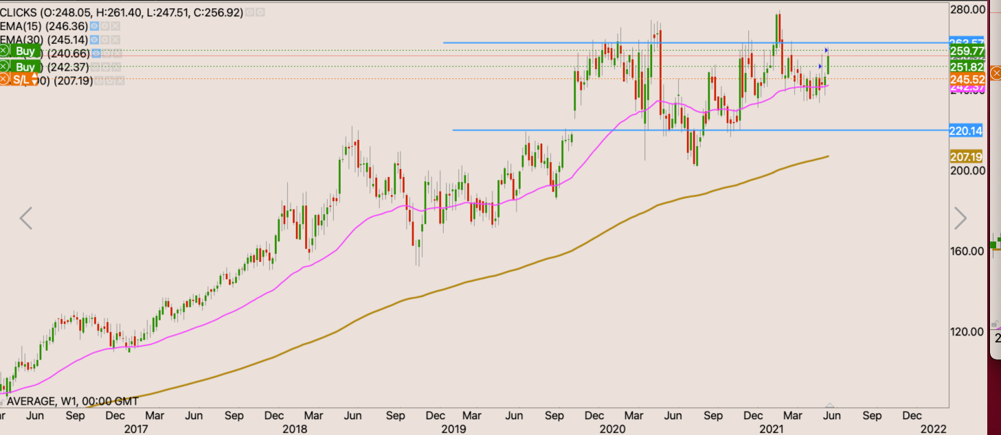 We recently had a golden cross showing that indeed buyers are a bit stronger than sellers albeit not by very much. The R160 level had been like a graveyard in the sky. Until Friday at the back of a trading update. The stock closed R164.04 on Friday. I will buy the stock with my initial stop loss just below the 200 day EMA at R140.80
