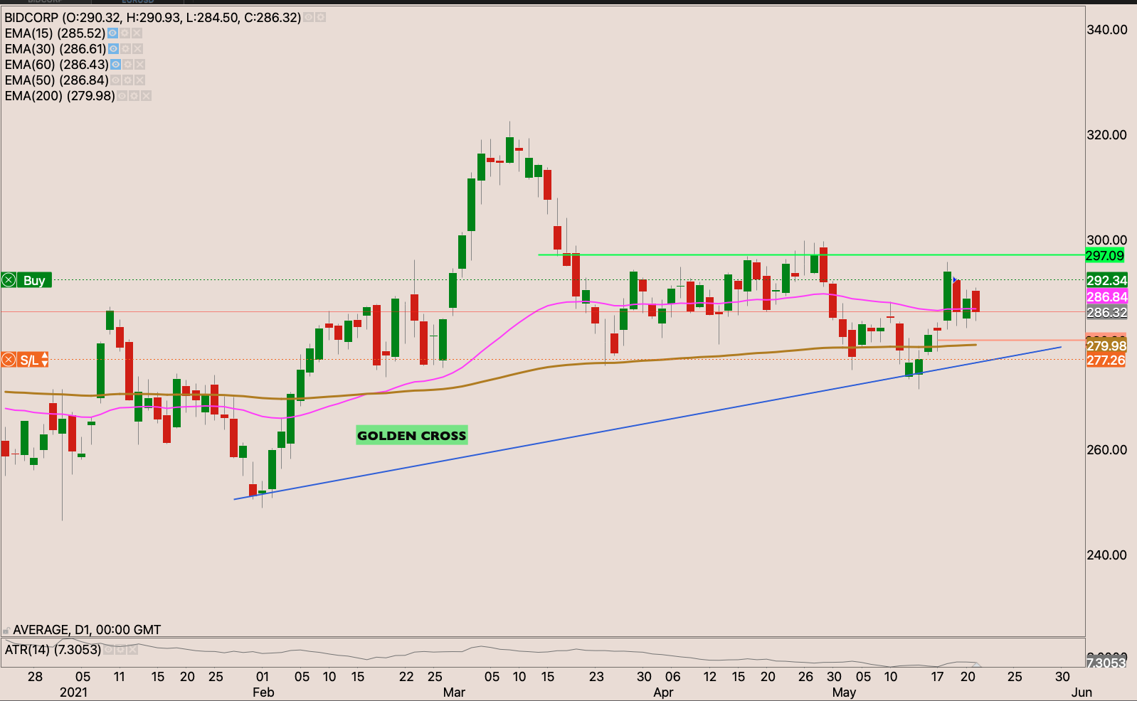 The stock came back above the 50-day EMA breaking the R304 resistance. I will build a position on the stock, with an initial stop loss at R290.60. Putting 1% risk with 5.6 shares.