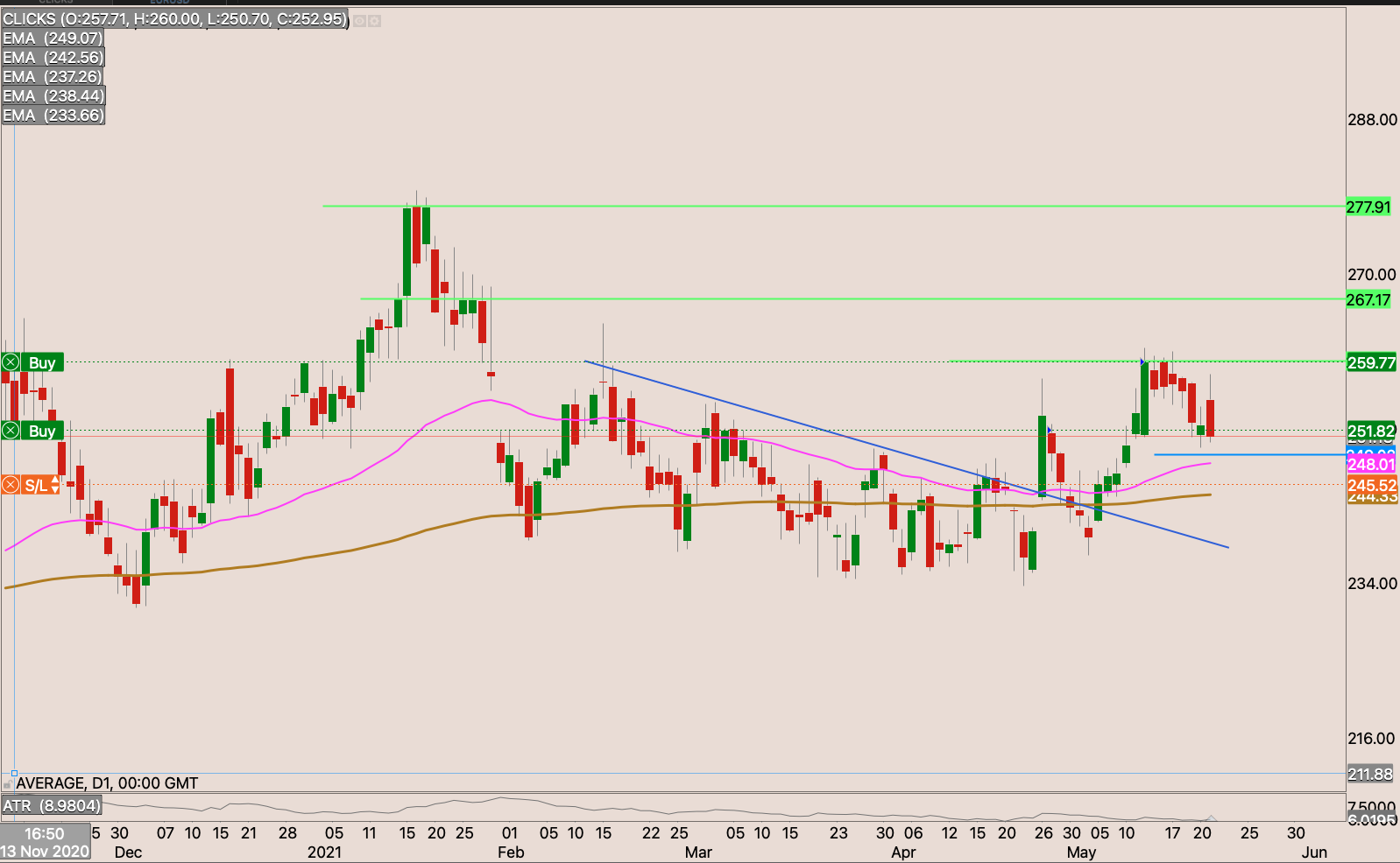 The stock found some selling at the R259. I’m waiting the break of this level on the up side to then raise my stop loss and add to my position. I think will have a strong rally once the stock breaks R276.50.