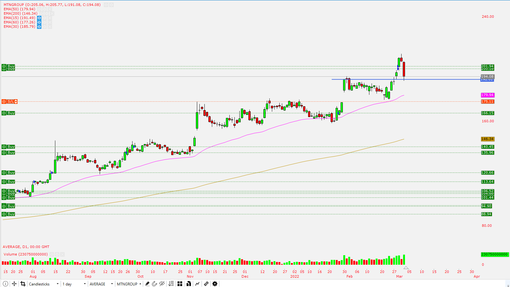 It’s currently in a nice strong up trend, came close to the 50 day EMA and repelled as Russia invaded Ukraine with military action. Now I have to wait for confirmation of this “dip” & close through R191.80, a relative new high close. With a stop loss at R173.40, raising it as it continues to run higher.