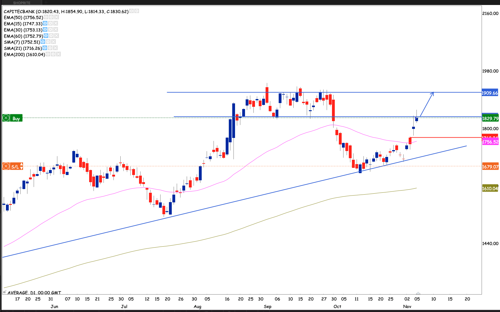 The company announced a share buy program of £2 billion. The stock had been deadwood for a while that suddenly sprung to life. The buy back program is the wind at the back. There’s an old resistance at R708. If the market takes out this level. I think we will see the stock hit the R950 highs perhaps higher.