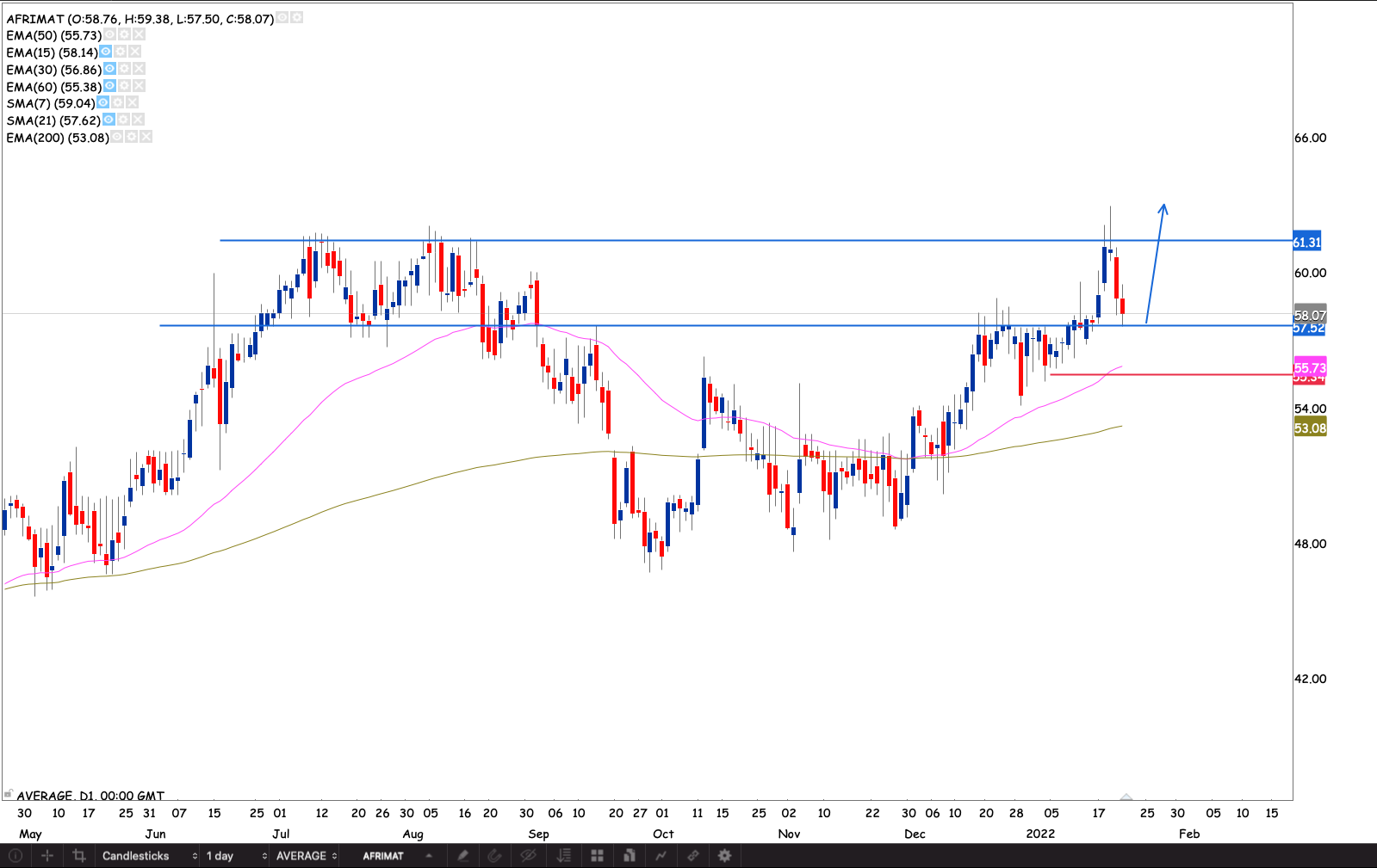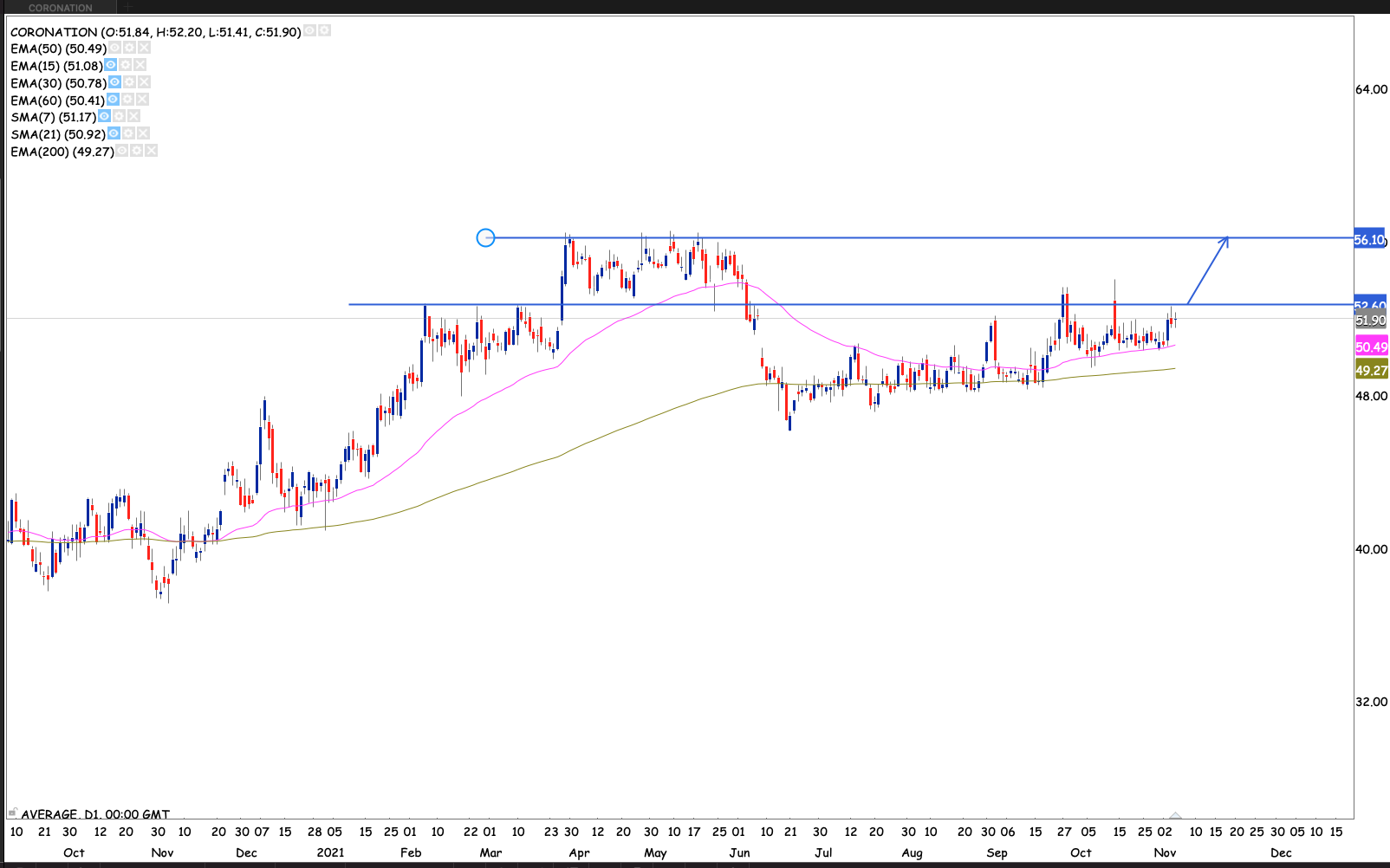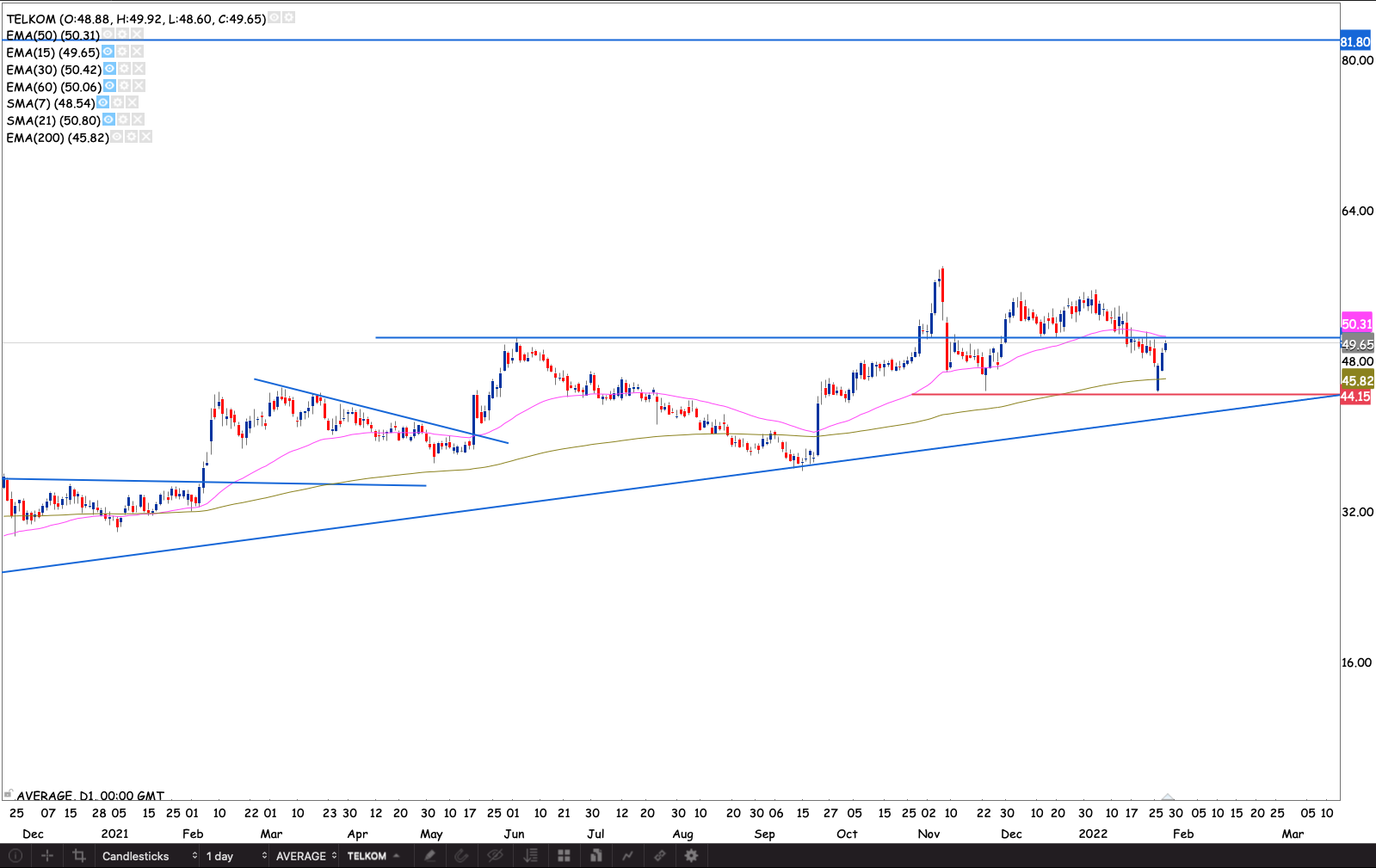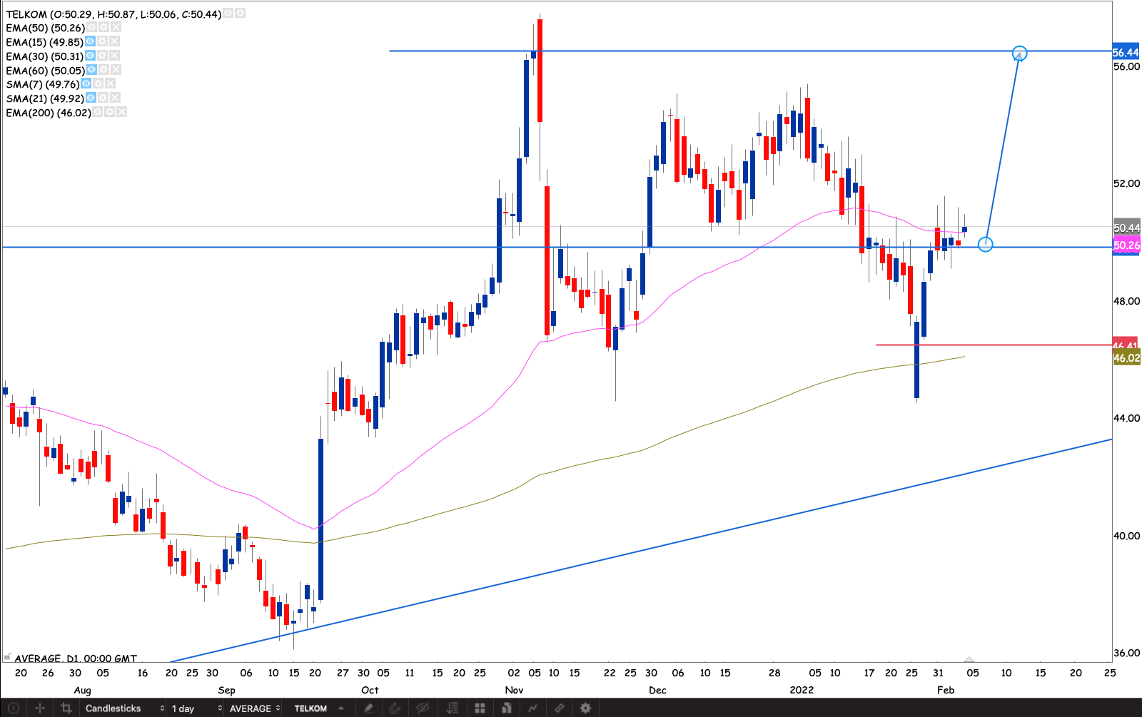 The trendline is steeper after the stock came above the 200 day EMA. We’re quite close to having a golden cross. Monitoring for a break above R60 to take a closer interest in the stock