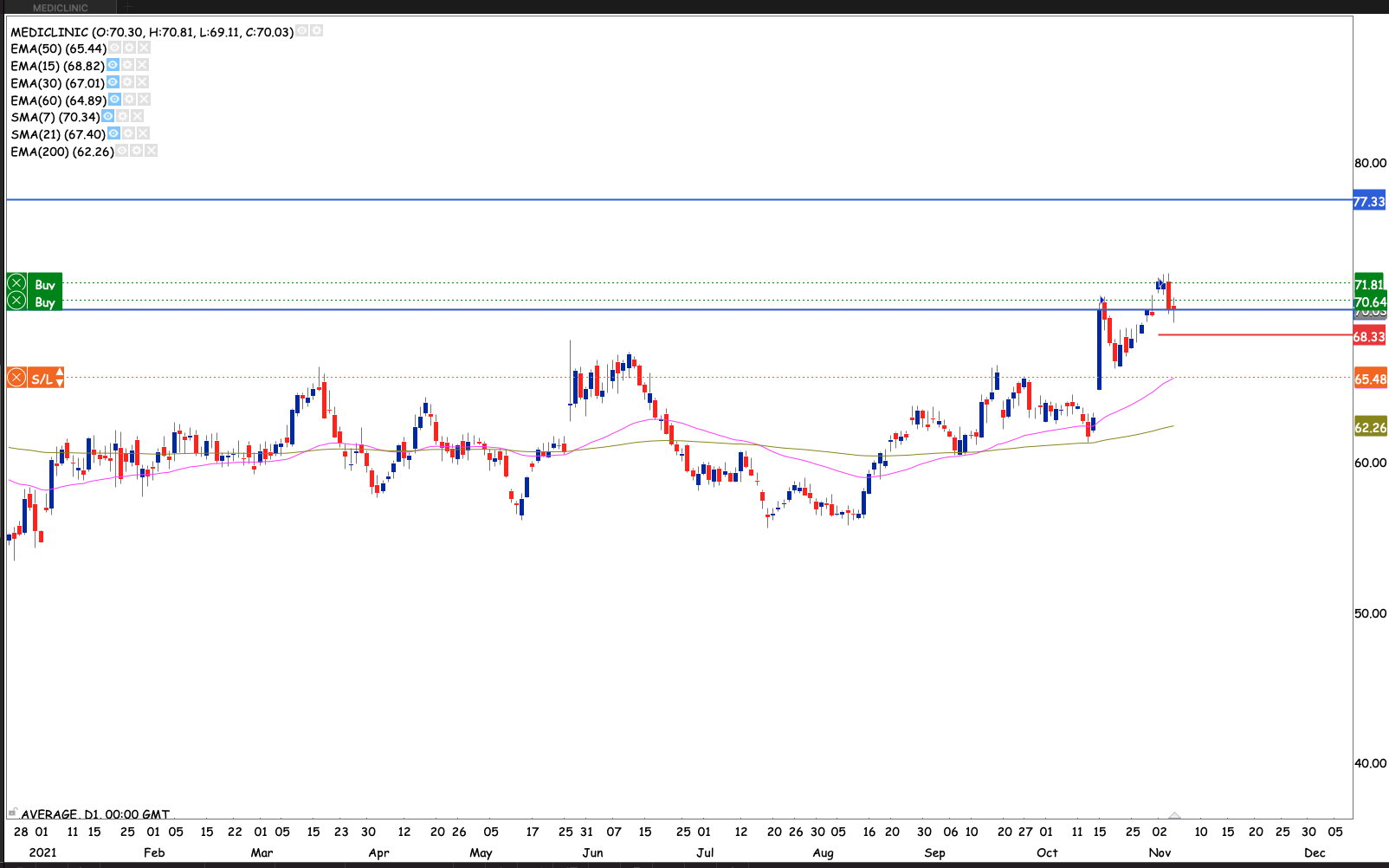The stock came back to test the old resistance. So far its holding. With a doji on Friday. Providing a buy opportunity. Although waiting for a green close above the high of the doji. There’s a long short term trade with a R77 target and a R68 stop. I will however wait out for a close through the R77 old resistance. Before raising my stop loss to R68