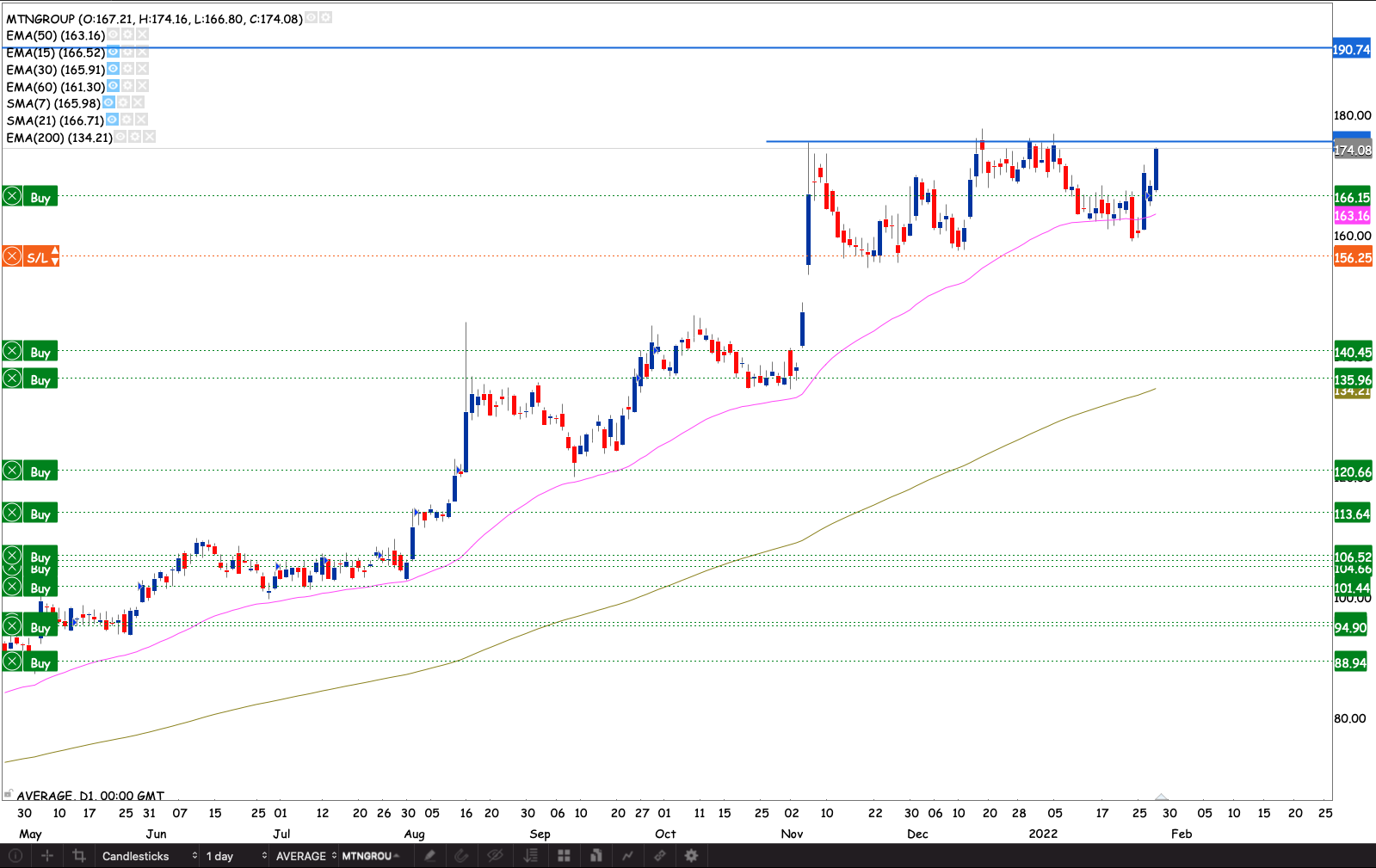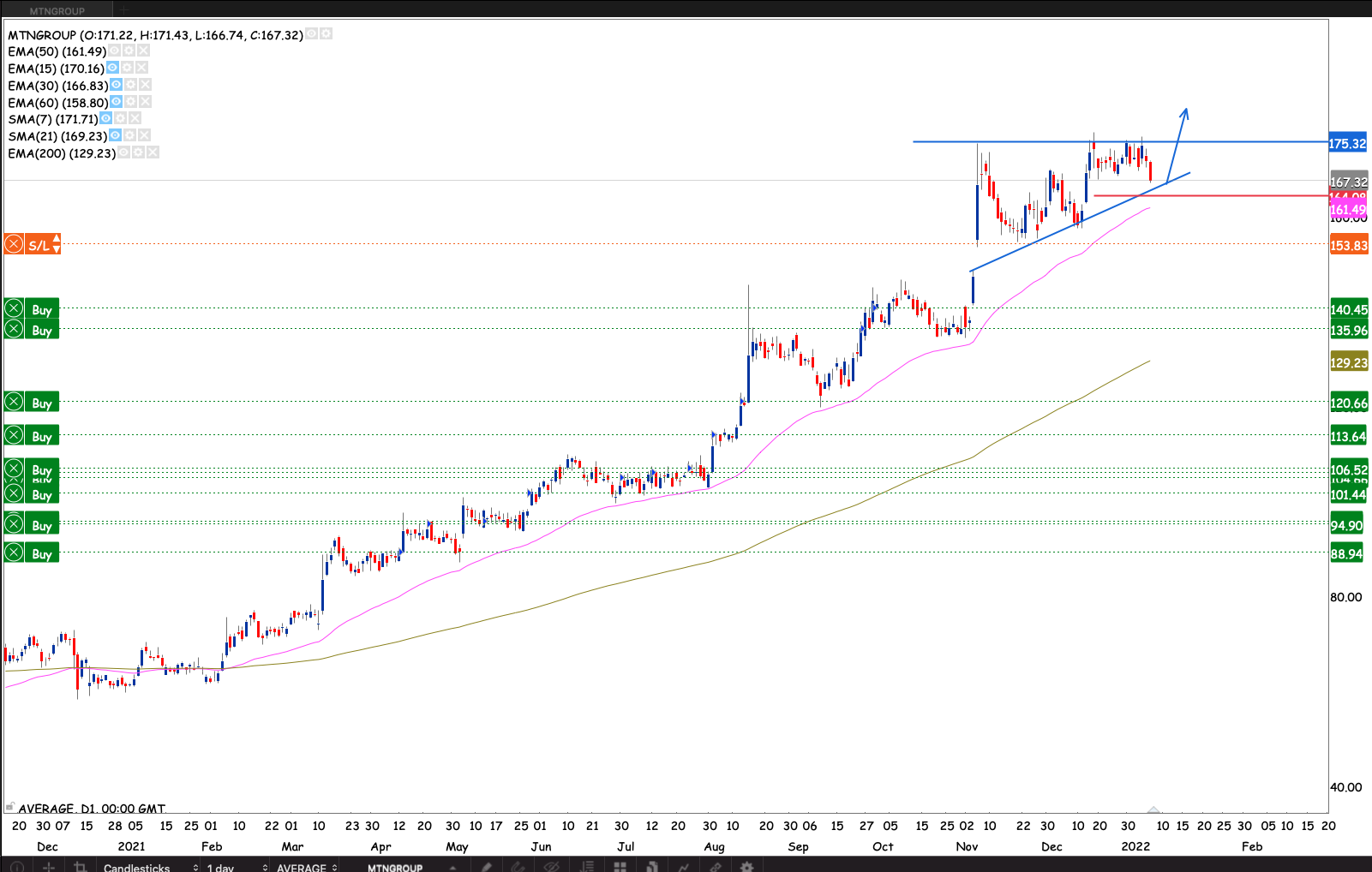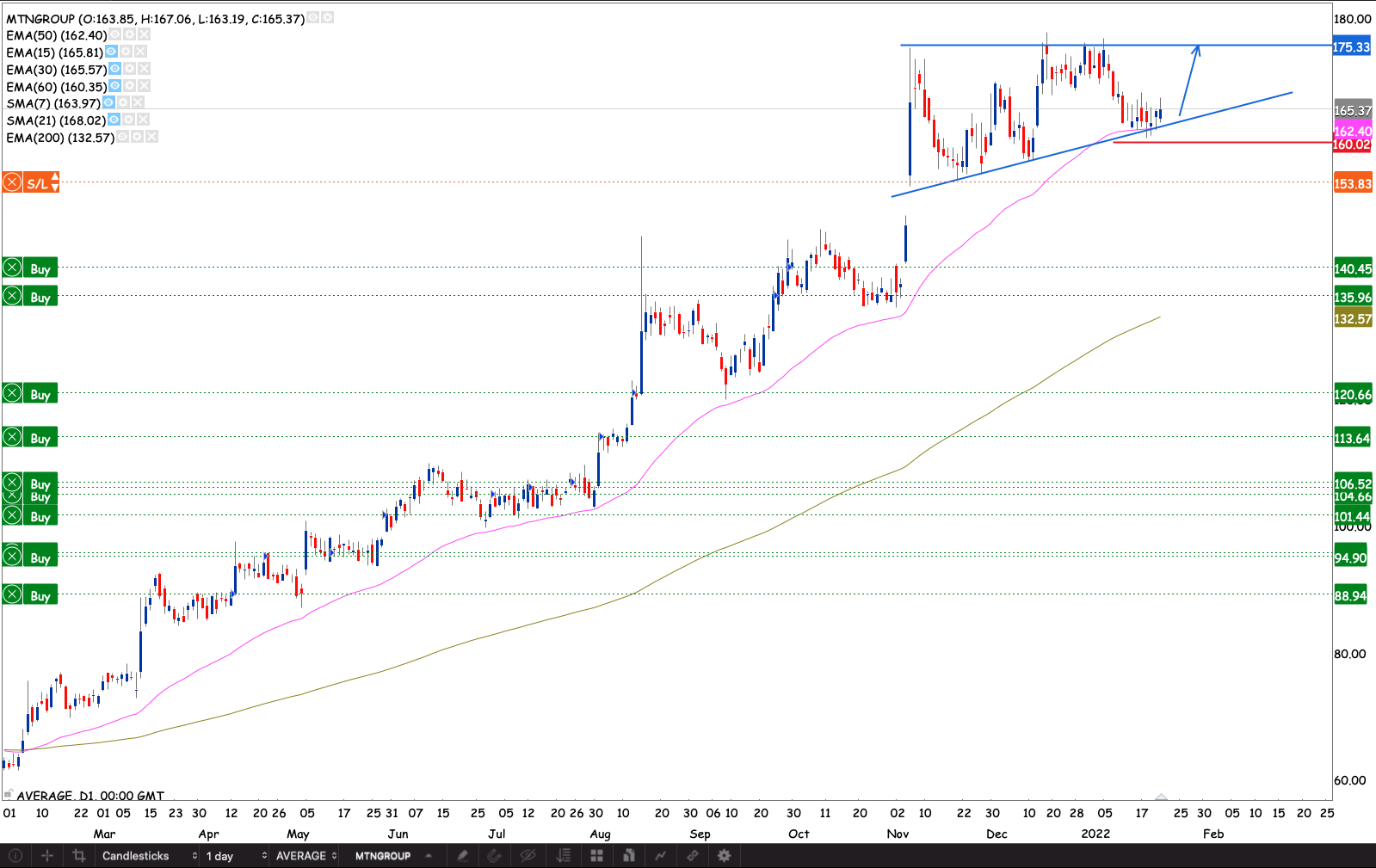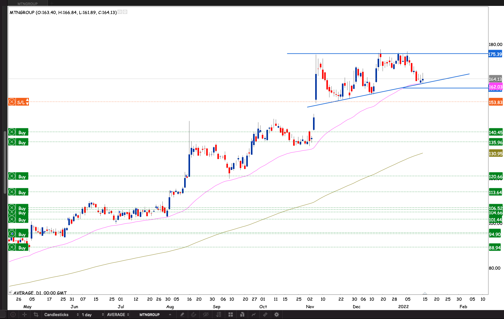 An ascending triangle pattern is forming on MTN. I’m waiting for a close above R175 to add to the position.