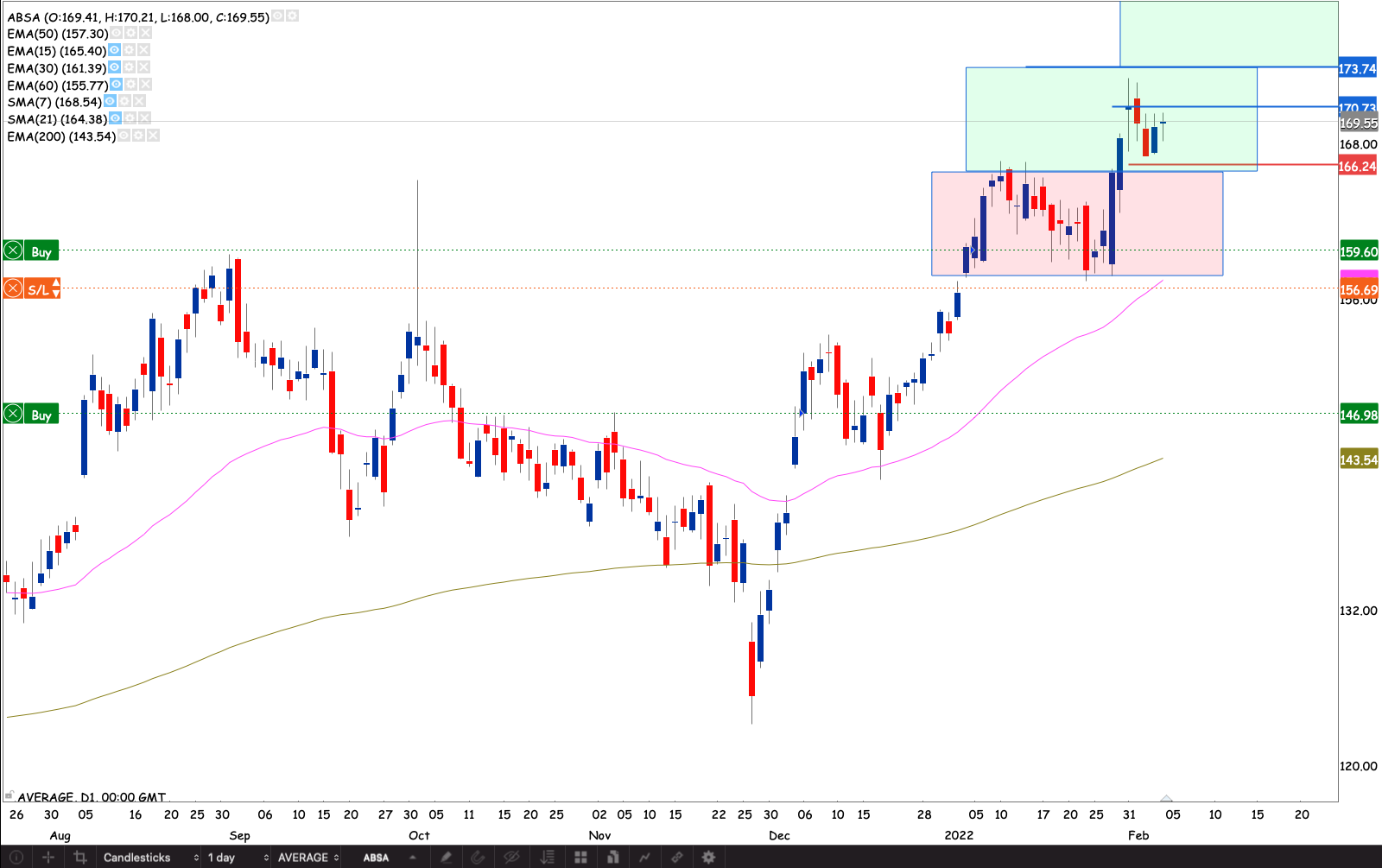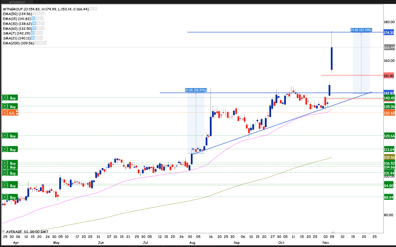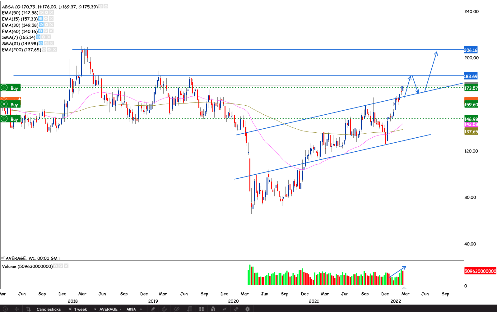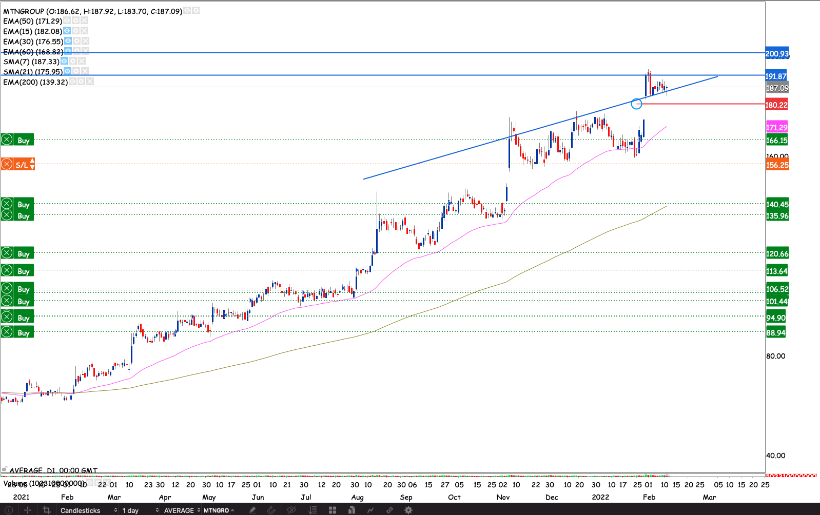 An ascending triangle pattern is forming on MTN. I’m waiting for a close above R175 to add to the position.