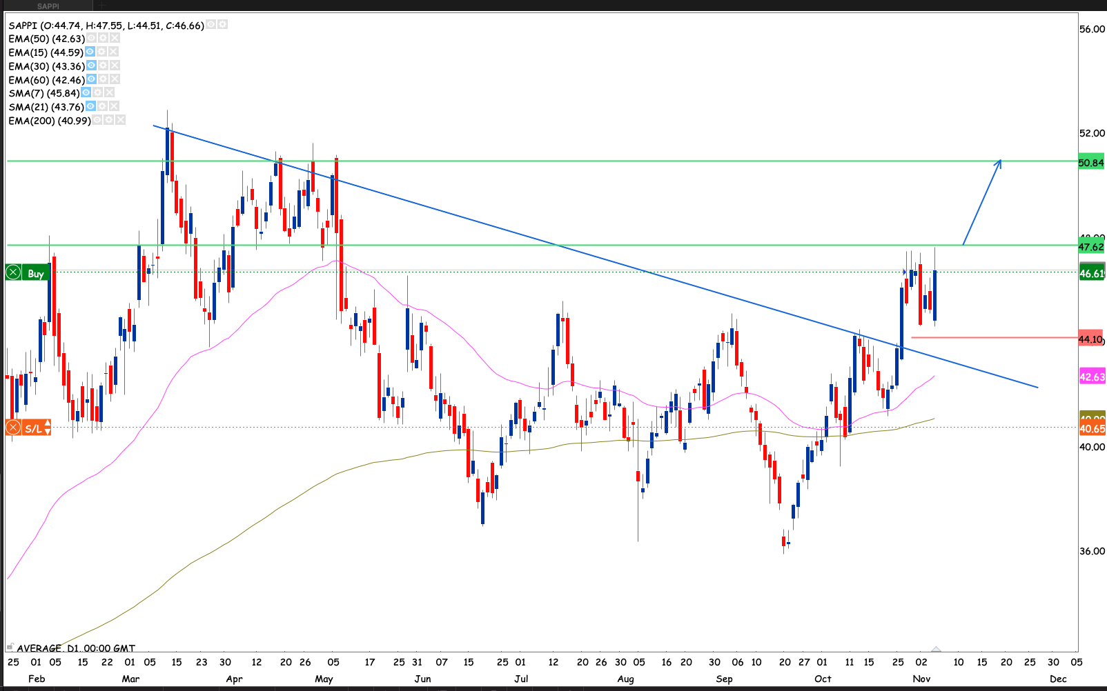 The stock came bitterly close to stopping me out on Thursday. Despite coming with strong results the market sold the stock off. We had a bullish inverted hammer candlestick on Friday around the 50 day EMA. Let’s see if we are going to get a green close. Then we can watch if the market will remember the R46.50 price.
