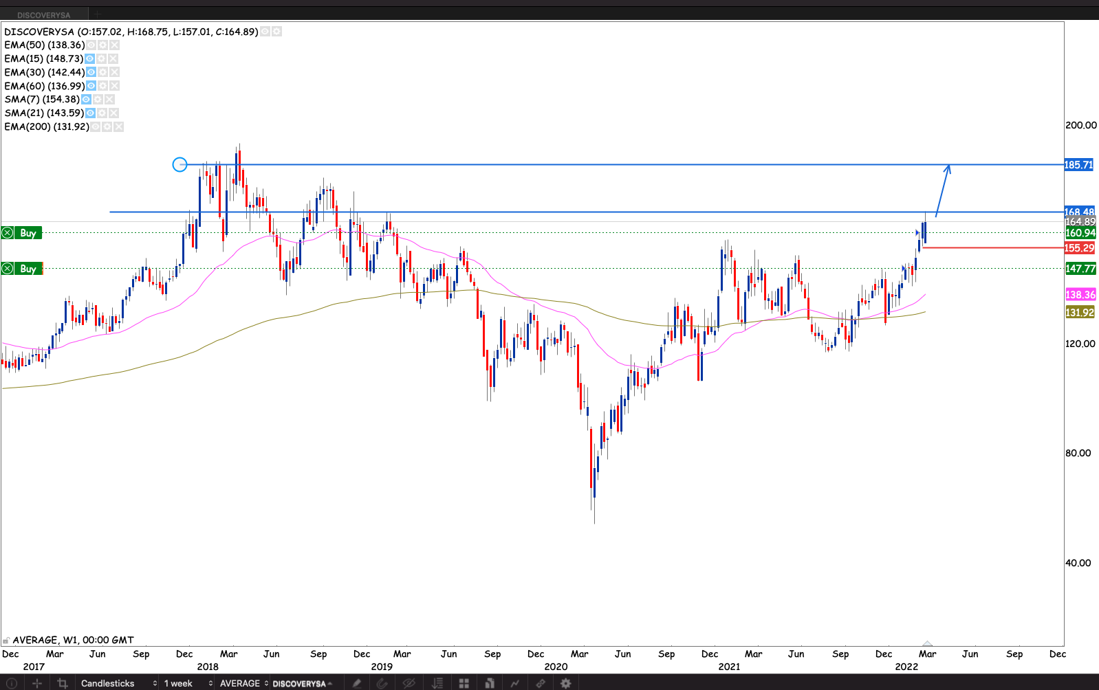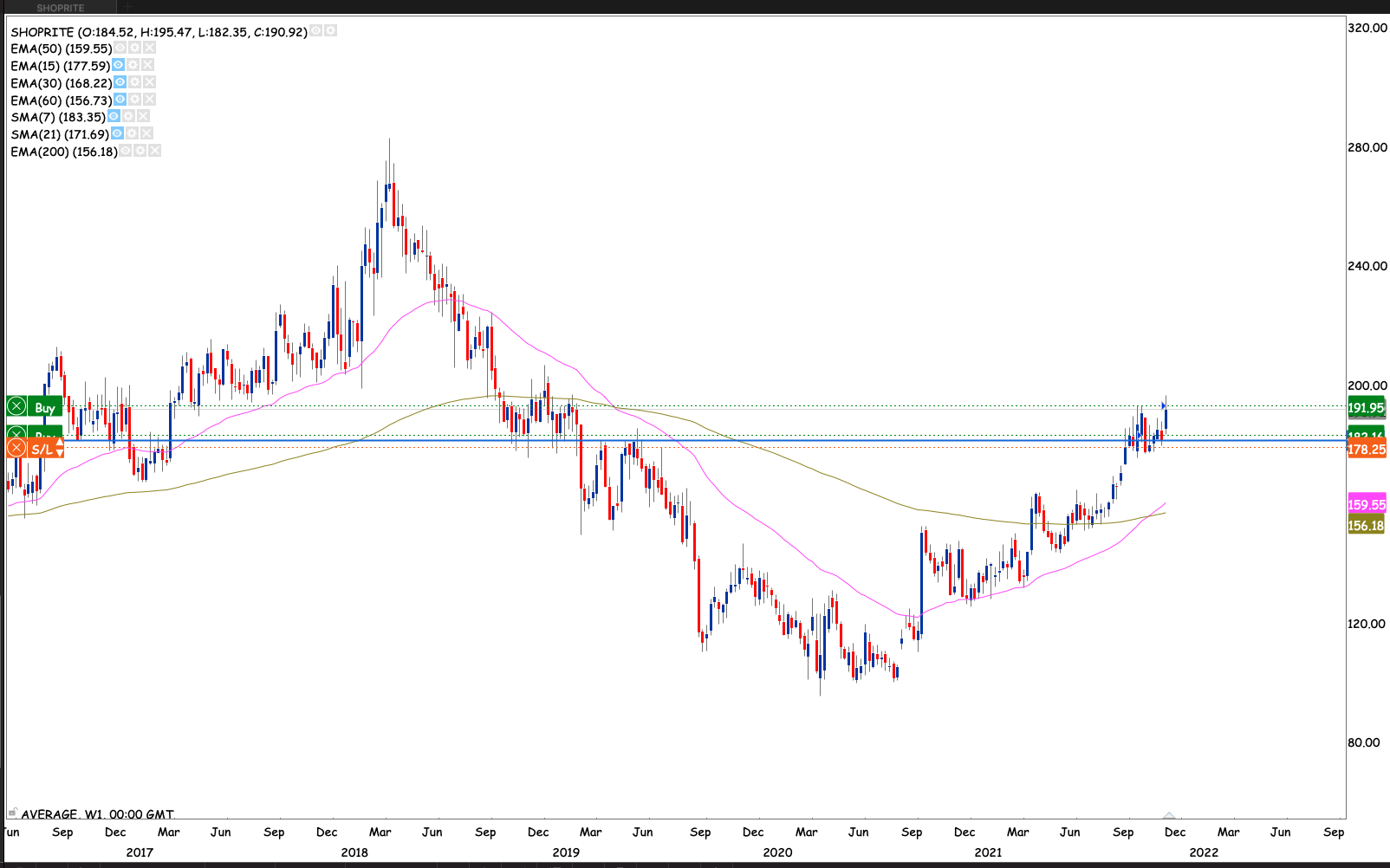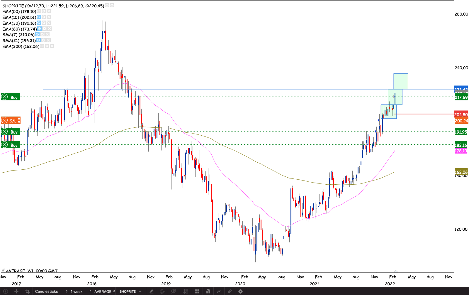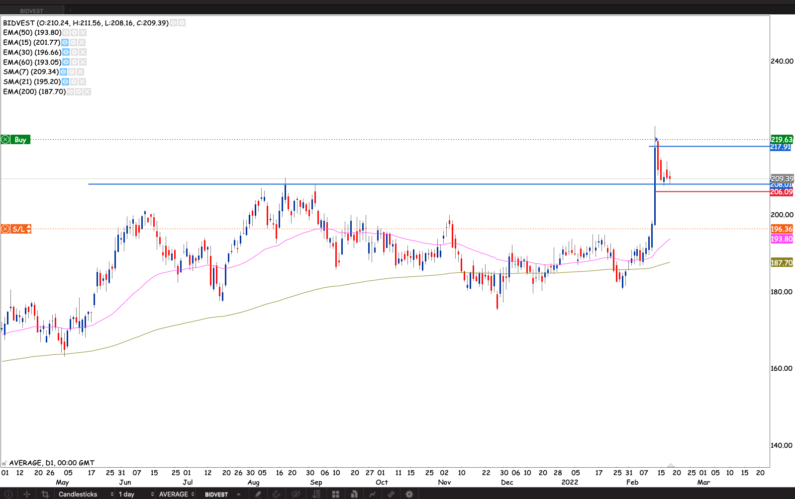 The market liked the trading update last week, EPS expected to be up 100%. The R189 resistance held a bit of a fight. I suspect from state bulls. Close Friday with a bullish engulfing candle that engulfs the entire week. I have a short term target at R220