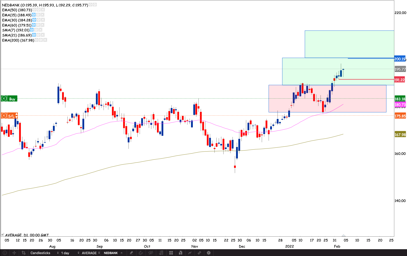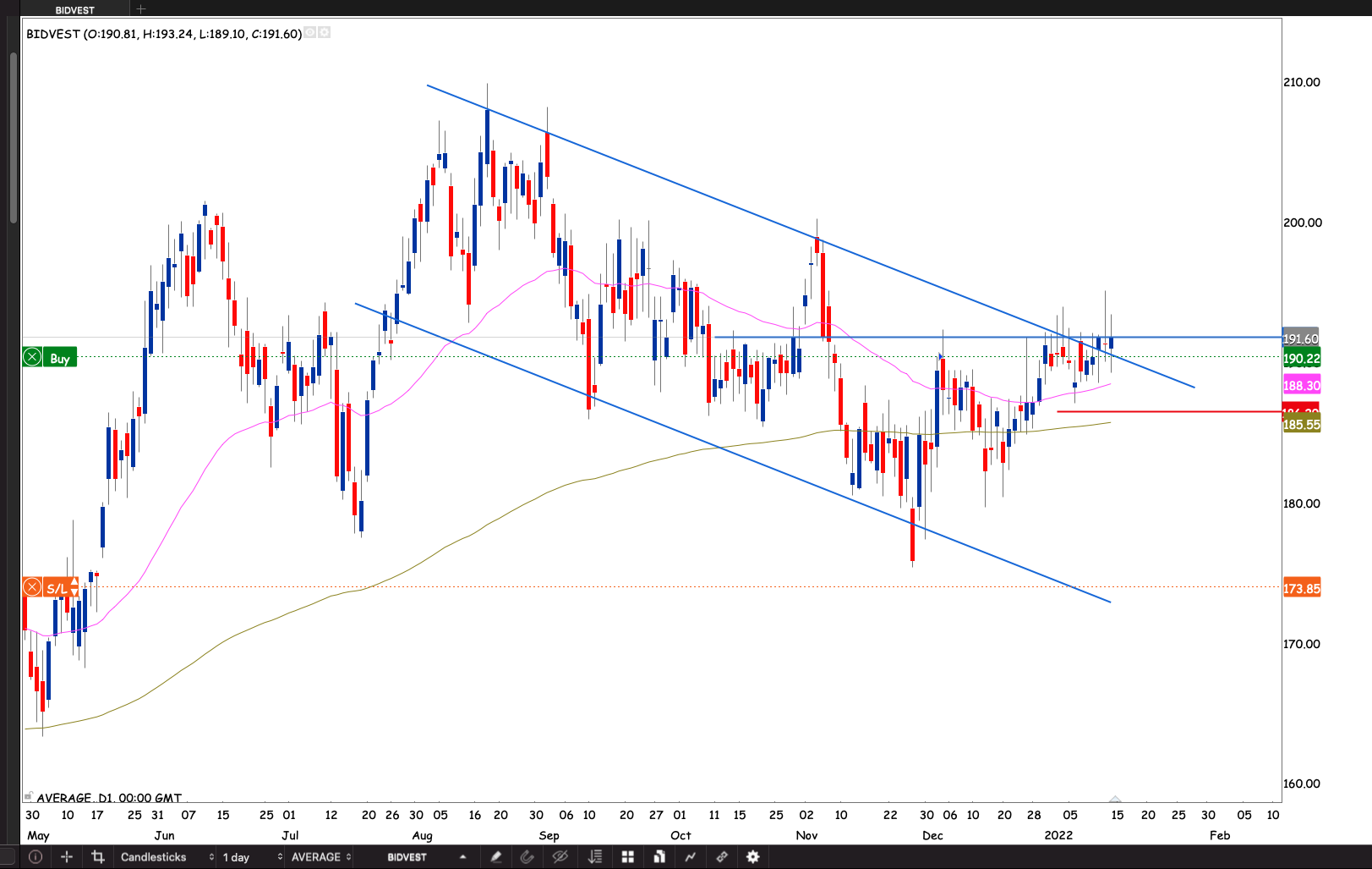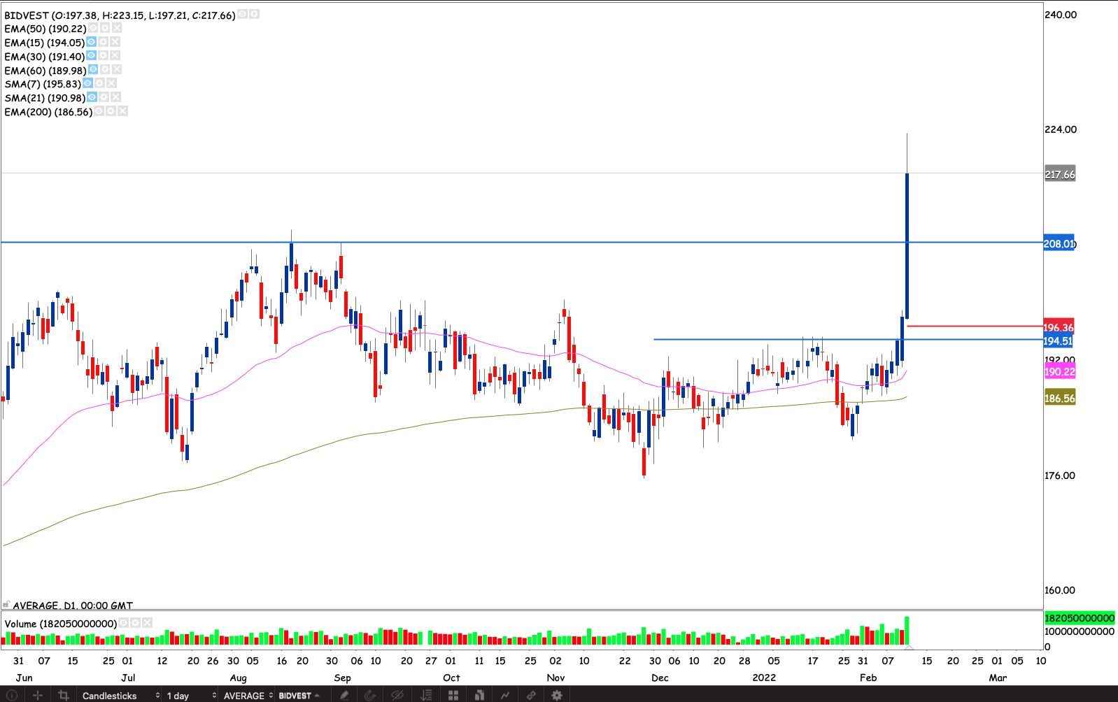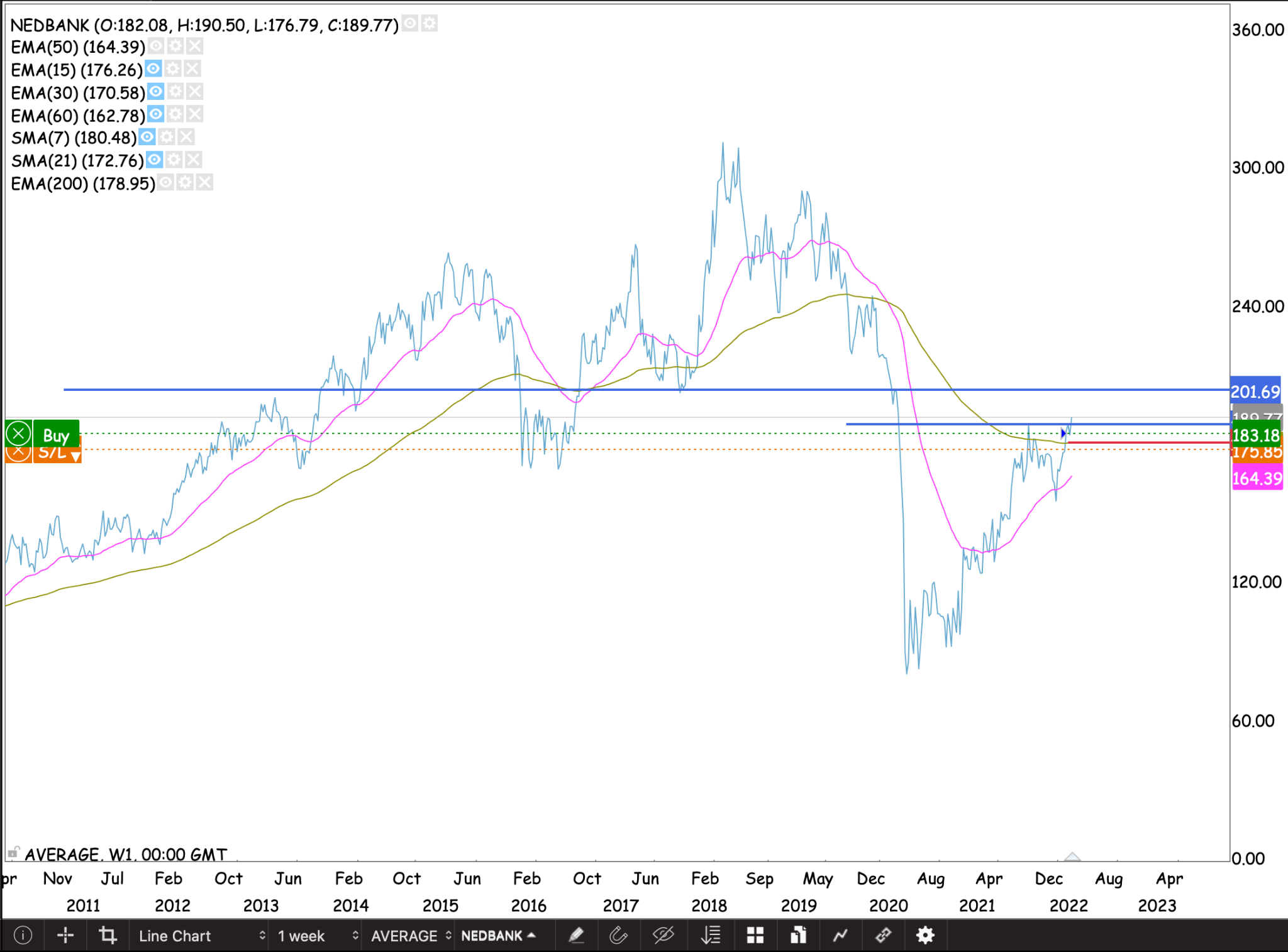 The market liked the trading update last week, EPS expected to be up 100%. The R189 resistance held a bit of a fight. I suspect from state bulls. Close Friday with a bullish engulfing candle that engulfs the entire week. I have a short term target at R220