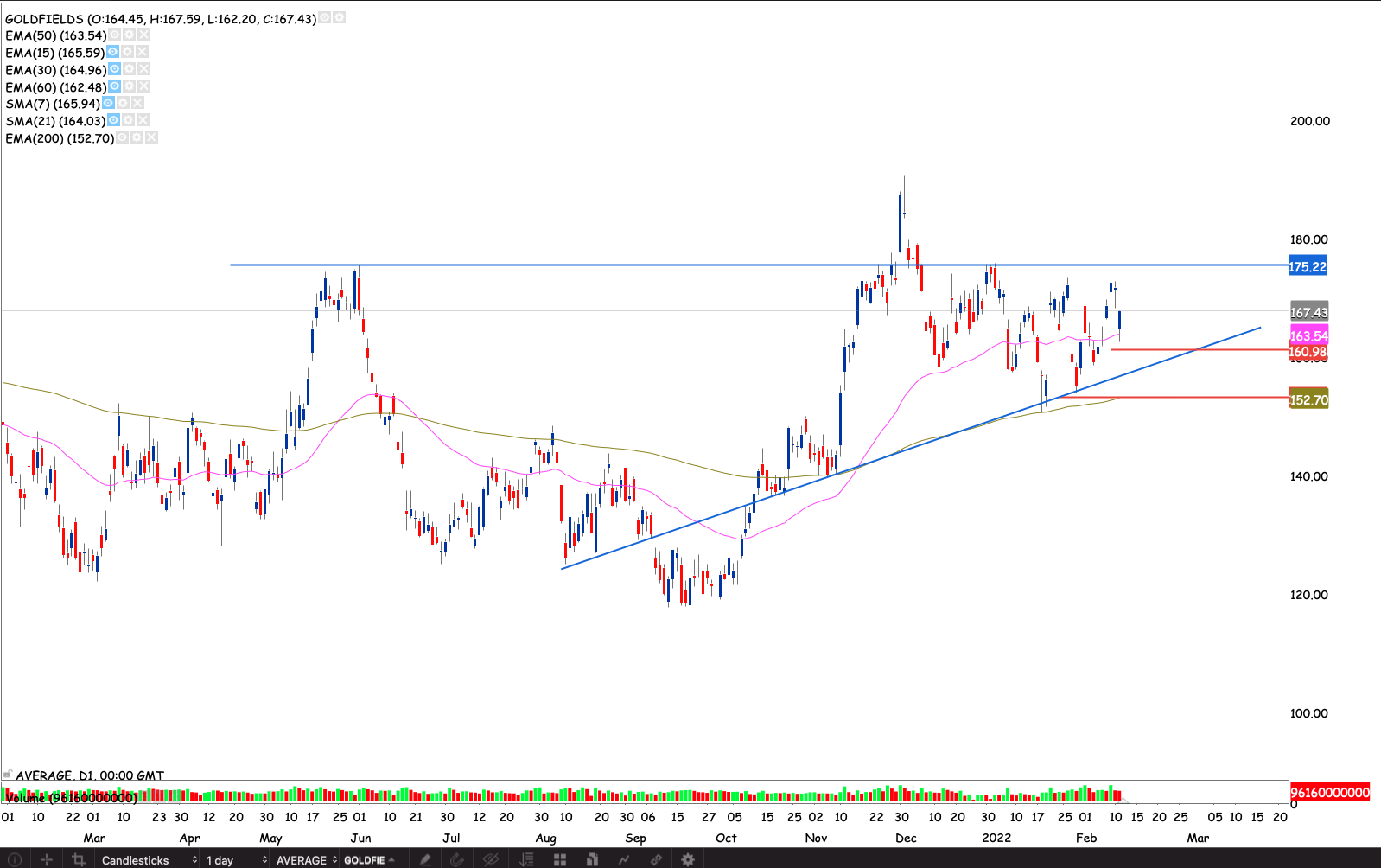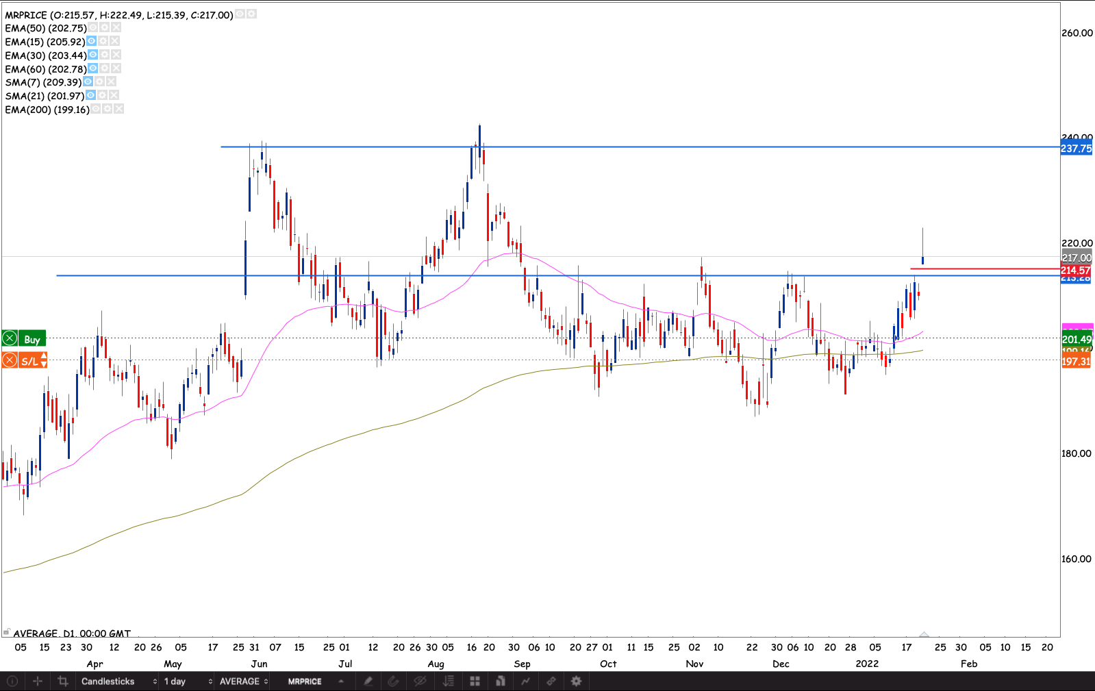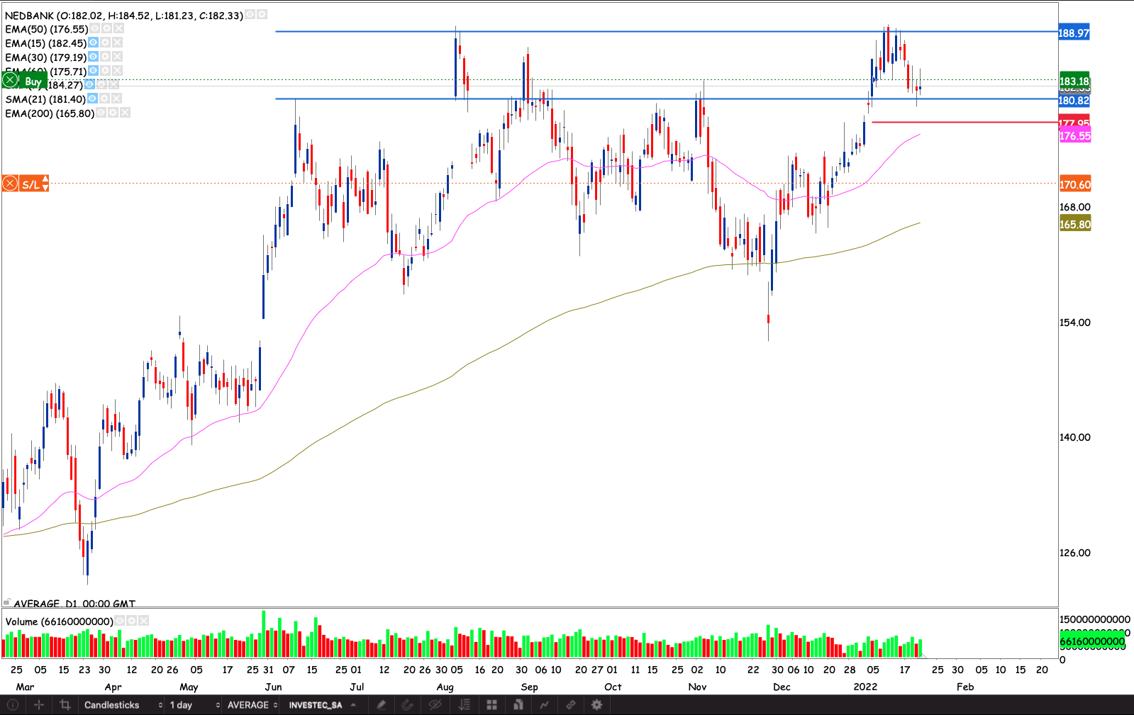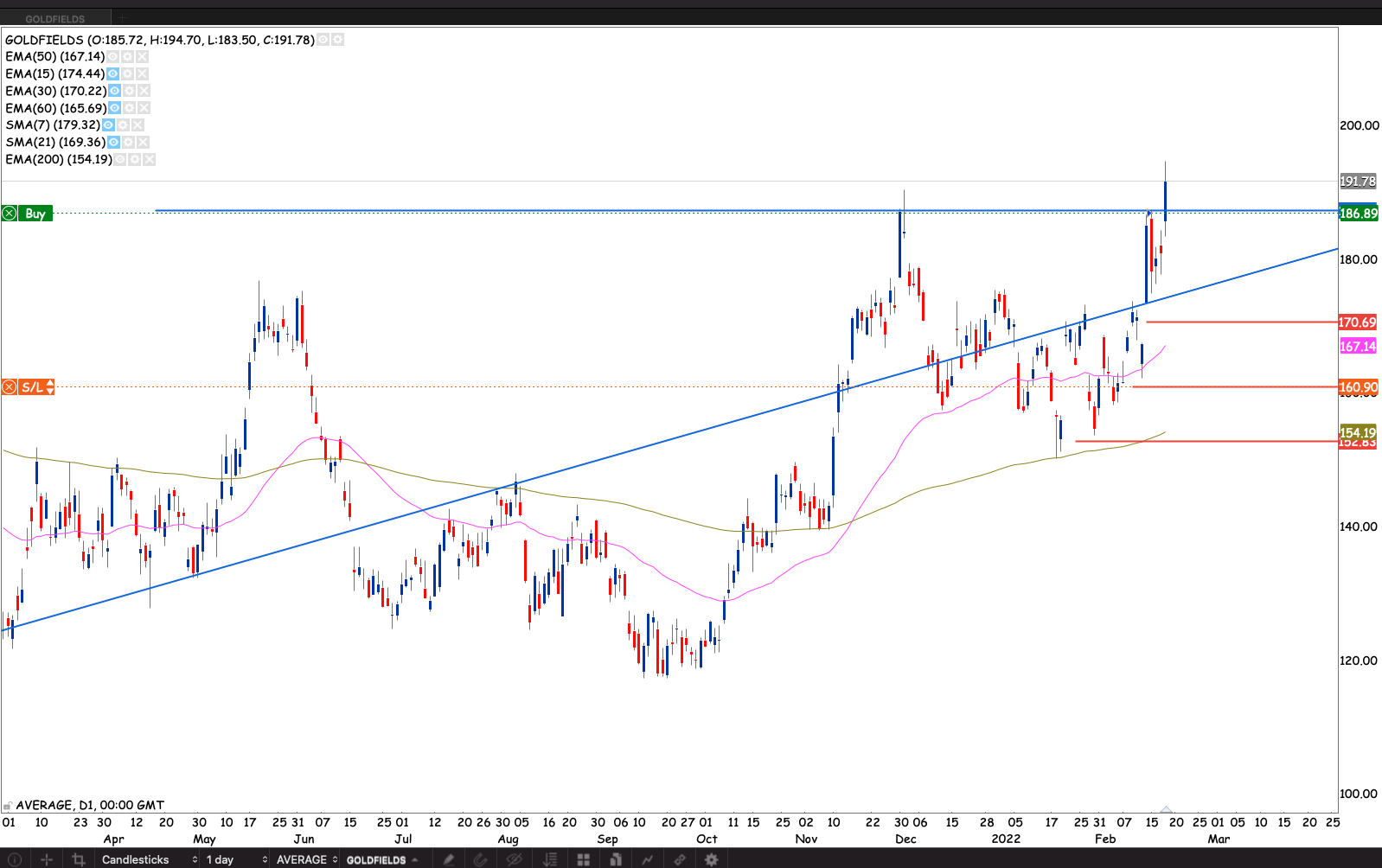 The market liked the trading update last week, EPS expected to be up 100%. The R189 resistance held a bit of a fight. I suspect from state bulls. Close Friday with a bullish engulfing candle that engulfs the entire week. I have a short term target at R220
