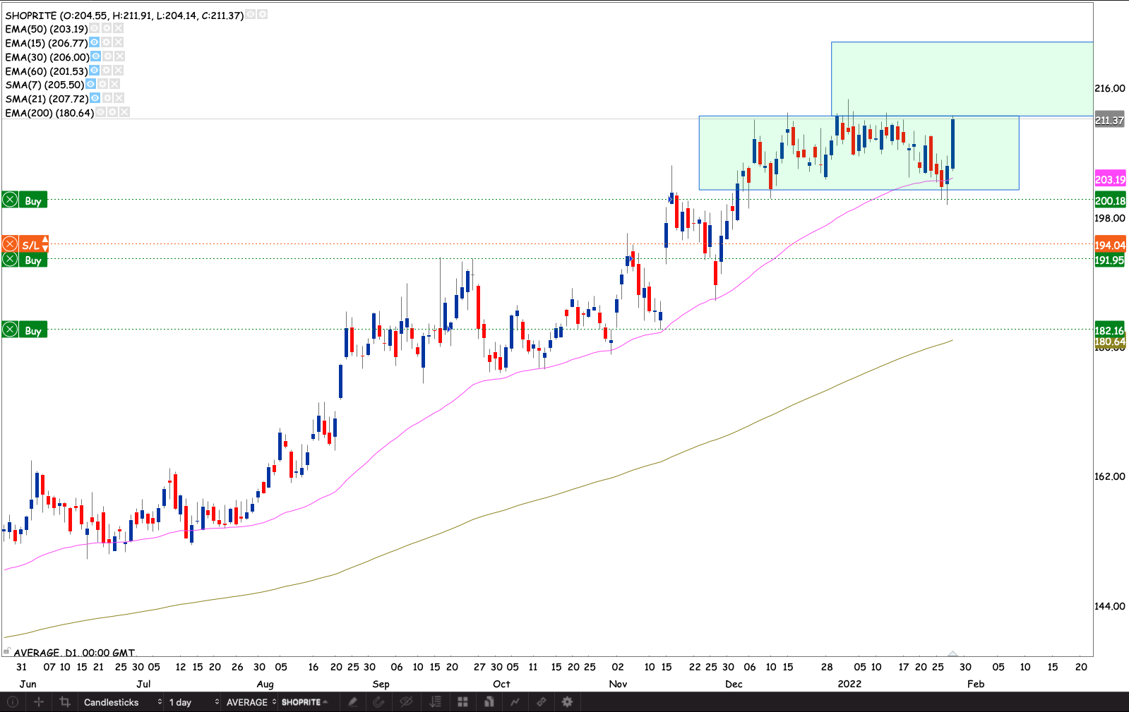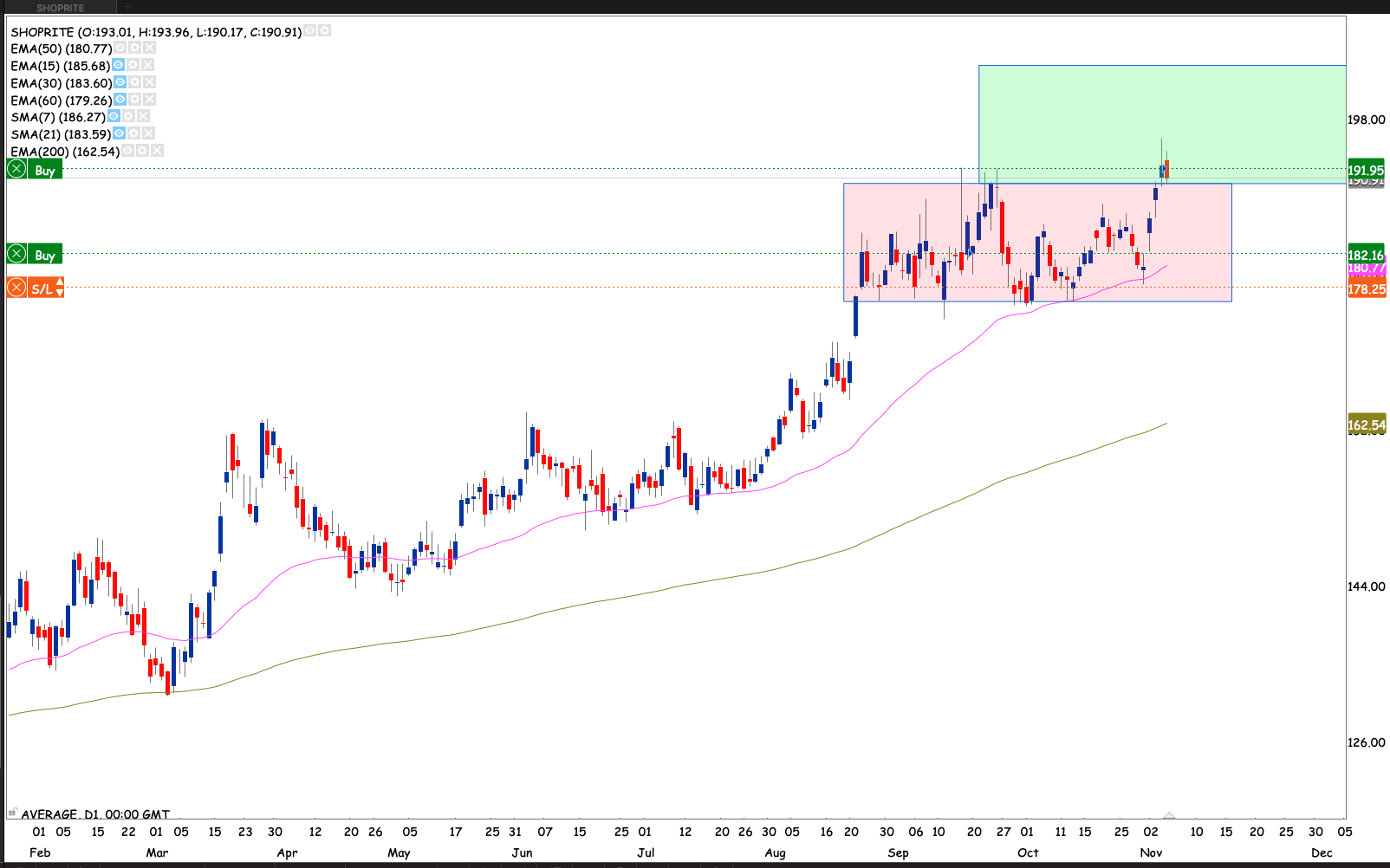 Shoprite moved to the higher box on Thursday. I raised my stop loss to R178 just below the 50 day EMA. The stock came to test the base of the new box and held it. We don’t know if it was on its way back and it was saved by the bell. Remains in the buy zone for a longer term hold. The stock broke out at a long term base.