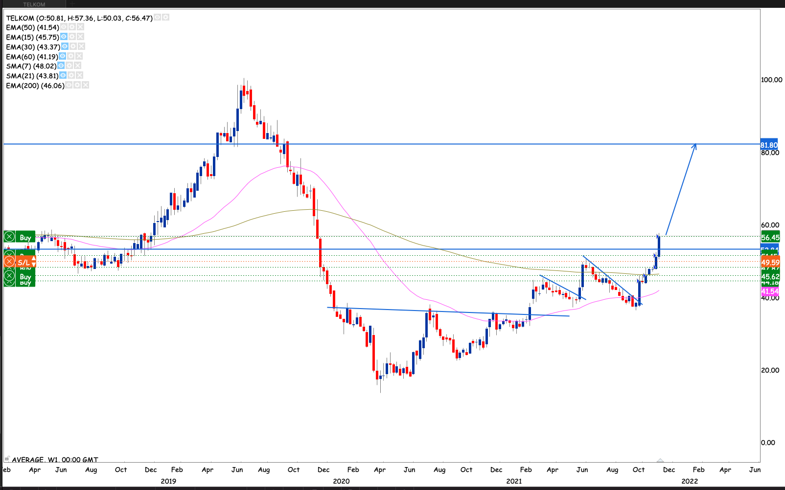 The stock had a strong bullish break showing the 200 week EMA some tail lights. I have a target at R81 with a stop loss at R49.60. The target will take an age to get there but looks like a target the stock can easily reach.