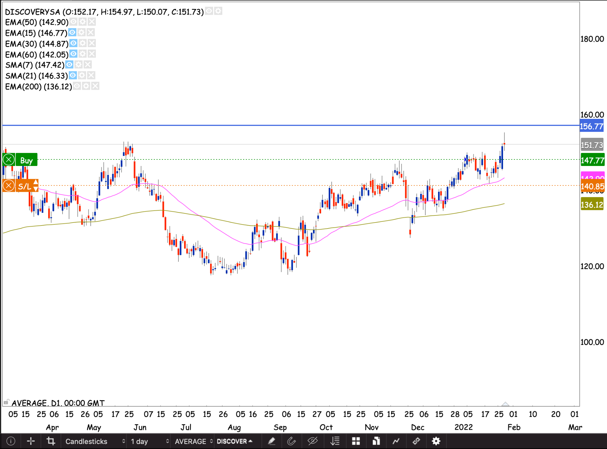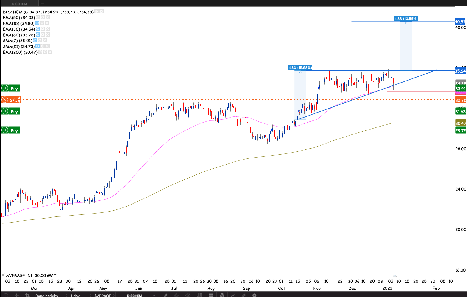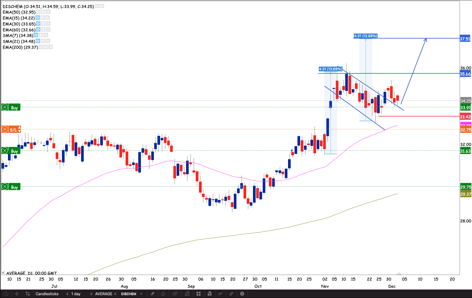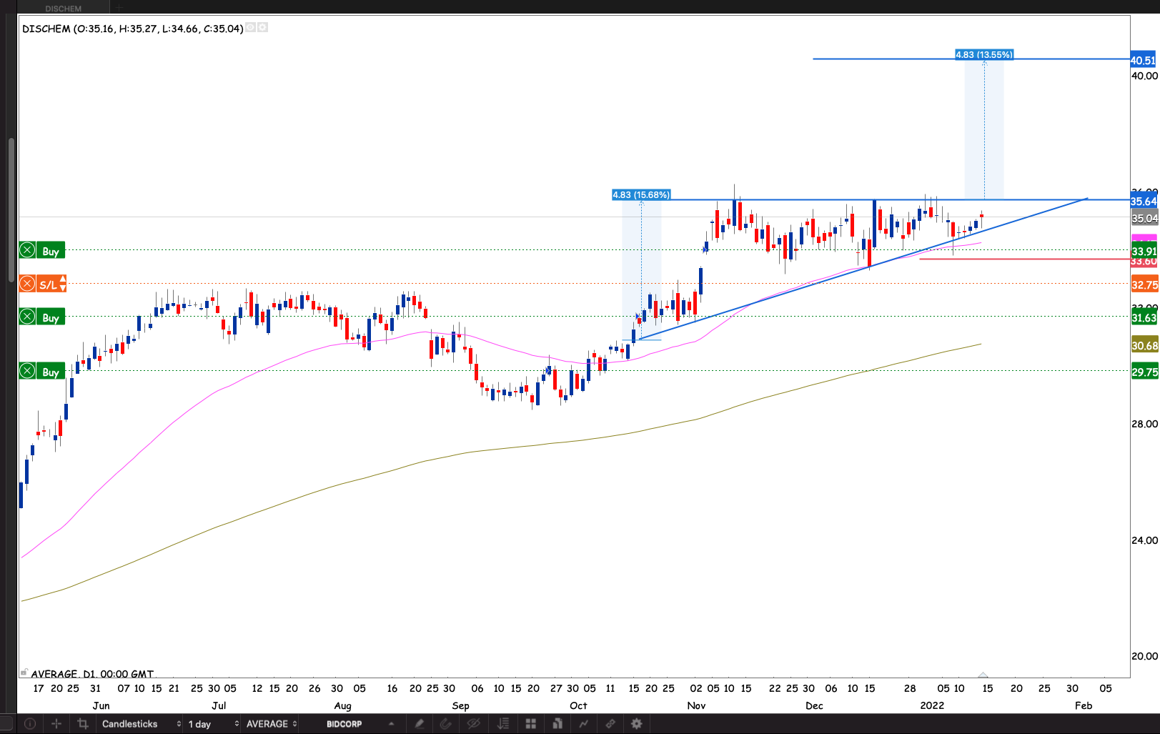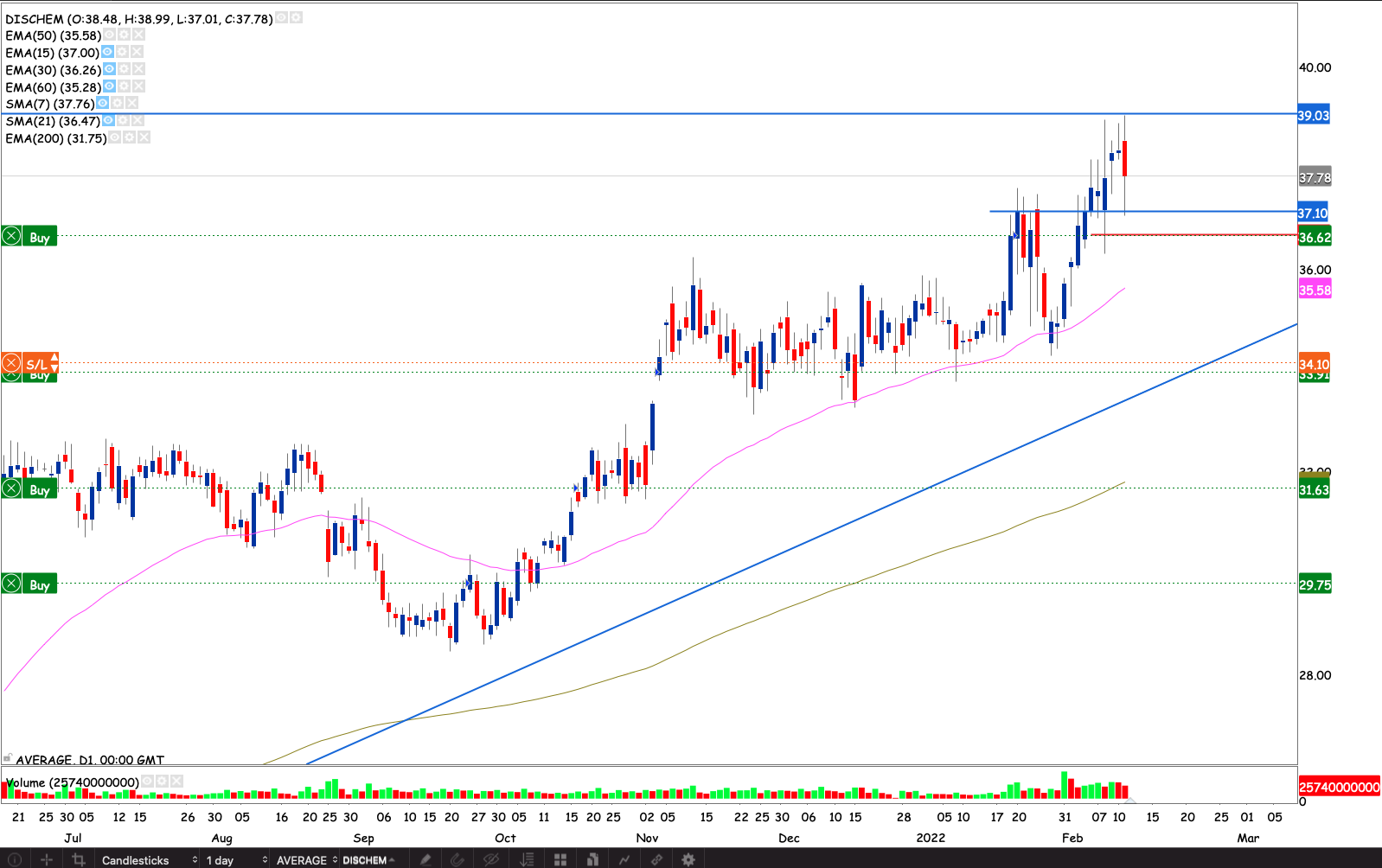 I like how Dischem is moving at the moment. There’s an old resistance at R39 which seems to hold so far. We last saw these prices in 2018. If the market can break above R39. I will raise my stop loss to R36.62 and add to the position.