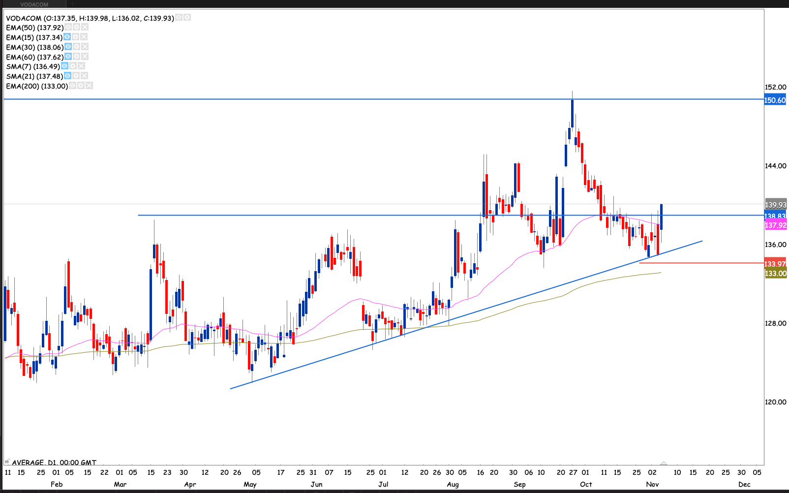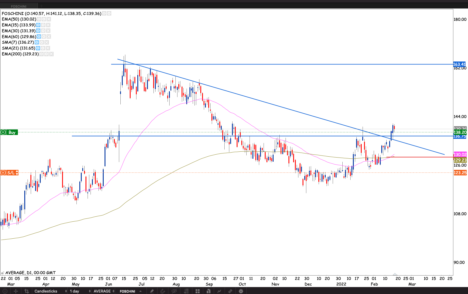 The stock re-broke the R138 resistance after violating from above Only to hold the support of the up trendline. The stock is back above the 50 day EMA. I will rebuilding my position in the stock with an initial stop loss at 133.90
