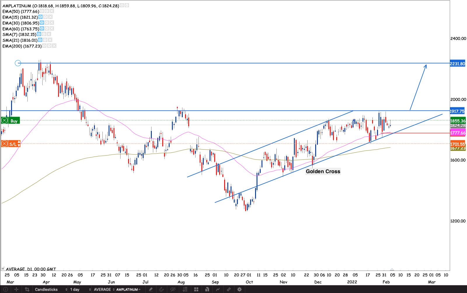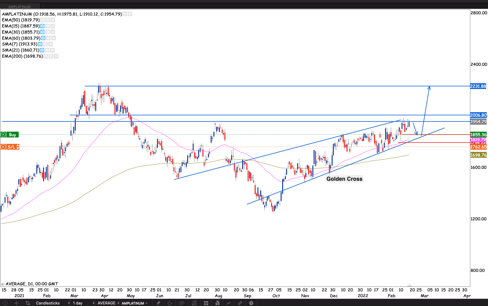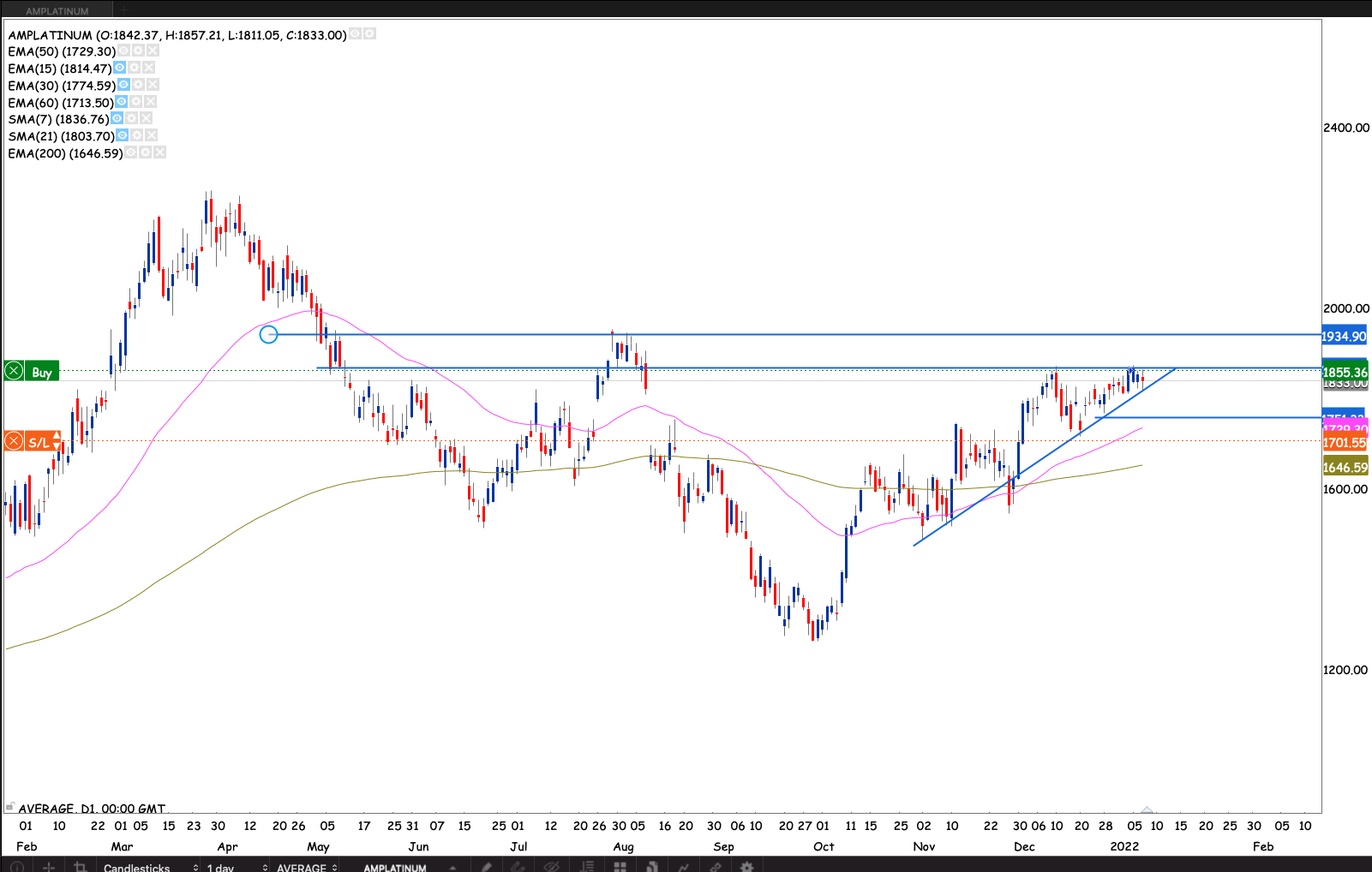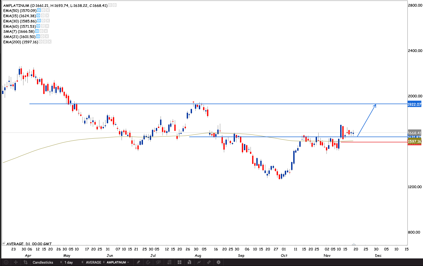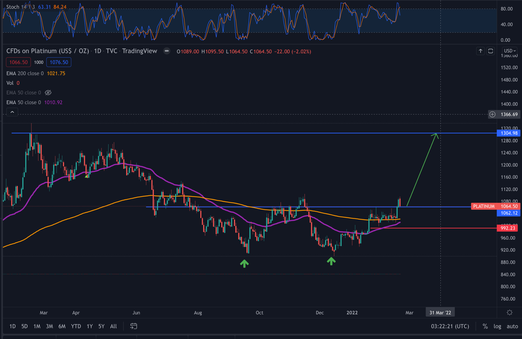 Resources prices have been rising recently. Platinum showing a double bottom reversal pattern. Bouncing off the 50 200 day EMA.The first breakout was from a cup and handle pattern we could see the metal run to $1304 with $992 risk point.