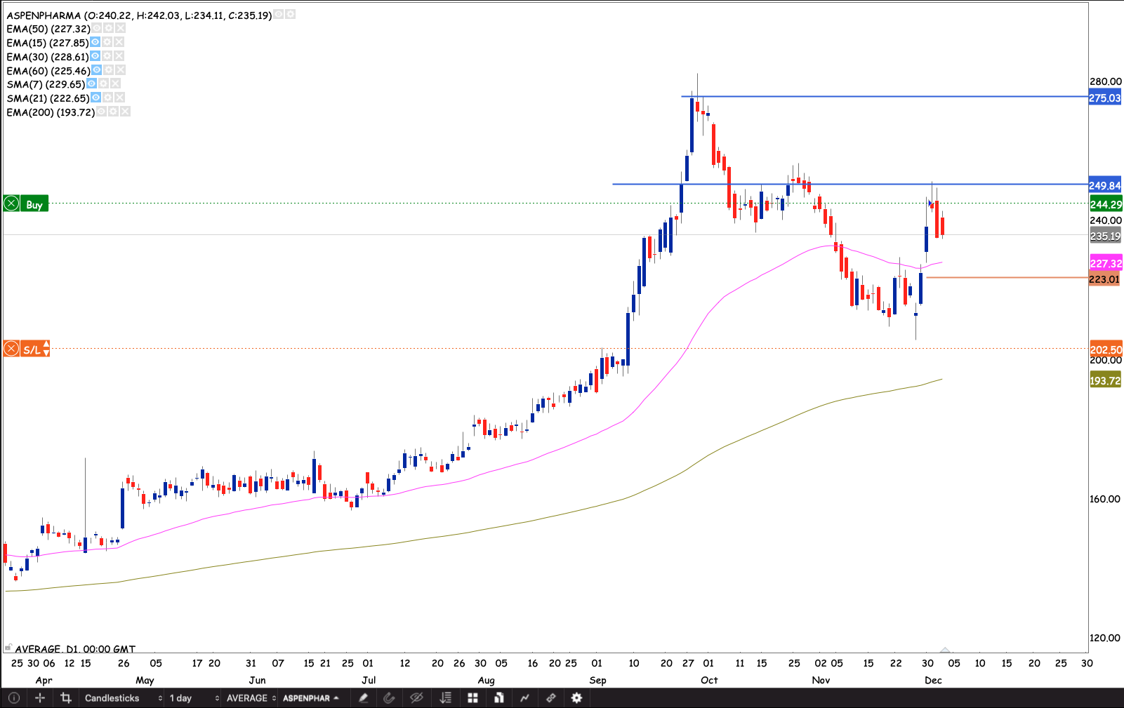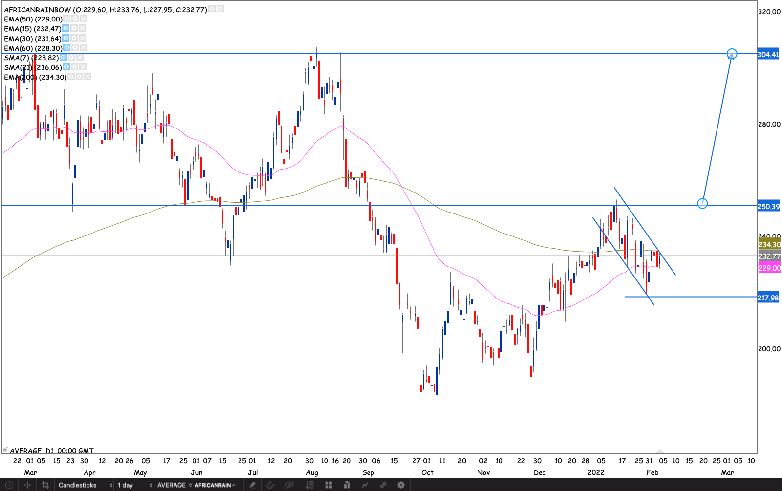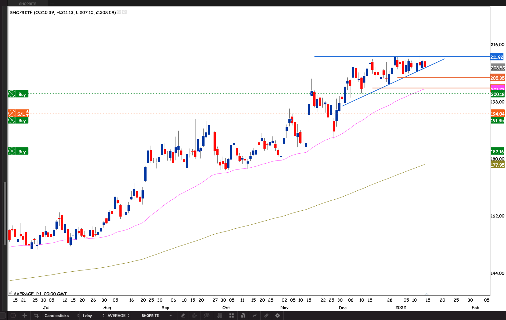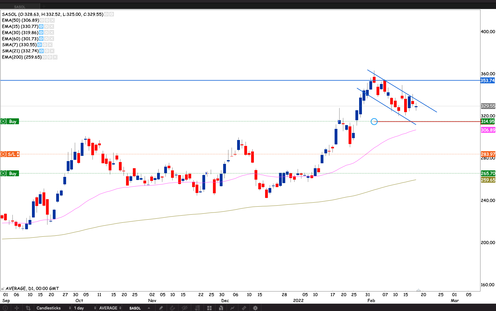 Aspen looks like it’s forming a head and shoulders pattern. We might see it test the 50 day EMA before breaking the R250 neckline. For the R275 target.