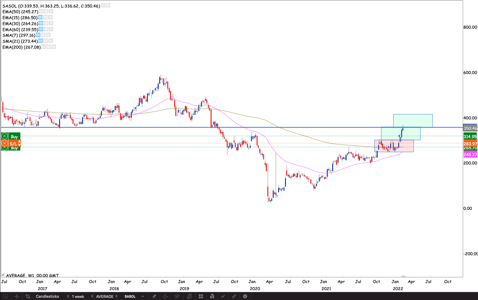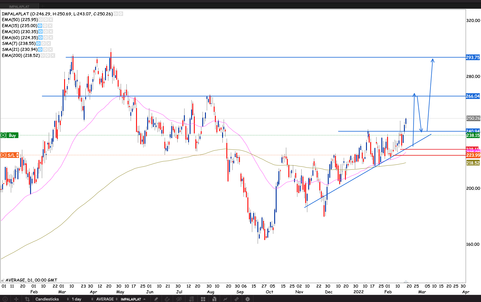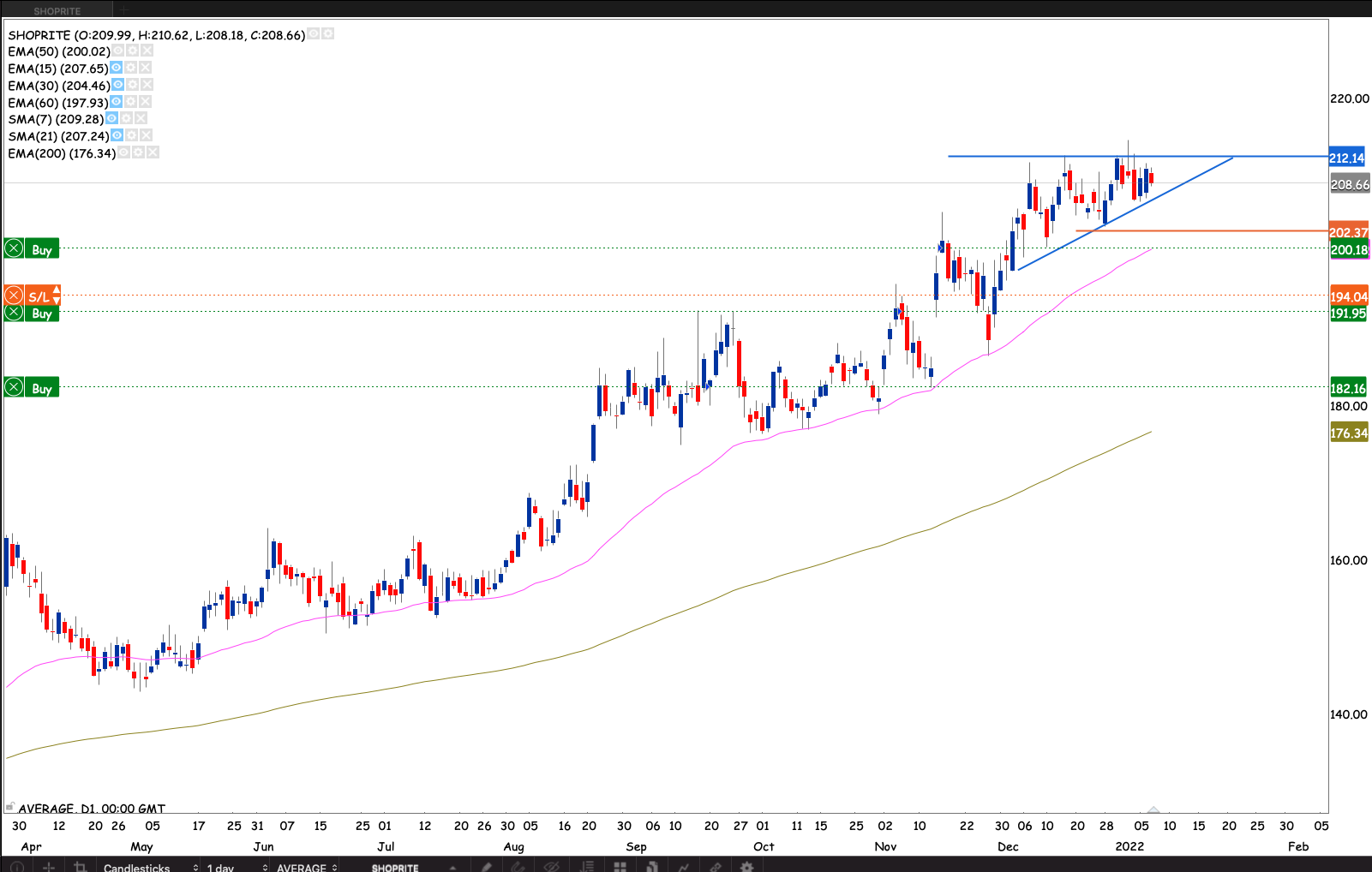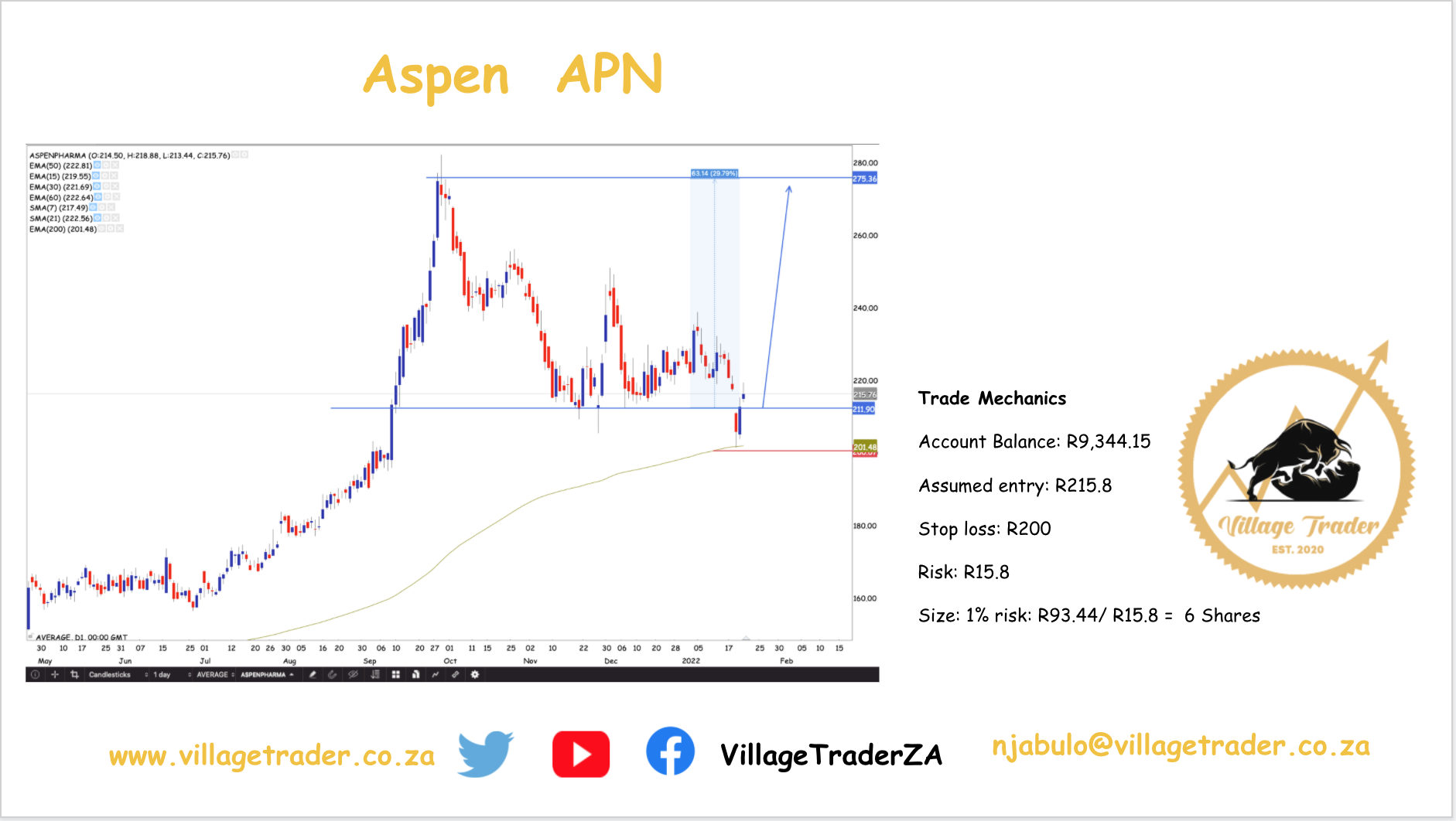Aspen looks like it’s forming a head and shoulders pattern. We might see it test the 50 day EMA before breaking the R250 neckline. For the R275 target.