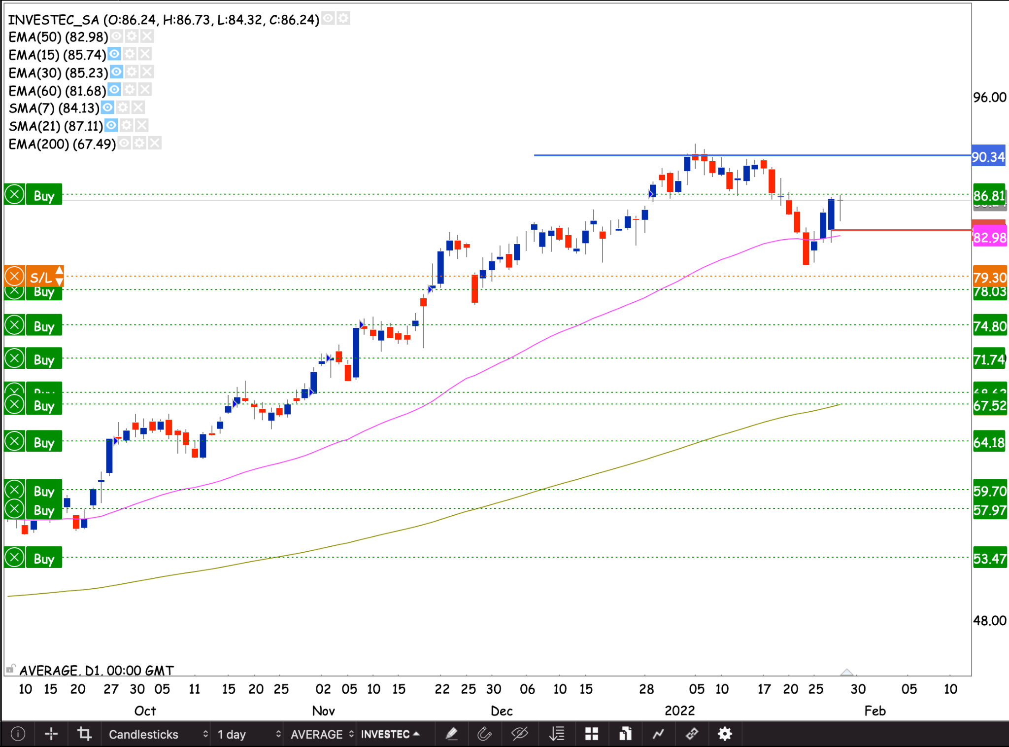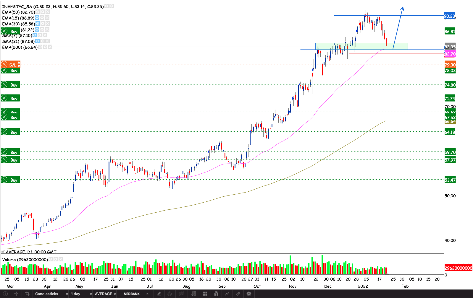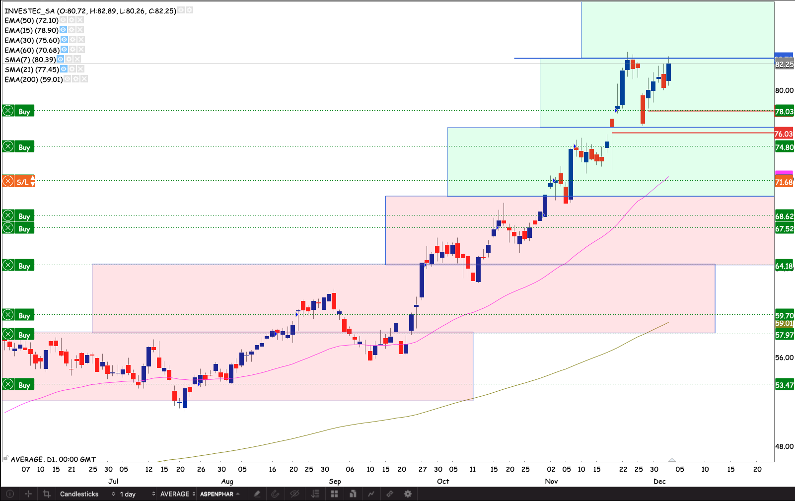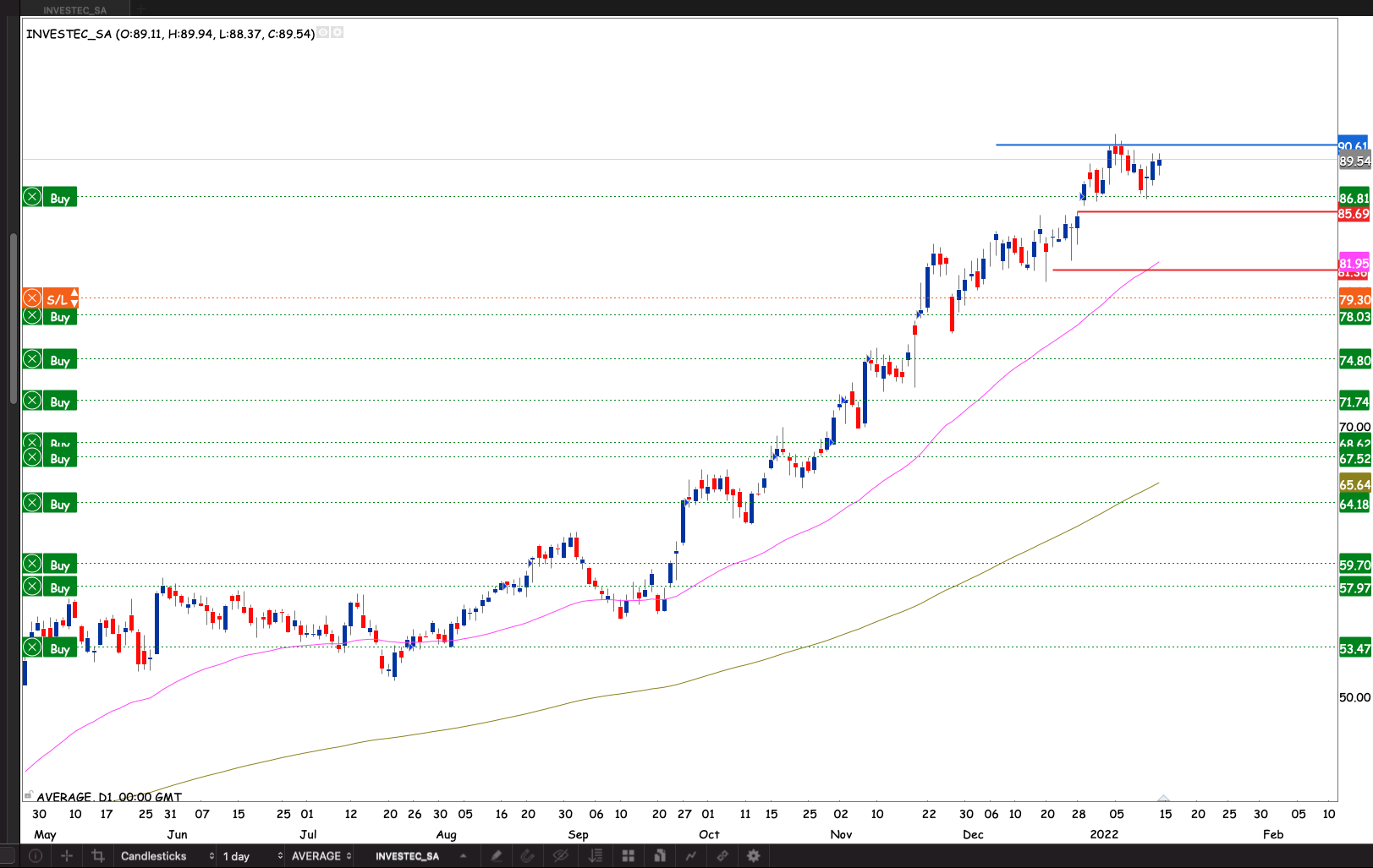 Investec looks well poised for a new high box to continue making new highs. Waiting for a close through the R82.80