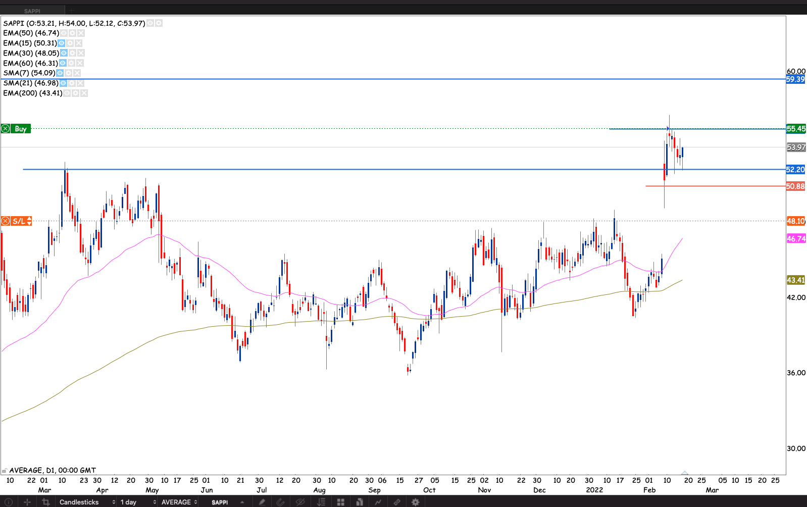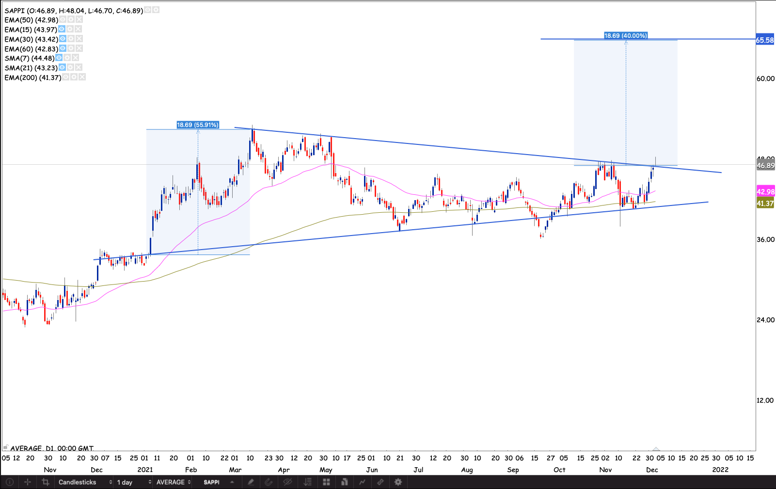The stock has been forming a symmetrical triangle pattern. Looked it was going to a make a new high relative high close, but closed with a bearish looking candle. Struggling to break out. If we can get a closed above Friday’s close I will start building up a position on Sappi