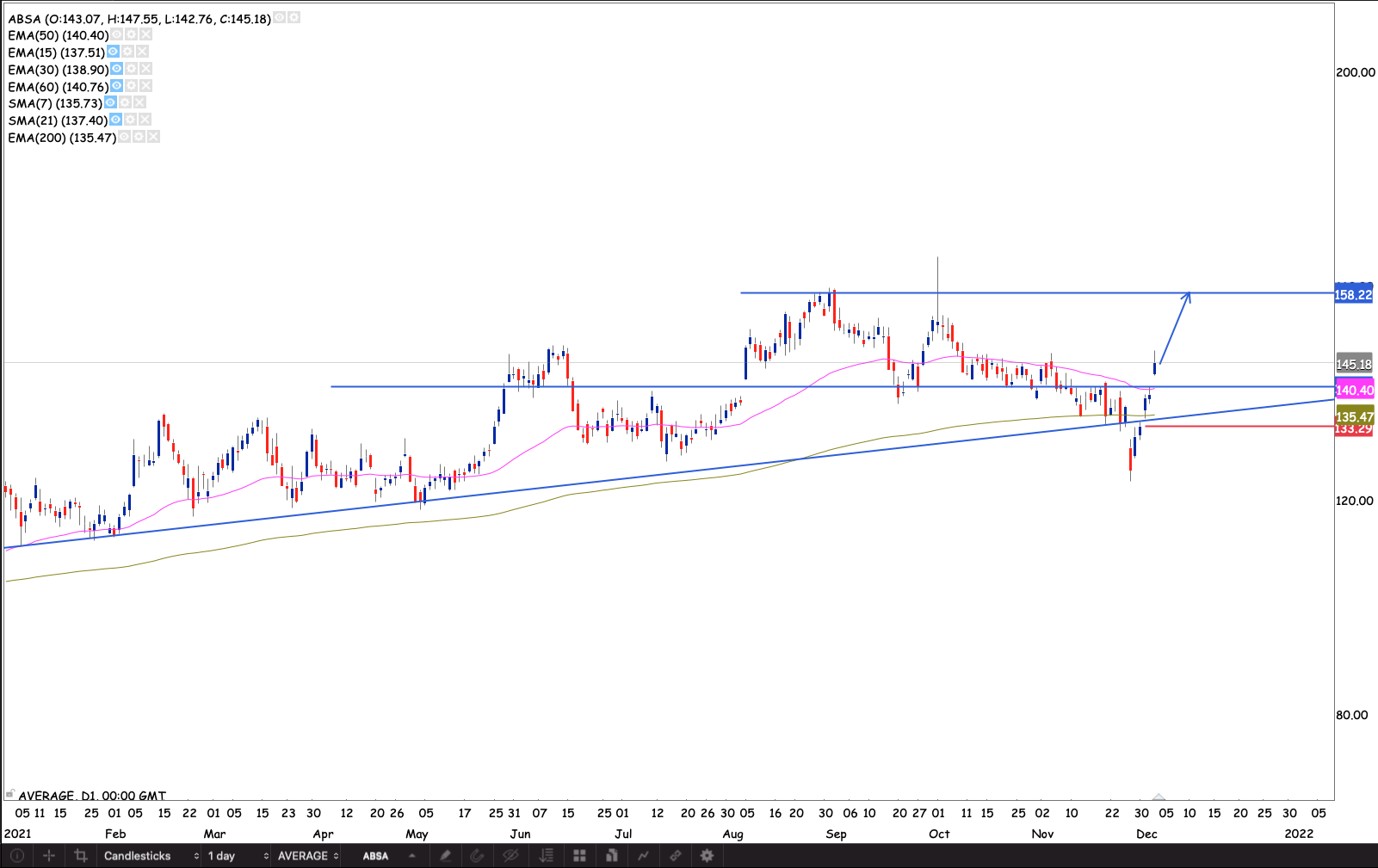 Absa gaps and drives strongly on Friday jumping back above the 50 day EMA. Triggering a buy, I will start building up a position with an initial stop loss at R133.25. Putting on a 1% risk