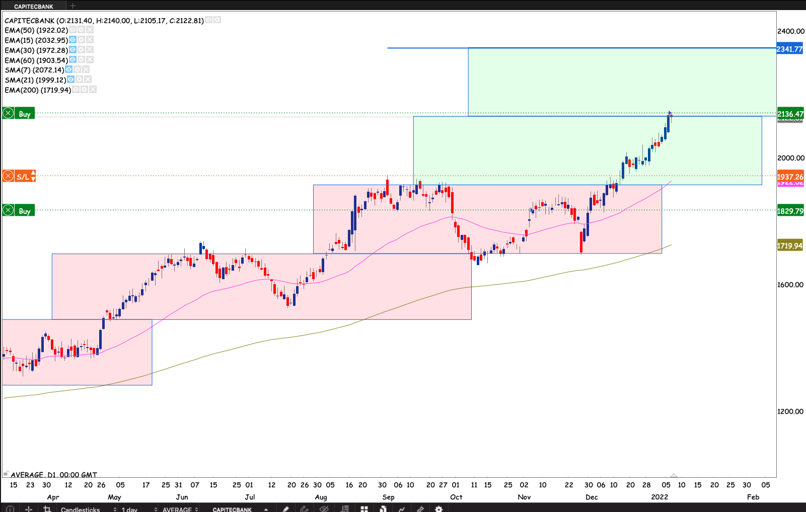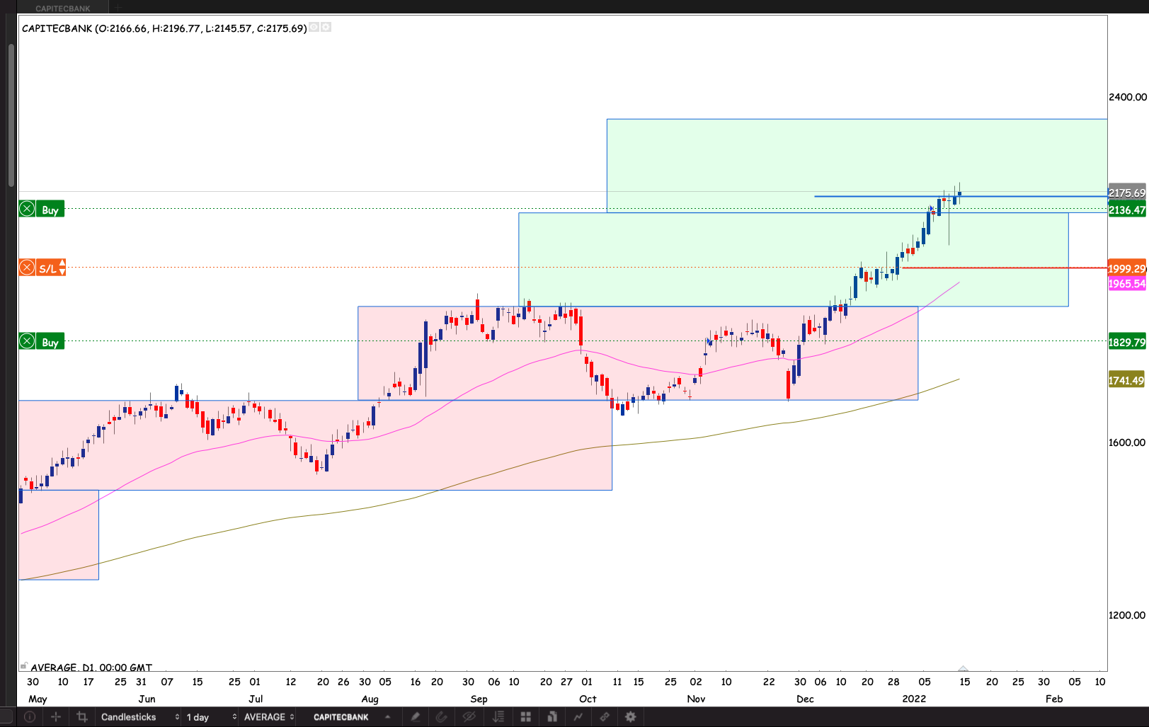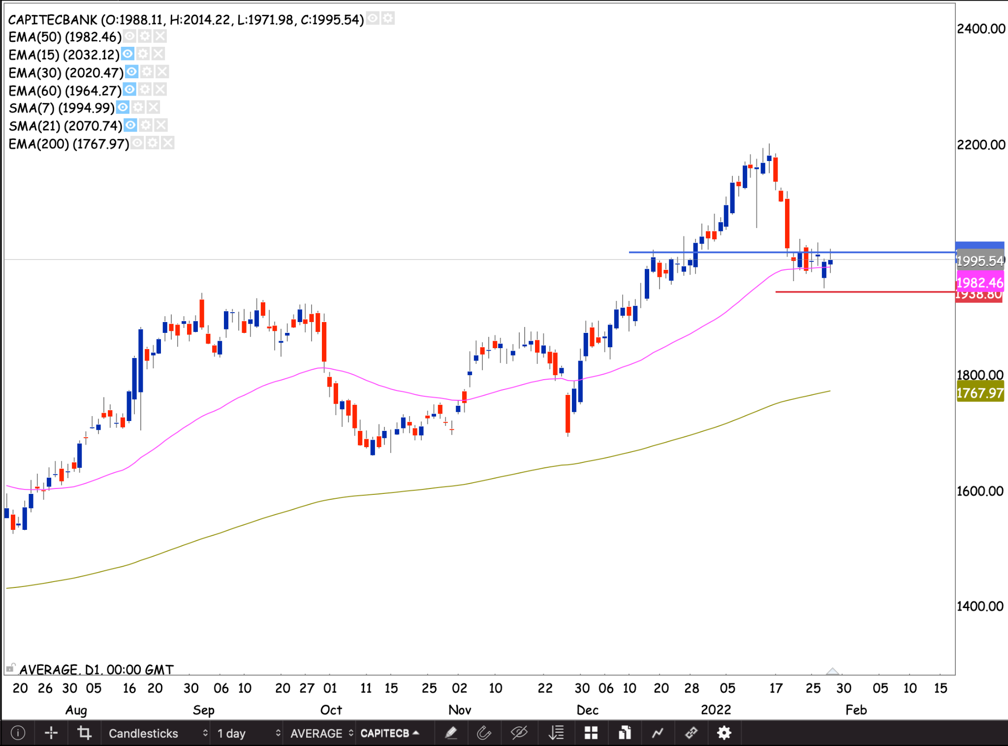 Capitec moved to a higher box on Thursday only just. The boxes are quite wide which makes it slightly harder to effectively hide the stop loss. However the banks started the year moving strongly together which is a good sign for a bullish run in all of them. I will be waiting for the R2341 top of the higher box