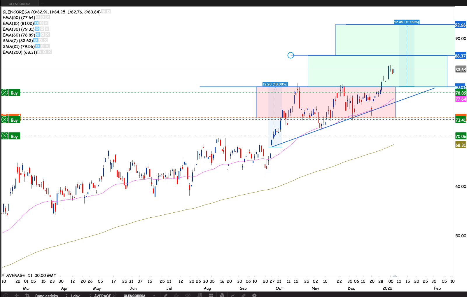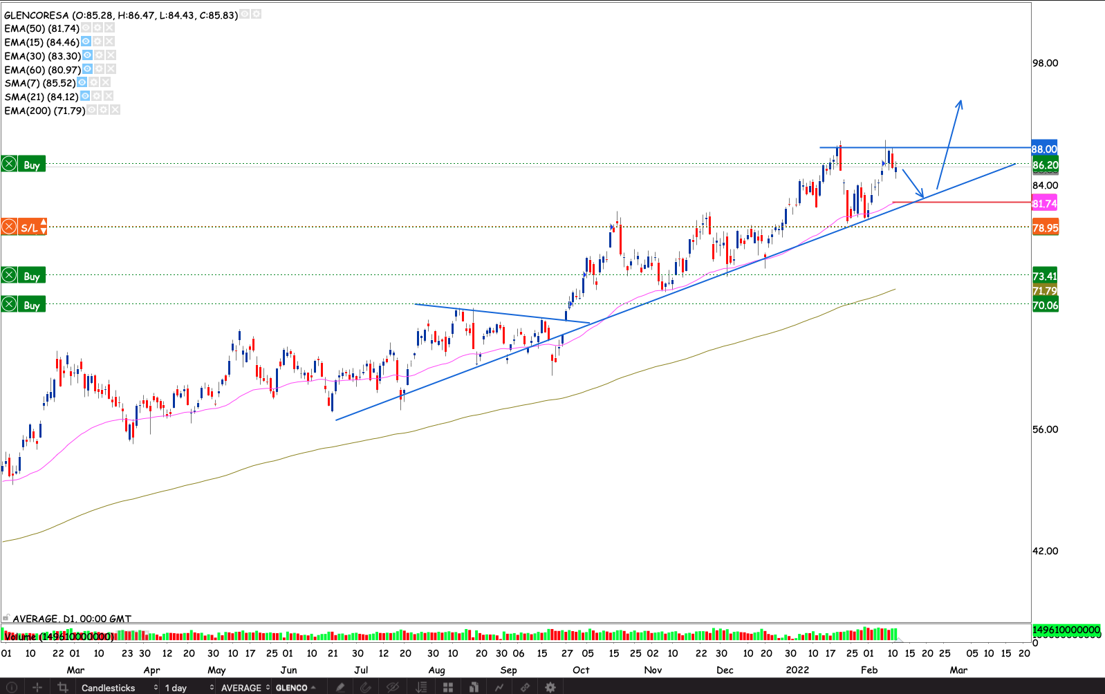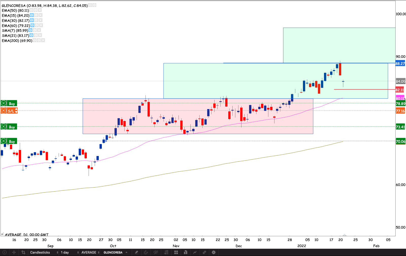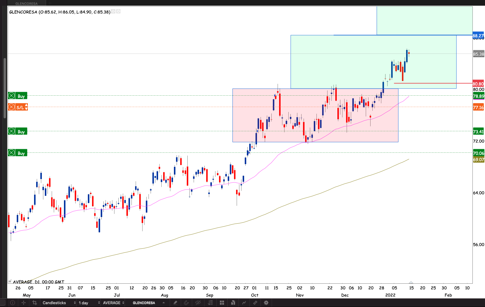 Looks like gonna to step on the brakes a little bit on Glencore. Anticipating a pull back to the 50 day EMA. Before breaking R88. With commodities and resources as a group looking bullish. I expect the stock break through R88